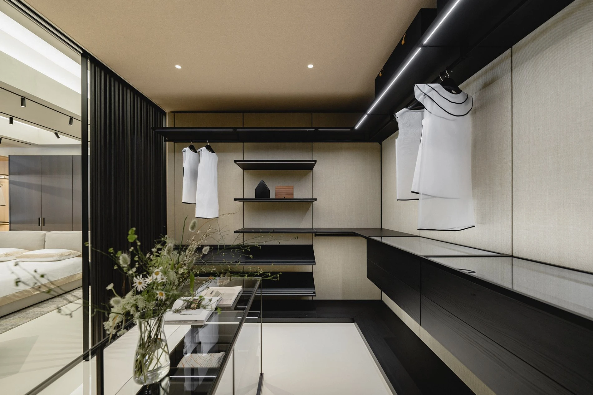 On the background, through Glide Shanghai sliding partitions featuring heat treated oak slats, the Boiserie Storage in black sugi melamine with a straw backdrop is a solution midway between the minimalism of the walk-in-closet and the wardrobe, combining interior vision and warmth of the panelling. In the middle of the room appears the Acquario glass drawer unit with burnished brass finishes, divided into 3 shelves and customizable with low height wooden trays that leave the contents visible.