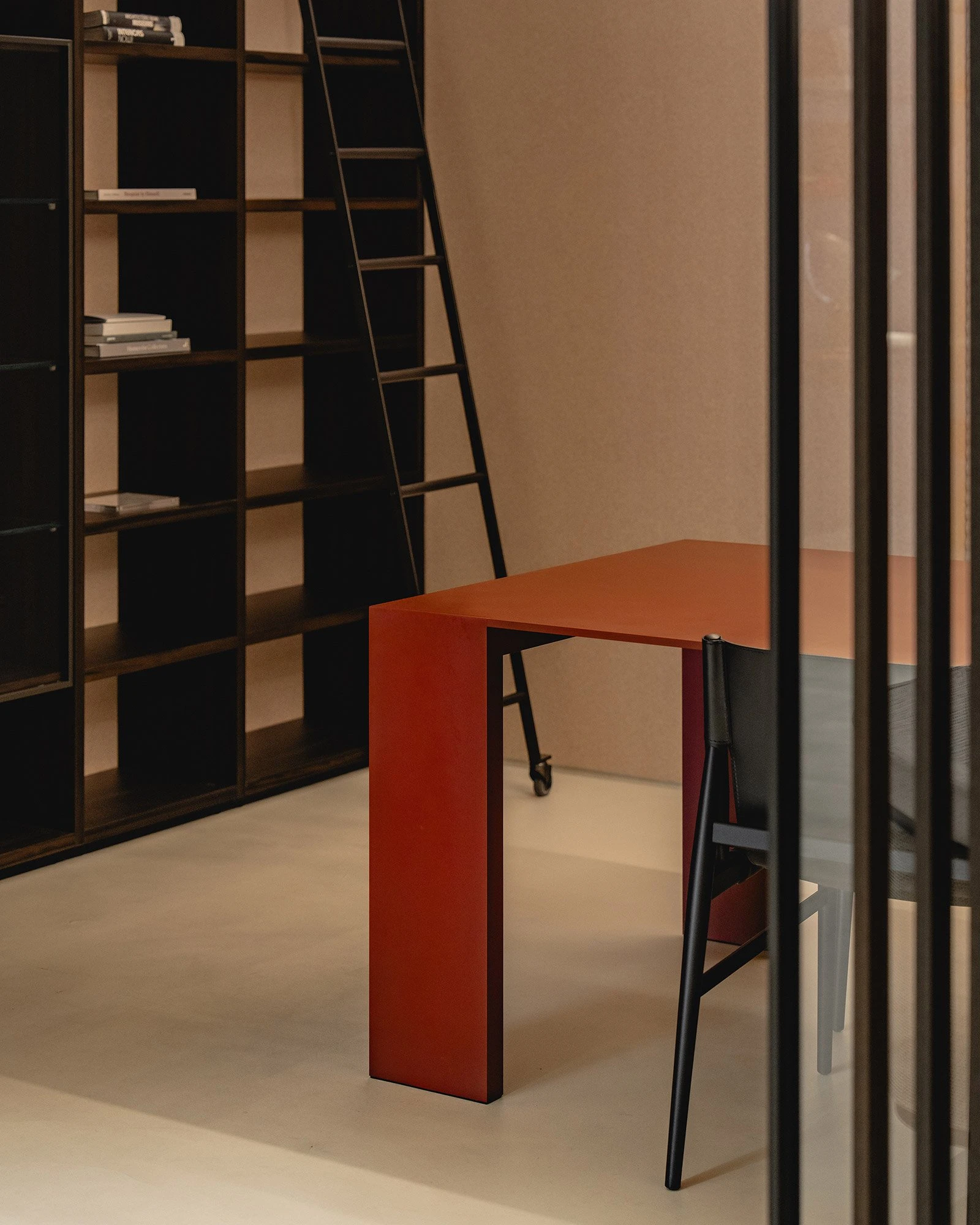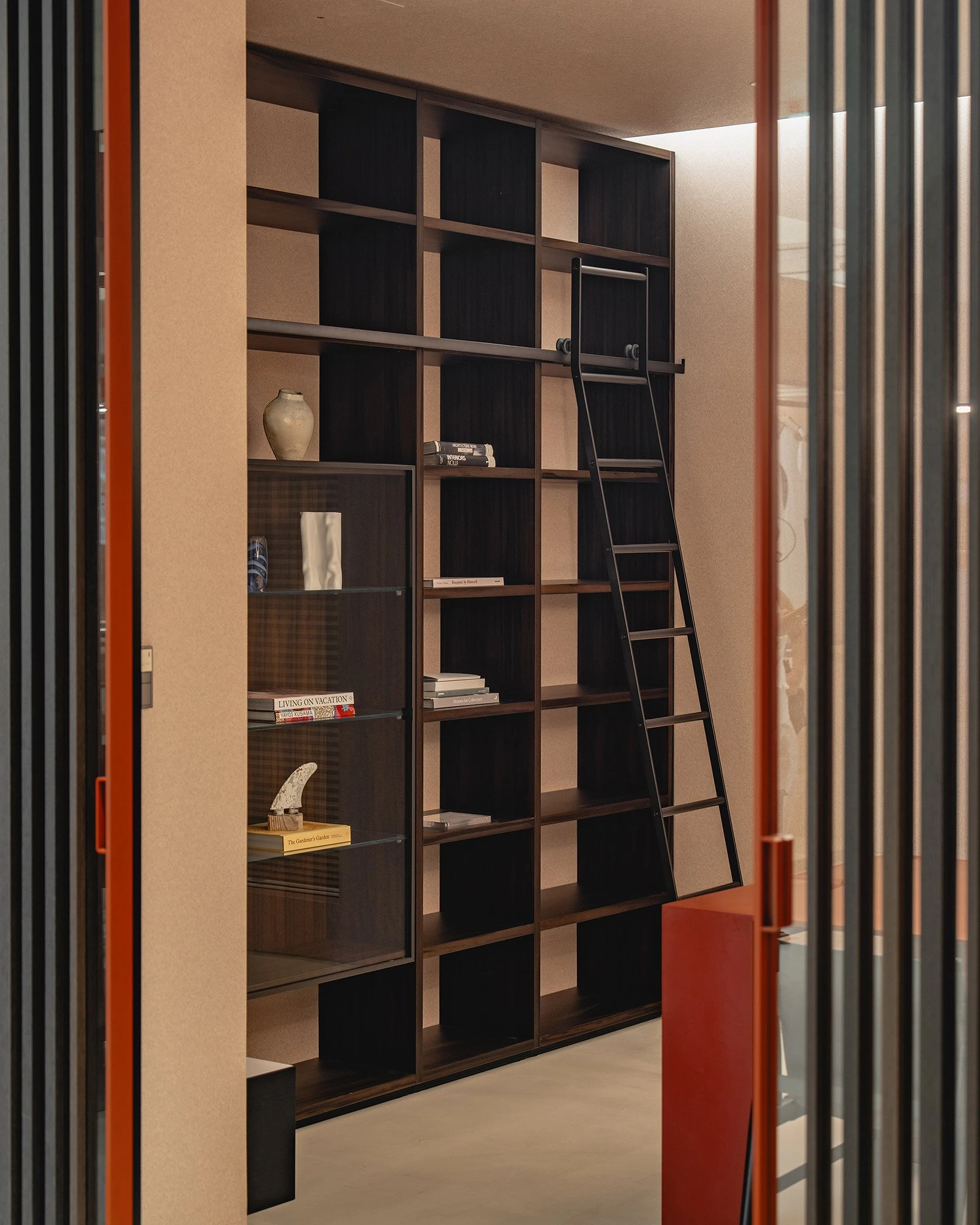 Besides the Glide Shanghai partitions with a rosso antico frame, a meeting room/office with a strong character features a System bookshelf in black river with a transparent glass cabinet, with Iron frame in the centre, to store the most valuable objects, highlighted by the new spotlights that can be freely adjusted in their position, completed by the functional ladder, giving rhythm to the space with its irregular layout.