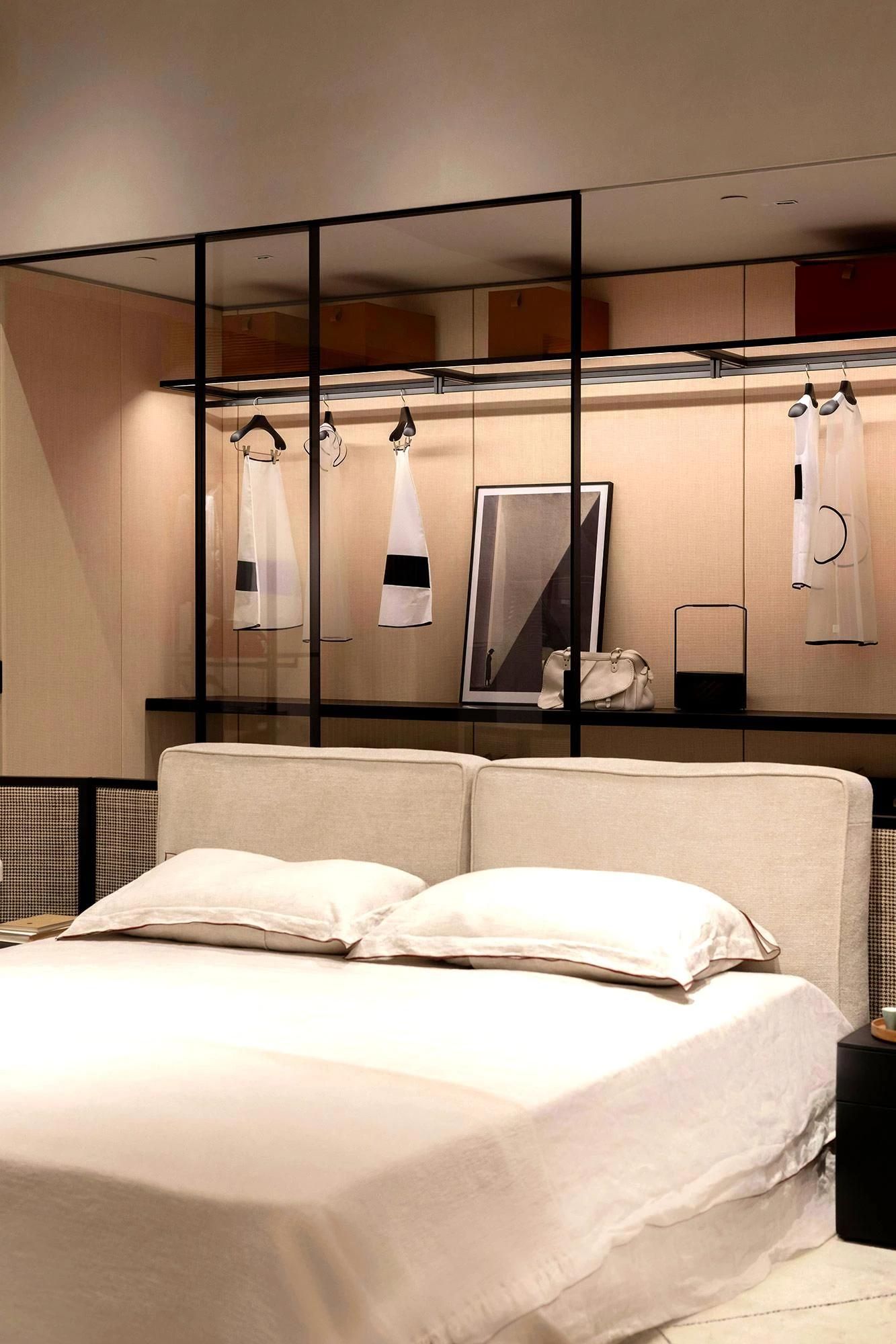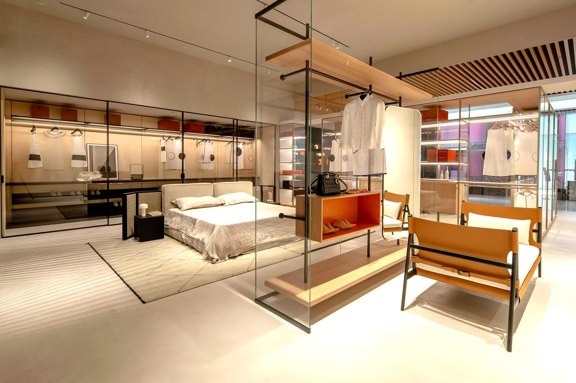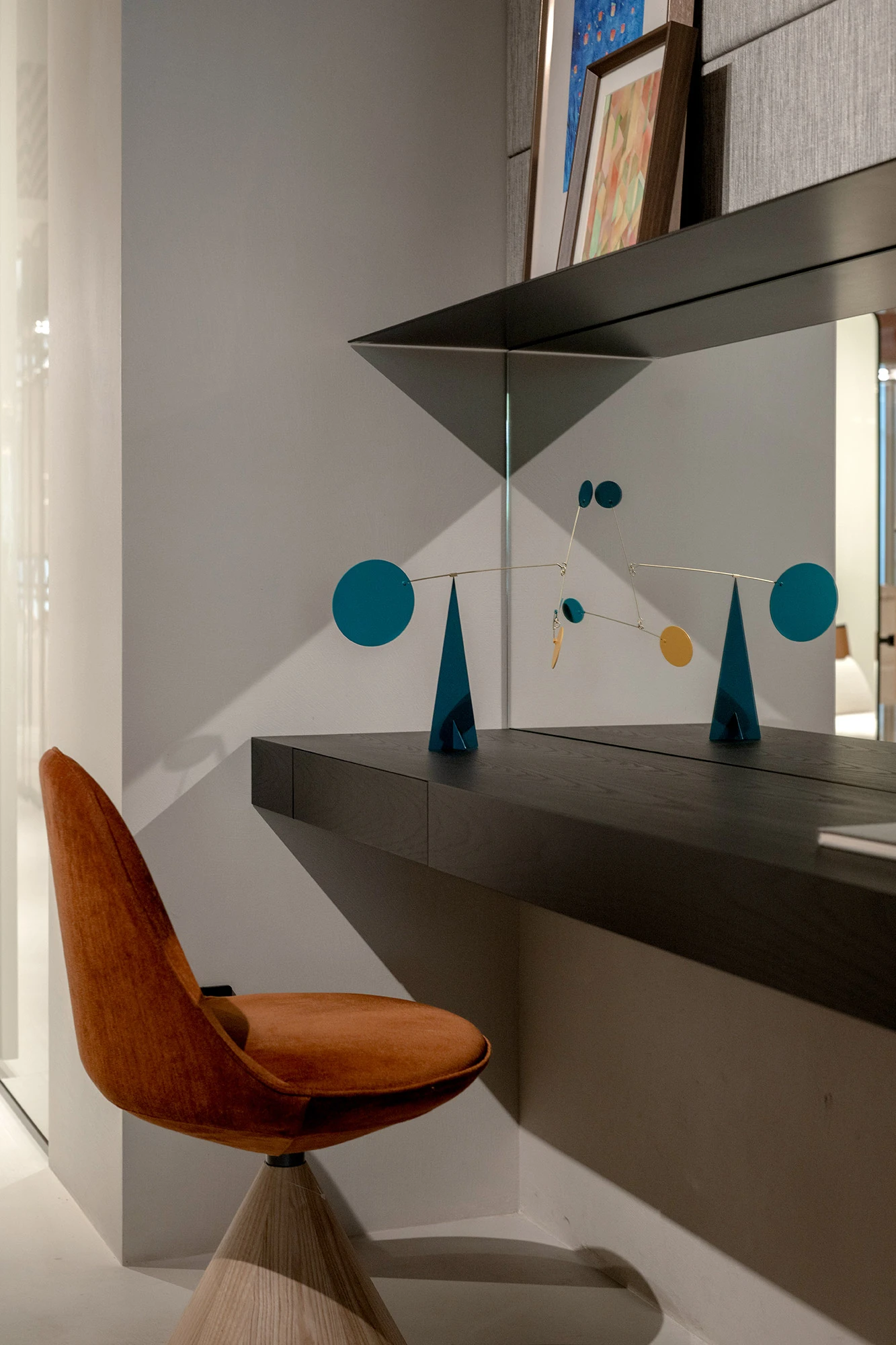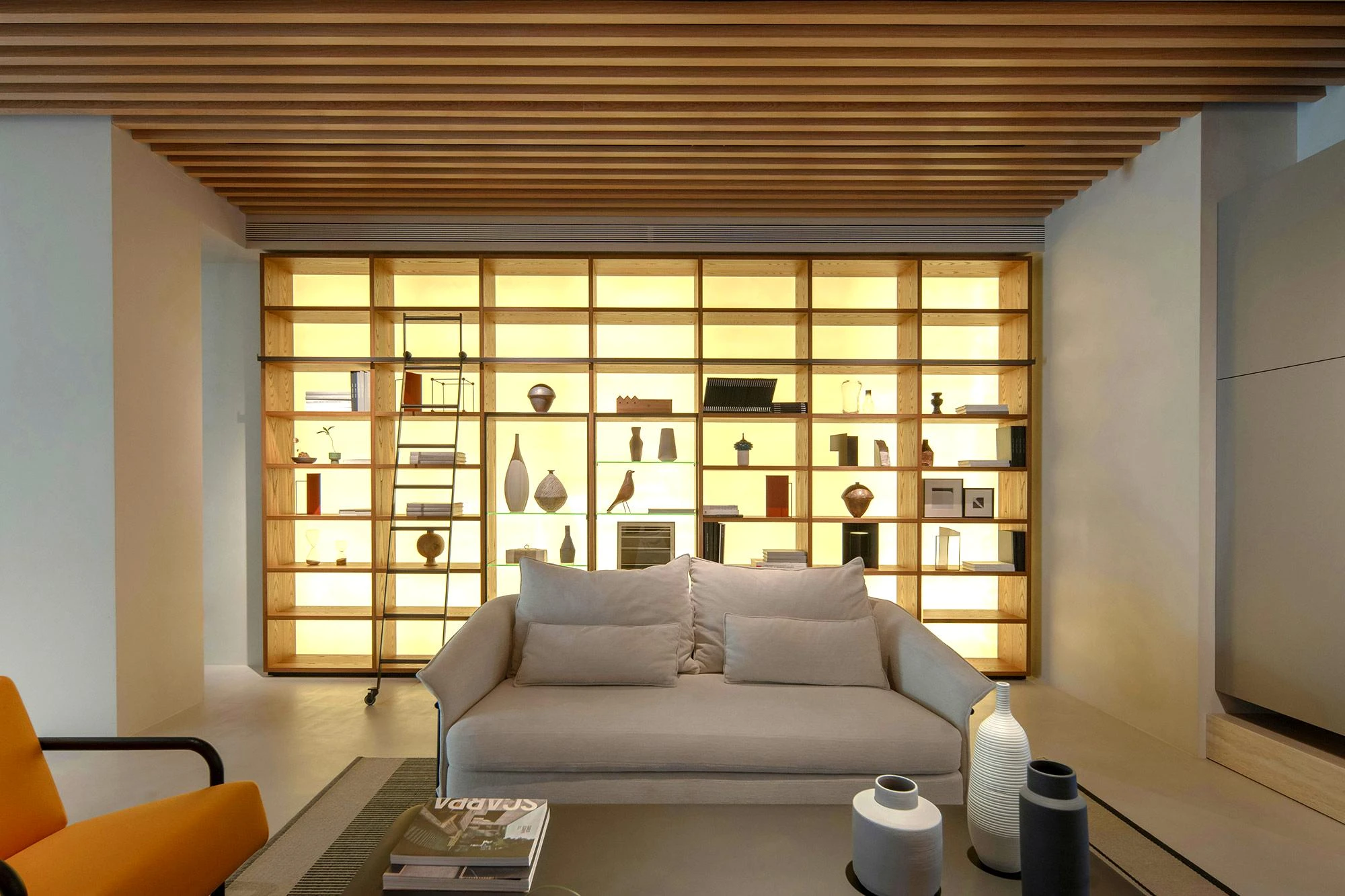 The showroom features a curated selection of the brand’s most iconic collections: from the reception area with the Materic Ovale table in milk-stained ash and Neve chairs, to the office space outfitted with the Load-it bookcase and the Modern and Gap systems. The bedroom and dressing rooms showcase premium materials such as white cherry wood, glass, leather, and black sugi, reflecting Porro’s design excellence and meticulous attention to detail.