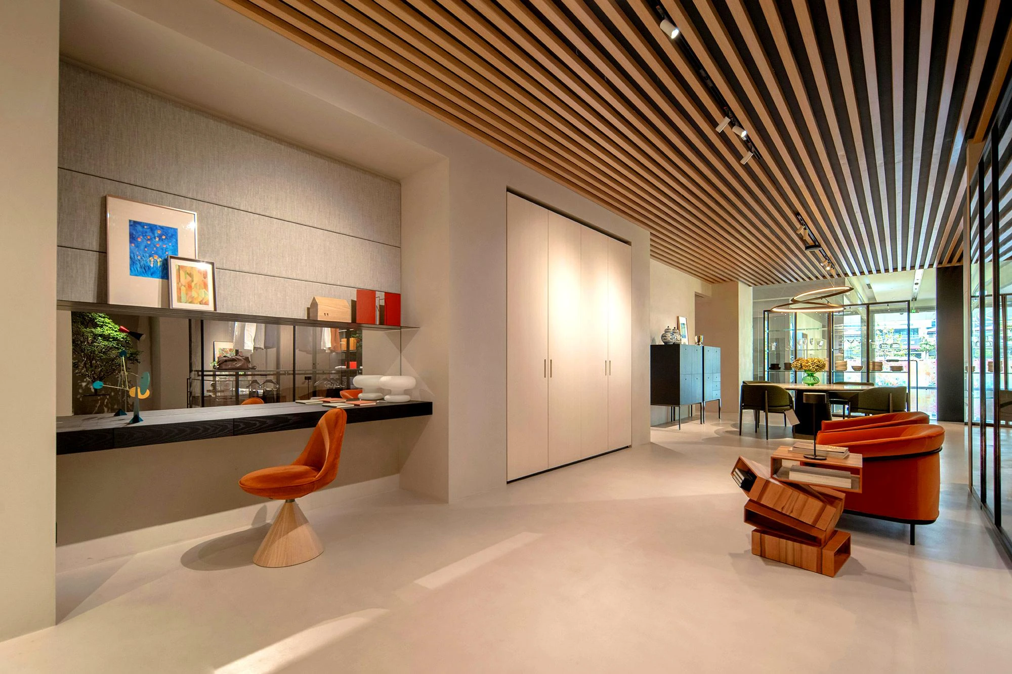 Porro continues to expand its presence in China with the opening of a new monobrand store in Ningbo — a historic port city now undergoing rapid development and strategically connected to Shanghai. Conceived as a large contemporary open-plan villa divided into nine thematic areas, the store welcomes visitors into an intense and refined atmosphere, defined by material contrasts, transparencies, dark woods, and bold red accents.