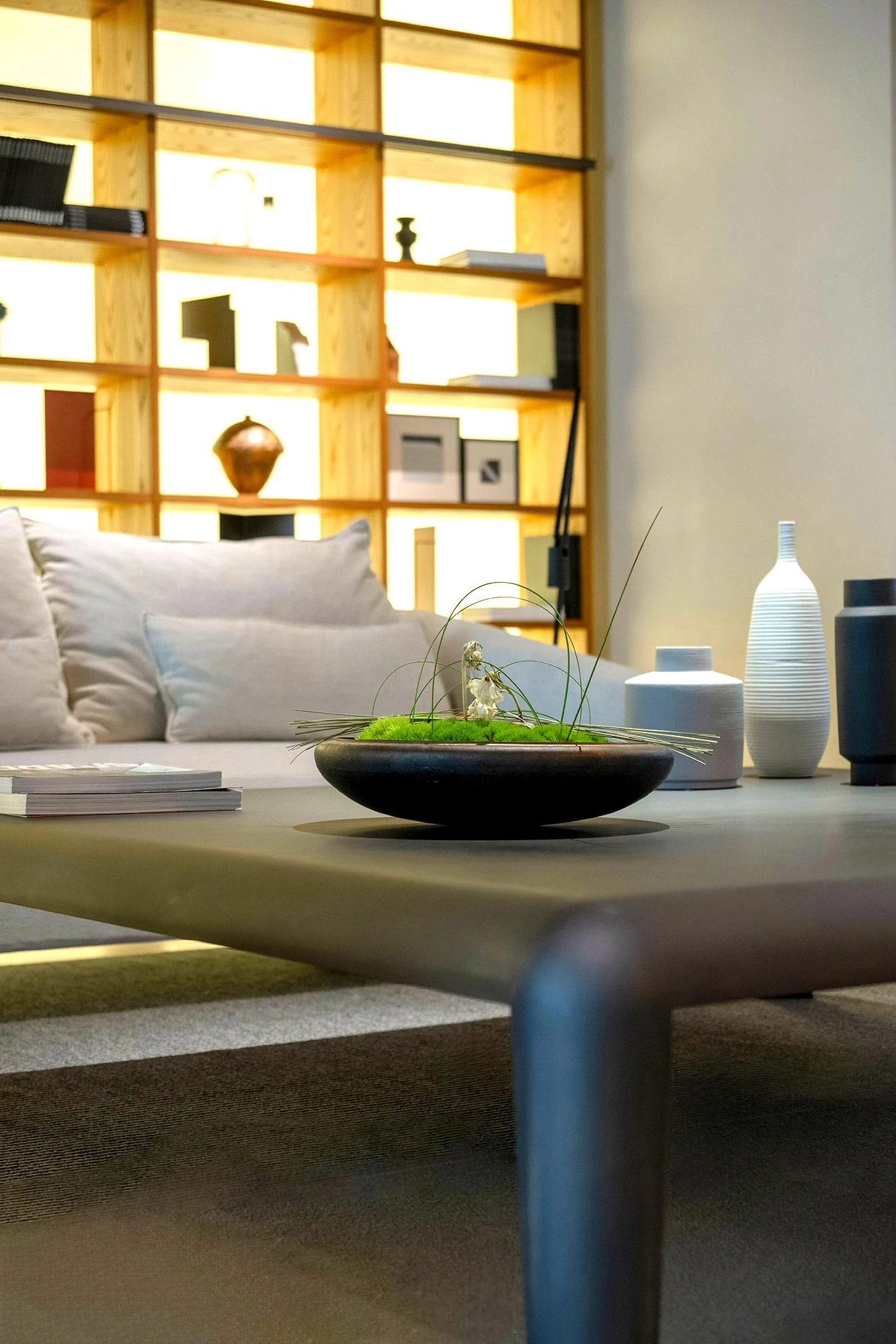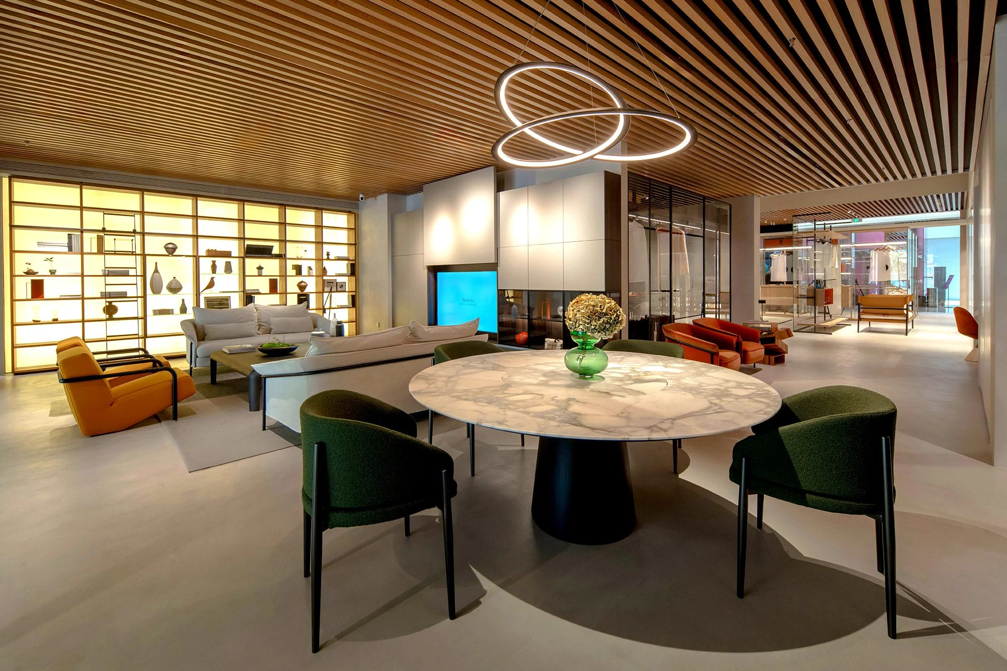 The layout also includes spaces dedicated to relaxation and conviviality: the Traveller daybed, the Boutique Mast system, Kite and Lullaby armchairs, and the System and Modern storage solutions—all blending functionality and aesthetics. In the dining area, the Materic table in green Calacatta marble and the Offshore sideboards fully express the brand’s signature essential elegance.