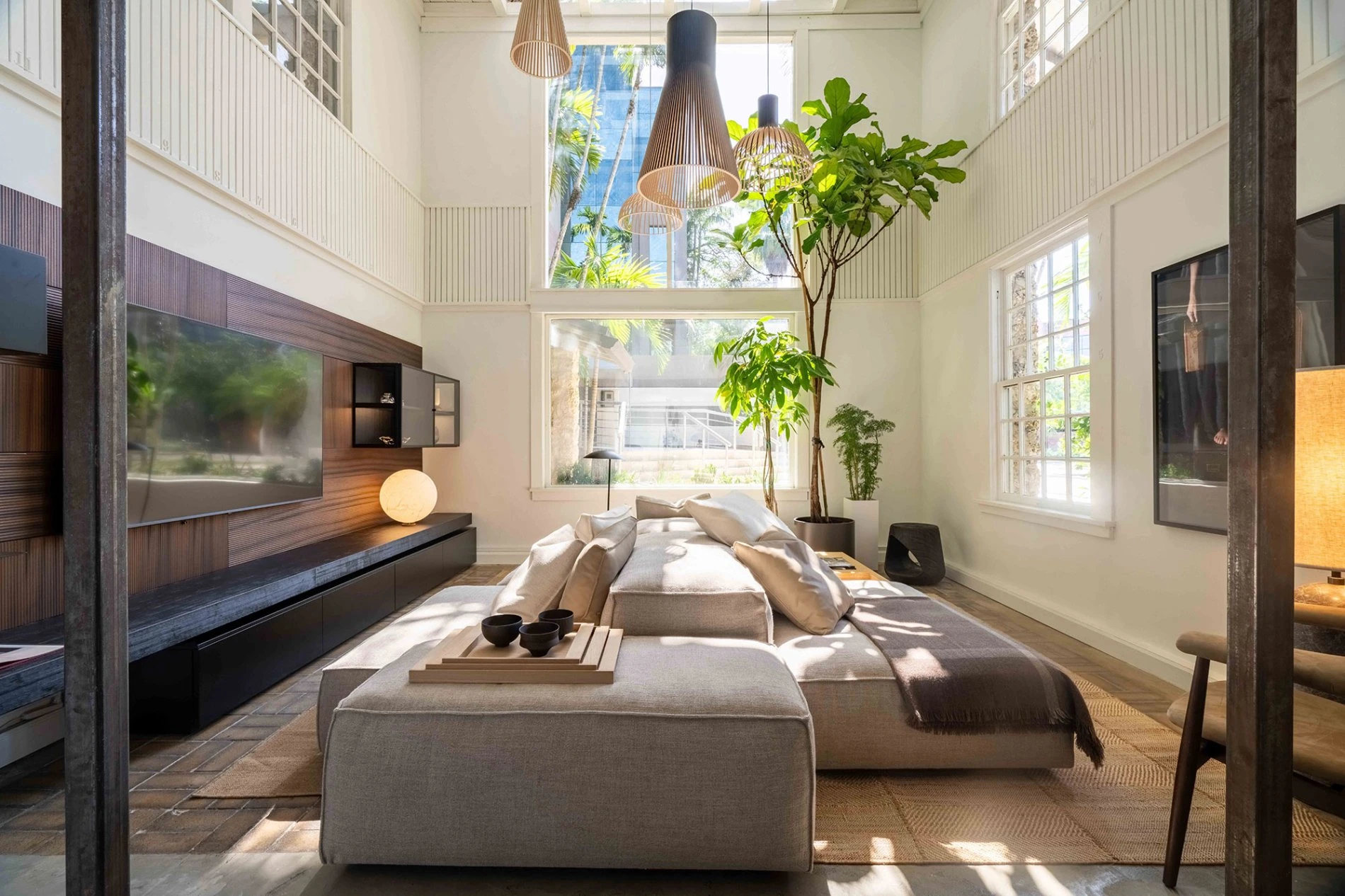 In the great room of the historic Gifford House, once the architect’s drafting room, the atmosphere is both grand and airy, enhanced by the double-height ceiling and exposed trusses. Completing the great room’s ensemble is a Modern + Load-it media wall composition by Piero Lissoni + CRS Porro, which exemplifies sophistication with its combination of wall paneling, shelving and storage cabinets. This system not only meets functional needs but also complements the room’s grandeur, making it truly complete and a testament to both form and function.