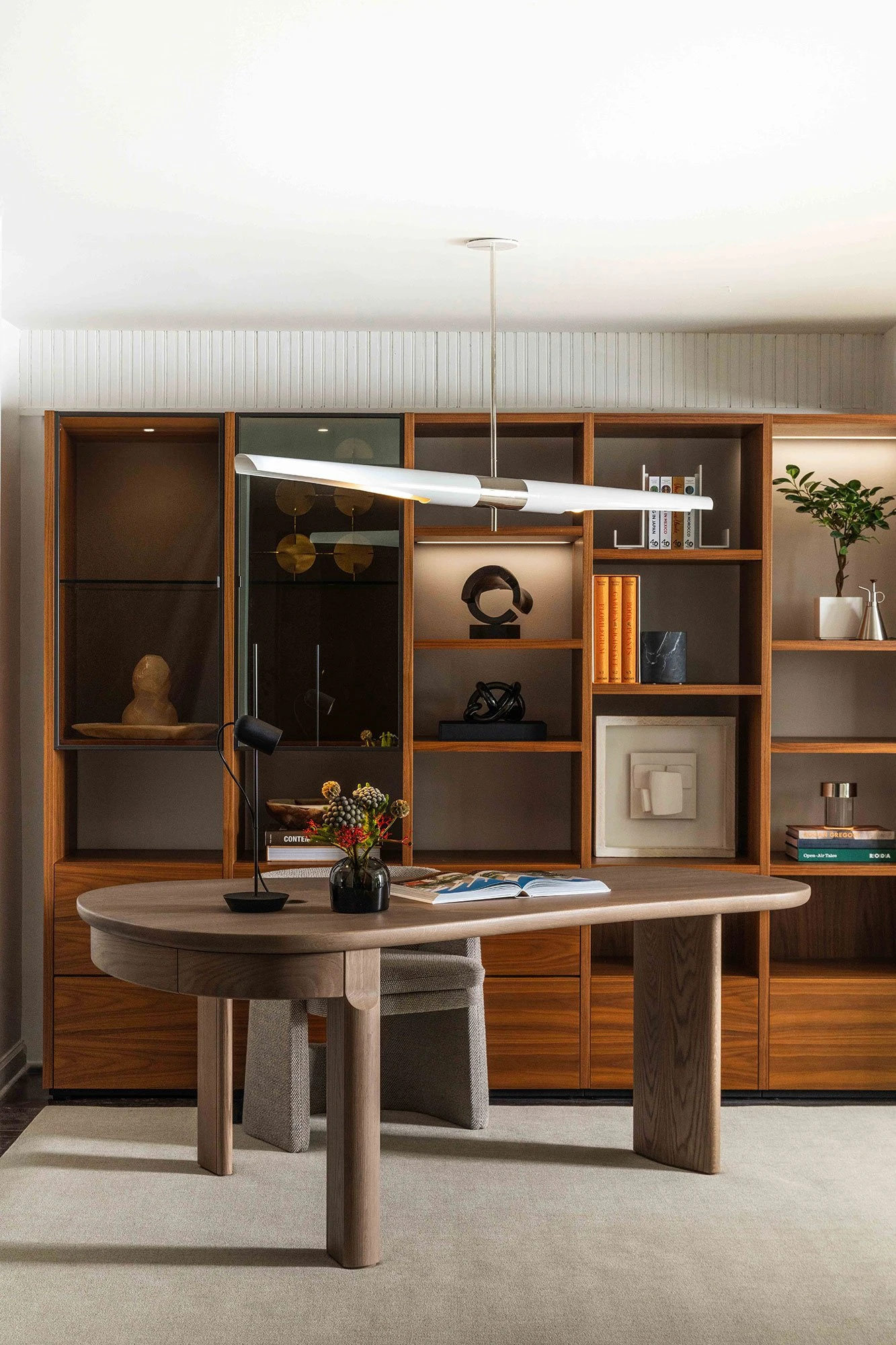 The study is perfectly tailored for working and collaboration: here the oval Jeff table by Gabriele and Oscar Buratti for Porro sways between minimalism and maximalism. Garda chair by Piero Lissoni and Modern cupboard complete the ambience.