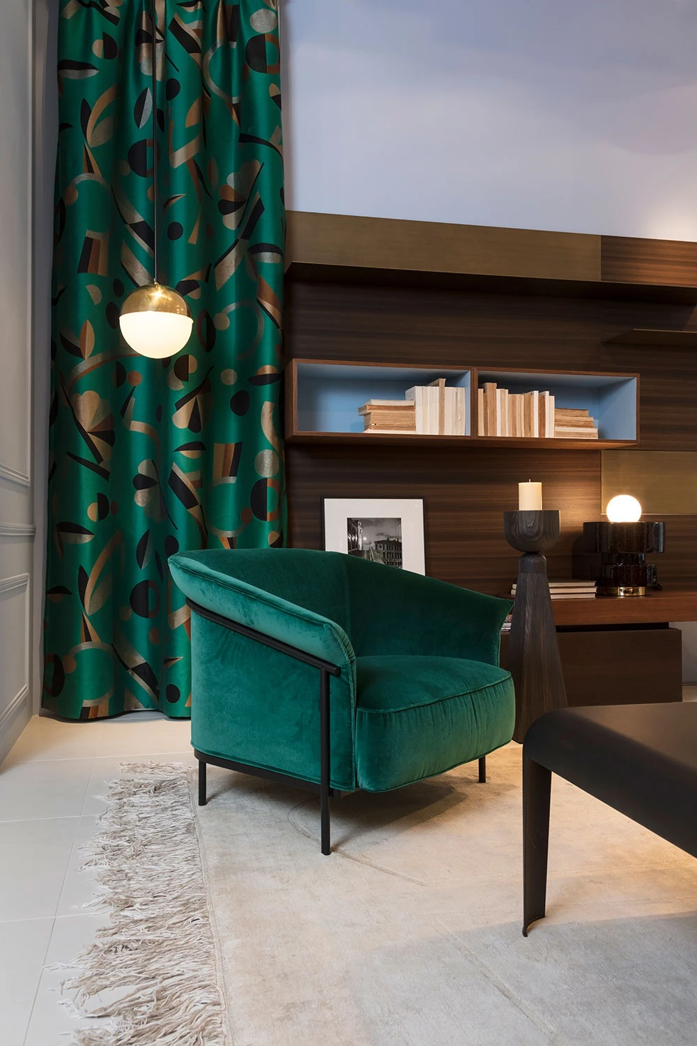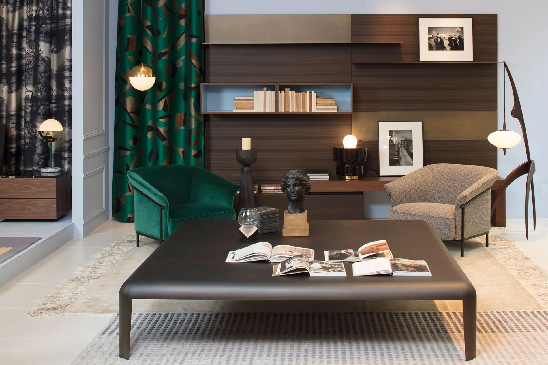 2 Kite armchairs by GamFratesi play a starring role in the living room with their pure and enveloping shape, re-interpreted by the French designer with a neutral color woven fabric and a warm green bottle velvet. The Ferro low table in the centre enchants for its precious burnished brass finish, making the ambiance an informal and comfortable meeting point.