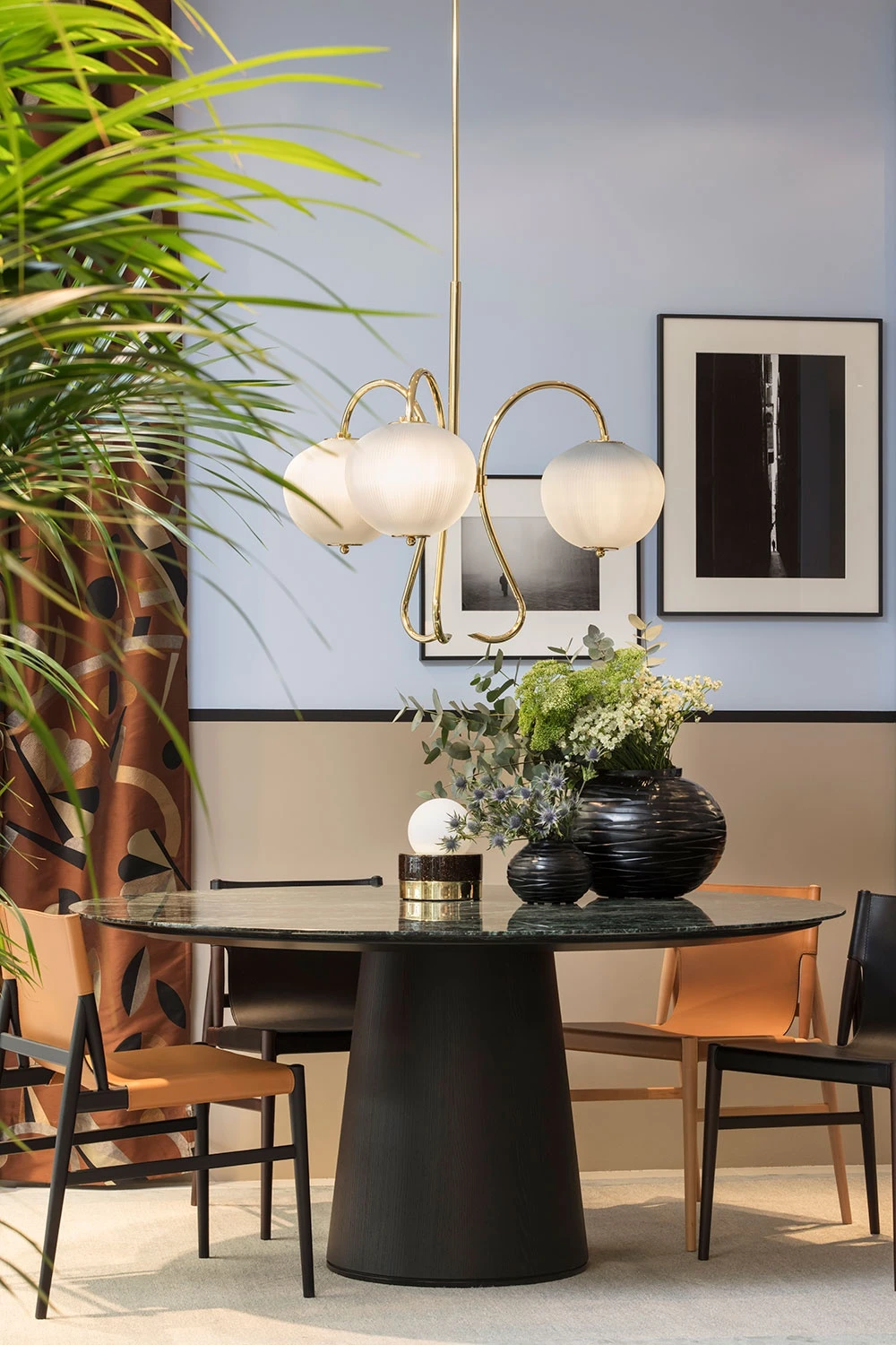 The second dining area in shades of light blue and violet is pervaded by the sensuality of Galileo table design Piero Lissoni in solid black stained ash with dark tones and organic contour, combined with the precise lines of Voyage chairs with tapered ash structure and leather covering, suitable for its impeccable elegance even in a business context.