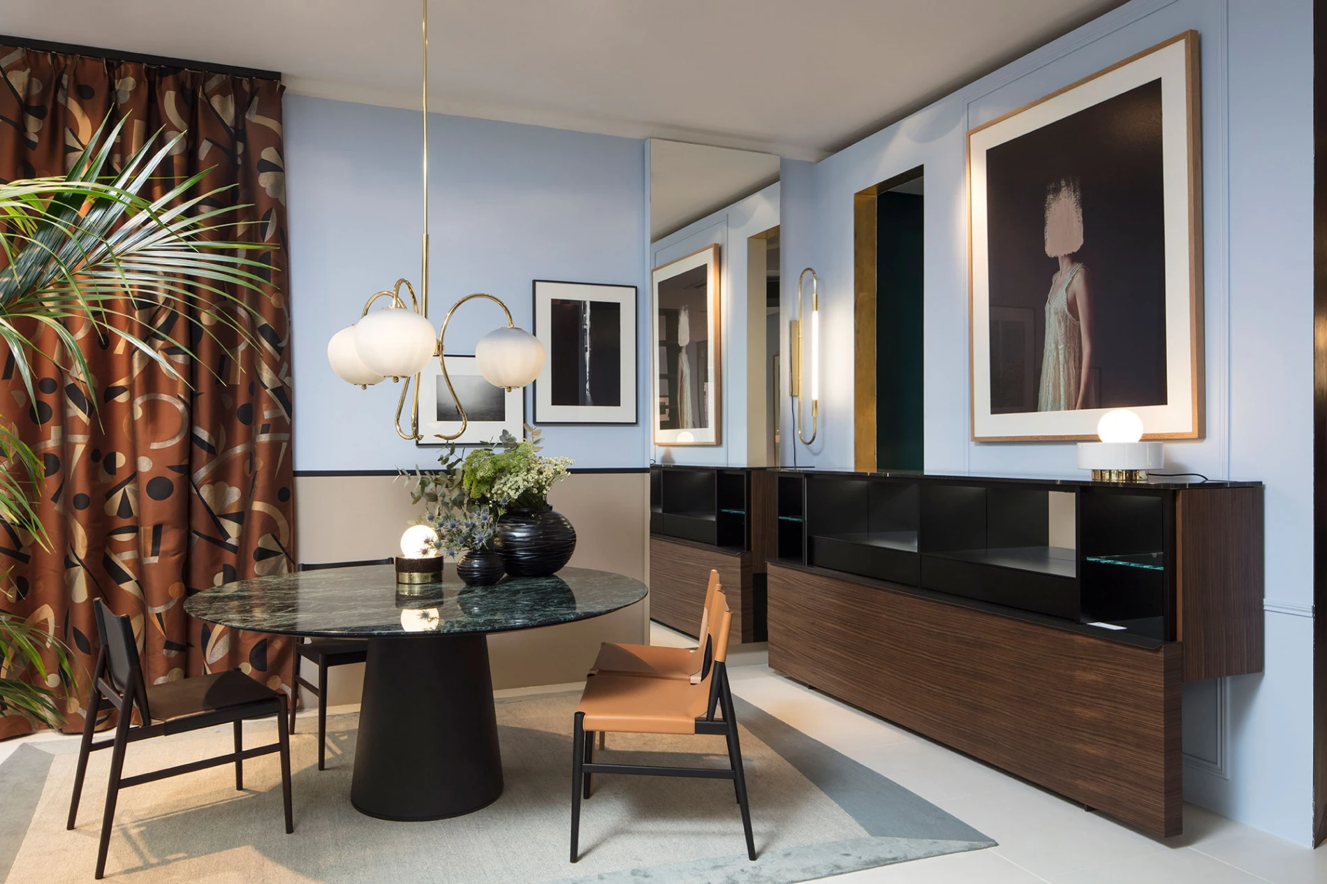 The Materic table by Piero Lissoni emerges in the space with its clear and rigorously fashionable aesthetic, with the rich highlights of the verde rameggiato marble top, and the intense dark of the solid black stained ash base, juxtaposed to the sleek profile of the Voyage chairs by Gamfratesi in tapered wood and leather. Designed to contain plates and glasses, the Gallery Low sideboard by Gabriele and Oscar Buratti has a single horizontal wooden door, which slides down revealing black lacquered interiors.