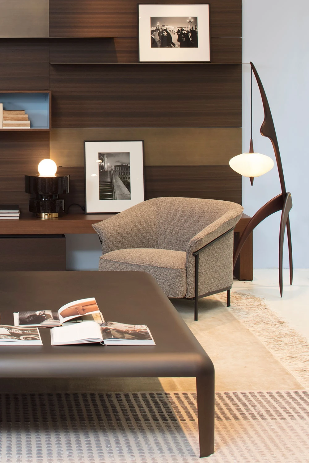 In an octane-coloured set, the Kite armchair by GamFratesi with a special Japan-inspired decorative fabric, the Loop mirror by the Swedish designers Front, a real wooden sculpture with a protruding shelf and the Maggio chest of drawers by Alessandro Mendini, whose diamond section, removable drawers and inlaid design demonstrate Porro's innate ability to choose, work and interpret wood, are raised on a platform like museum pieces.