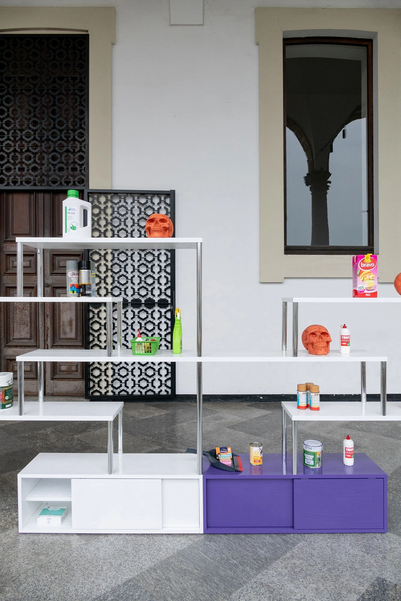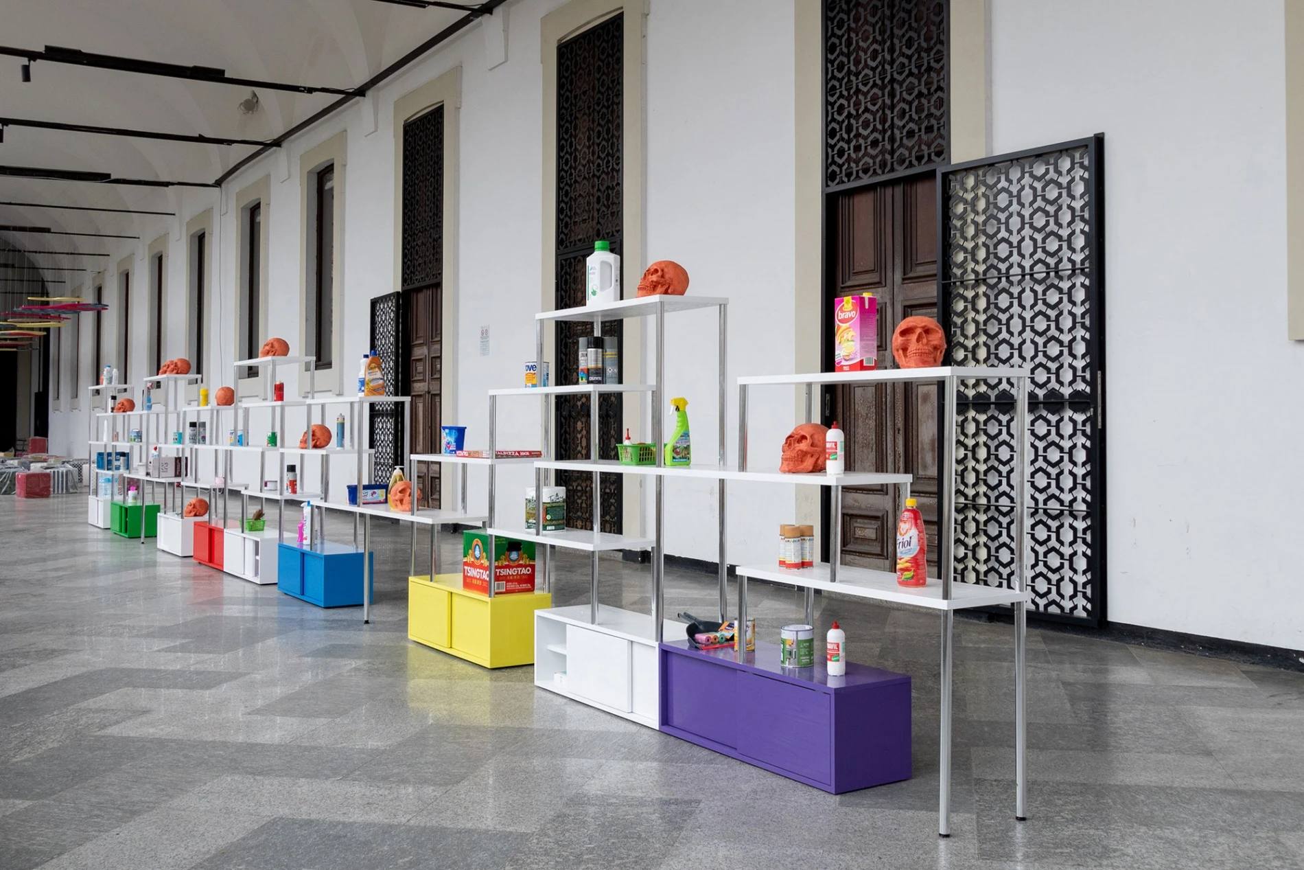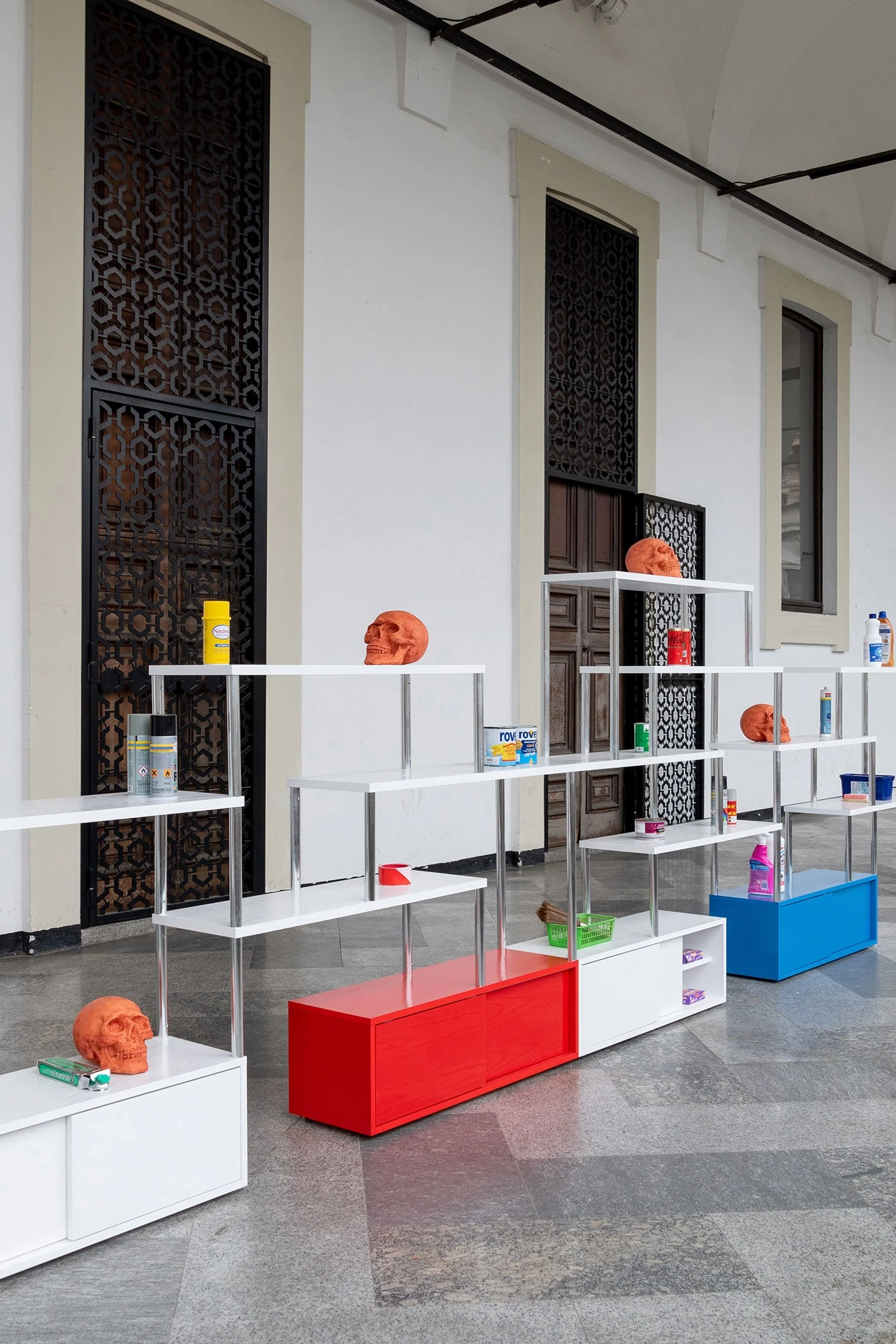 The designer describes his installation in the West Loggia: a large 14-metre-long bookcase made by Porro, characterised by a geometric silhouette and animated by colours. The modular structure, 160 cm high, is composed of white shelves, while the shades on the bases are red, blue, green, yellow and violet, all with a bright epoxy resin finish. Above the bookcase, like silent sentinels, stand recycled and painted everyday objects - such as water and detergent bottles - alongside twelve terracotta skulls.