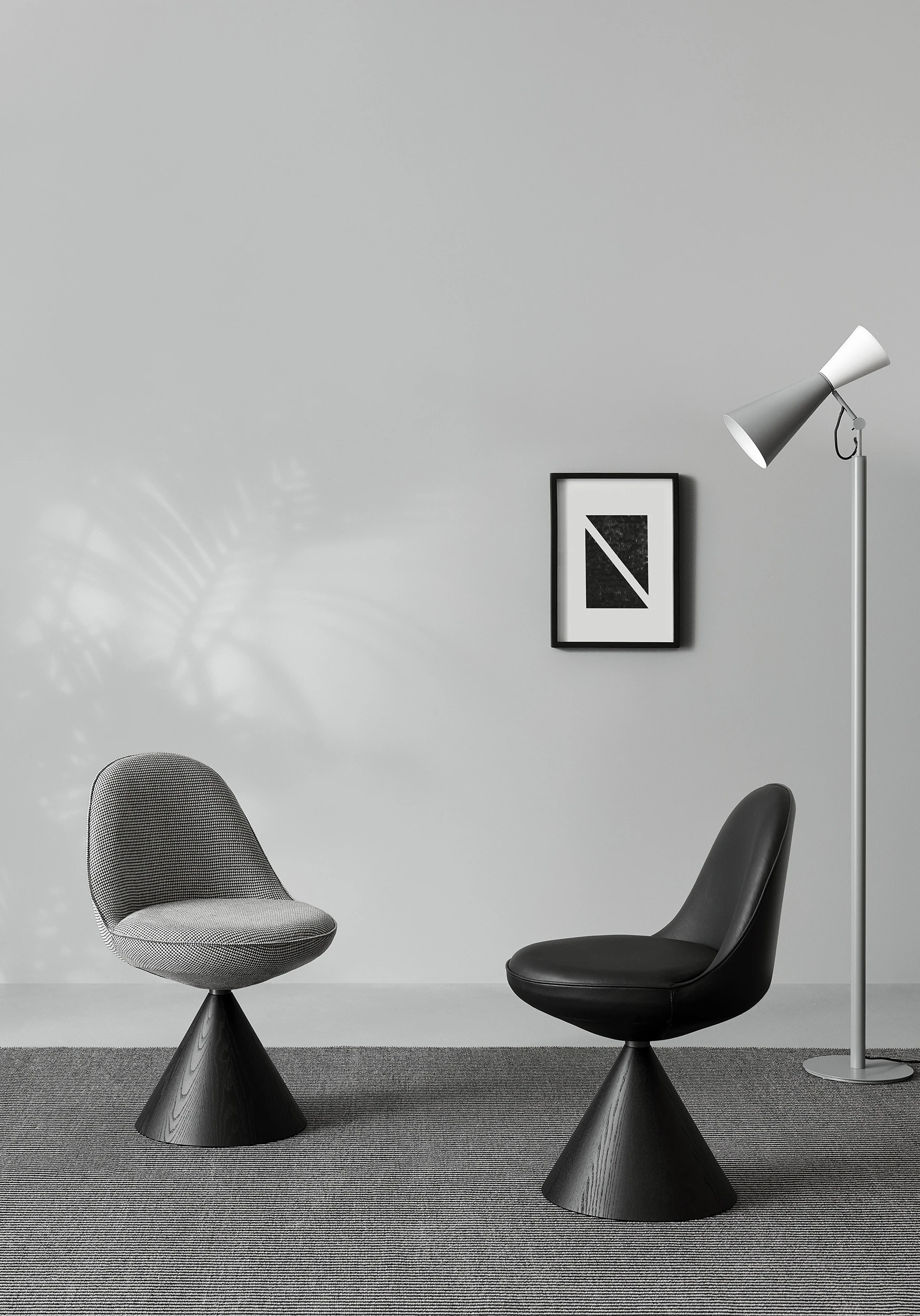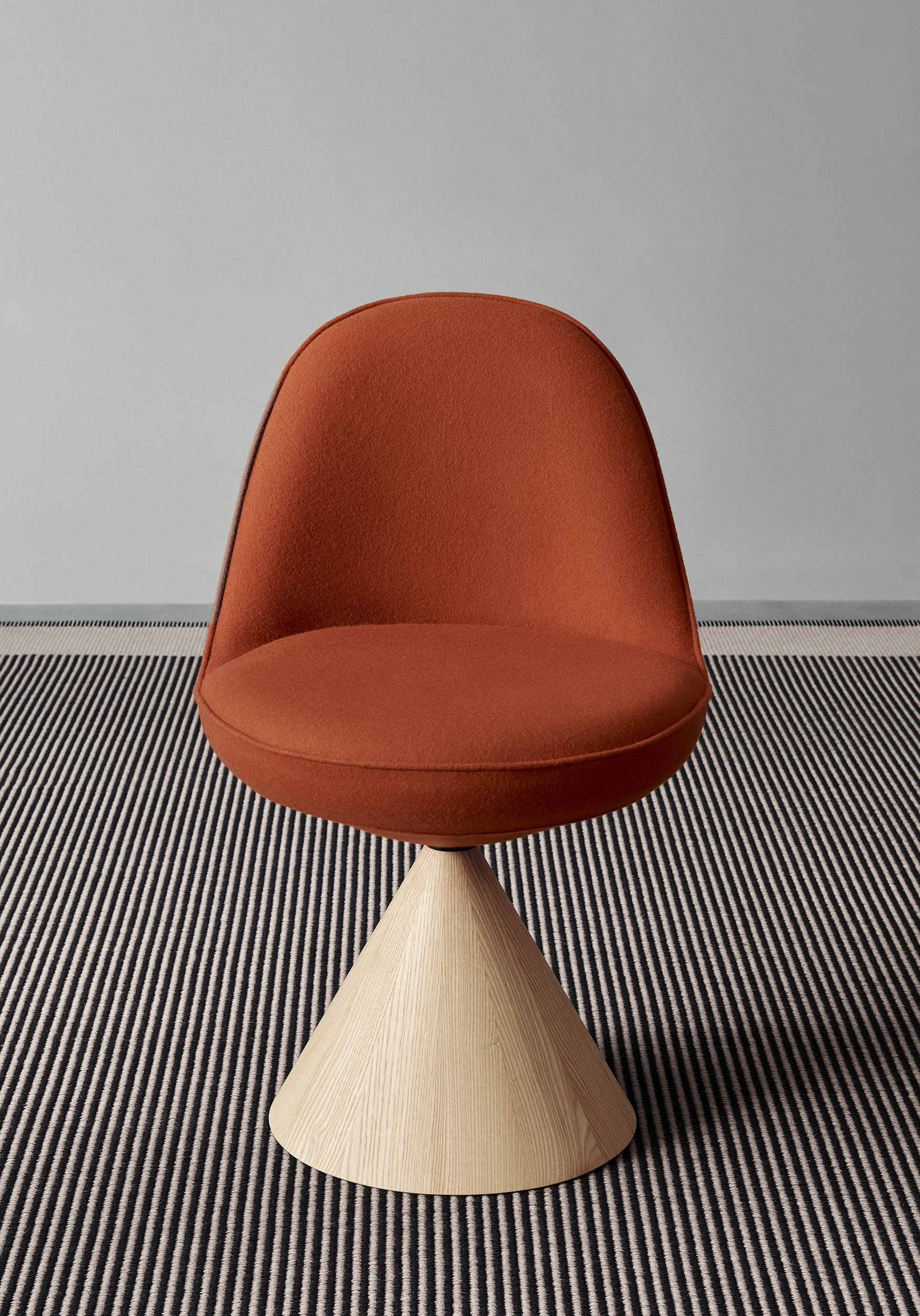 Preview News 2020. System bookcase with straw back. New Materic table with stainless steel base and black stained ash top, design Piero Lissoni. New Romby padded chair with conical base in natural or black stained ash, design GamFratesi.