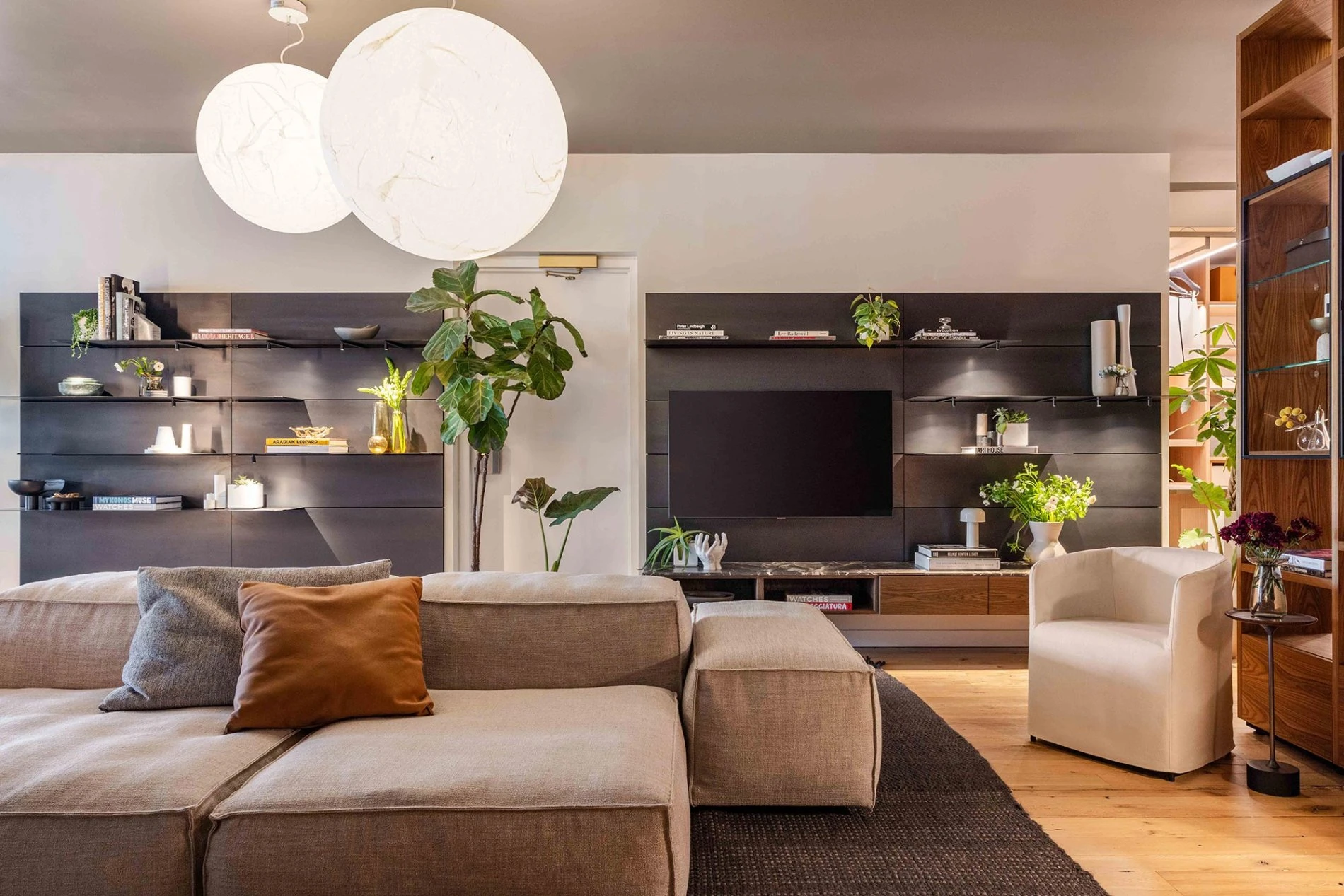 Designing spaces with sharp and elegant lines: in the living area, a Porro classic, the Load-it bookcase by Wolfgang Tolk, ideal for creating equipped walls and boiserie, is showcased in a custom full-height and full -length double composition, surrounding the door, with wall panels and steel shelves. The composition on the right includes a space for the television and a suspended multifunctional Modern board in oak barrique with a Valentine Grey marble top, elegantly accommodating books and multimedia equipment.