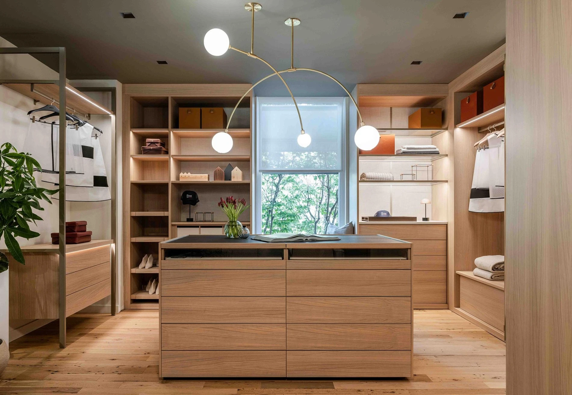 At the center of the room, the new Storage Isola chest of drawers incorporates the standard equipment that makes the Storage bedroom system unique and combines them in an infinite range of possibilities: here, it features a leather top, open compartments in beige lacquer and drawers in white cherry, creating a new multifunctional container to complete the dressing room, in home environments and in the most refined contract settings.