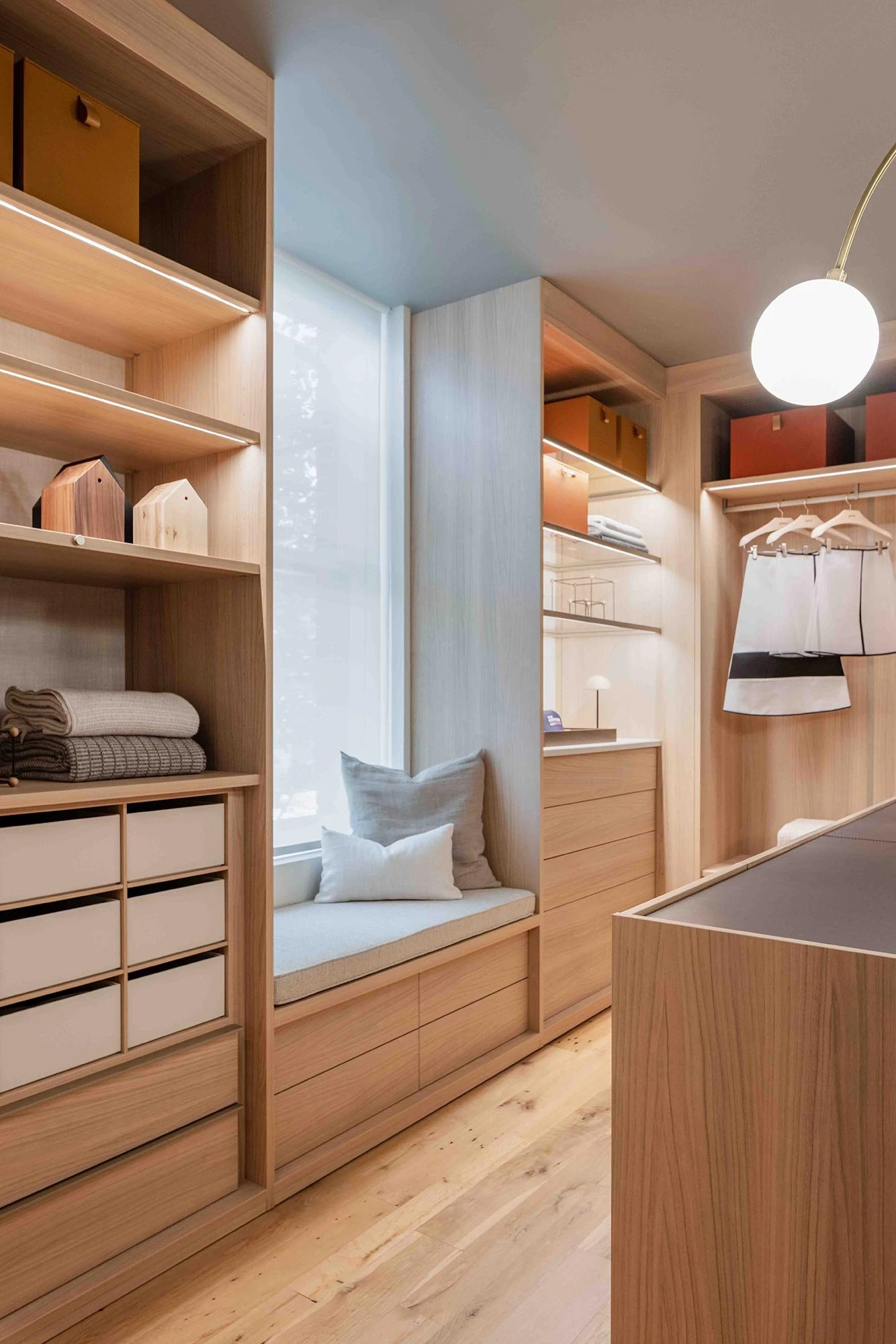 In the wardrobe area, the open wardrobe and walk-in closet Storage, designed by Piero Lissoni + CRS Porro, feature cuvée metallic elements and white cherry fittings, a light Nordic-inspired finish that reproduces