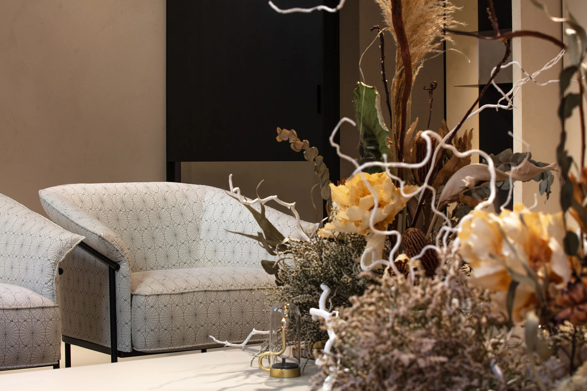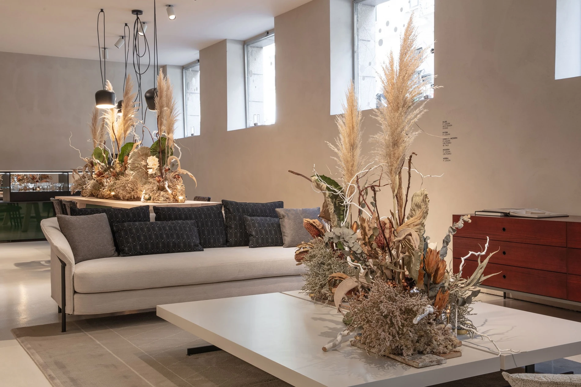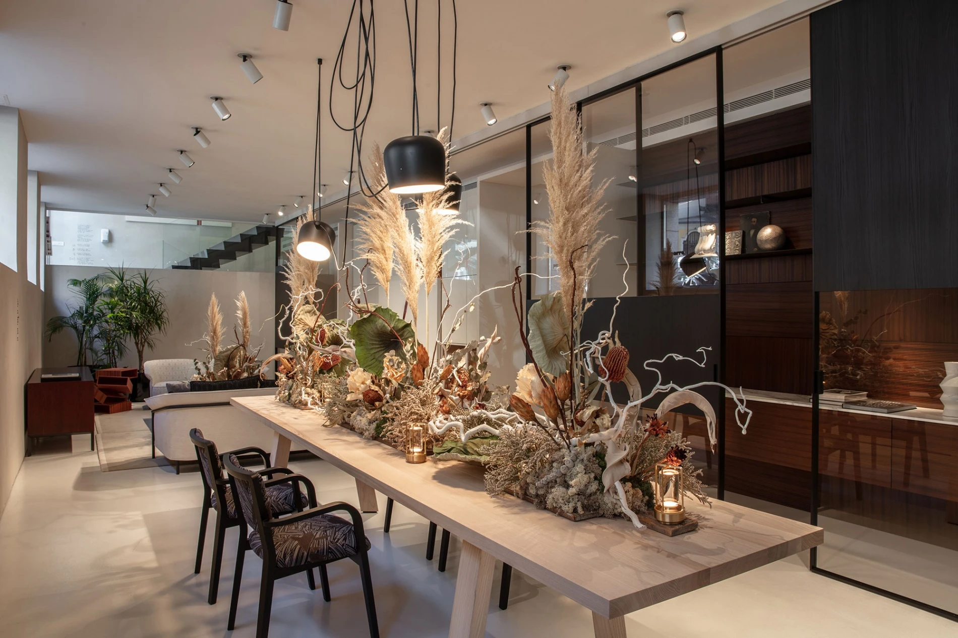The Panca Left by Piero Lissoni with an avorio lacquered top and Left metal foot hosts a site-specific creation by plant artist Satoshi Kawamoto, who composes together amazingly shaped dried flowers, plants and leaves with the candle-lamps Hymn by Hiroto Yoshizoe for Ambientec, rethinking the way in which people relate to plants in their daily habitat, chosen with the same attention and care as a dress or furniture.
