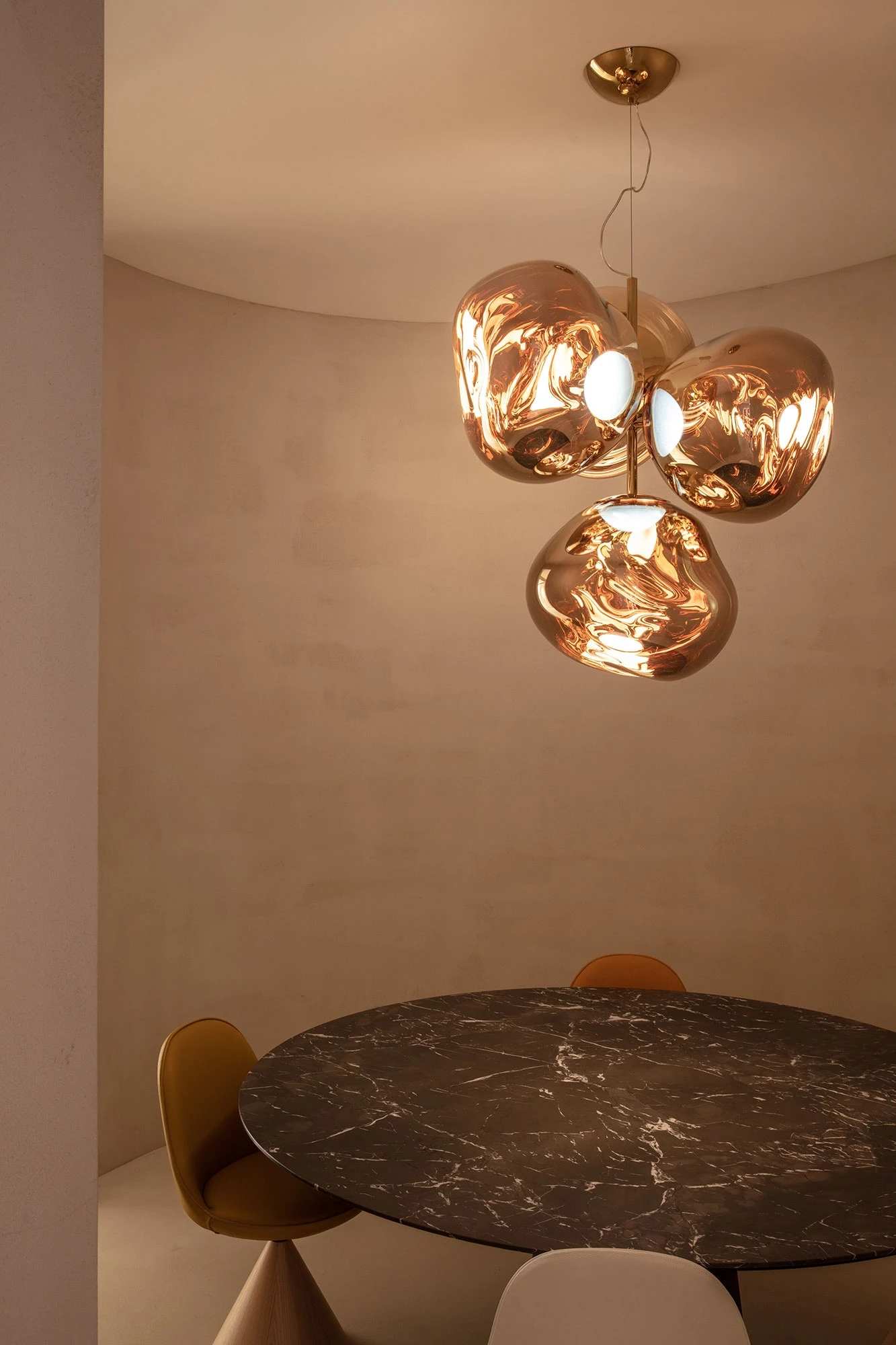 In the round room set up with the Materic table by Piero Lissoni in the version with a round gray valentine marble top and a solid black-stained ash base and the Romby armchairs by GamFratesi, the Melt chandelier by Swedish designers Front for Tom Dixon lights up the scene. With its series of distorted spherical lights, half-metallized to create an extraordinary optic effect which casts an ethereal luminosity in their surroundings, result of the mix of high technology and dreams, it testifies to the bond between Porro and the English brand, hosting Porro’s new London showroom in its headquarters at the Coal Office since September.