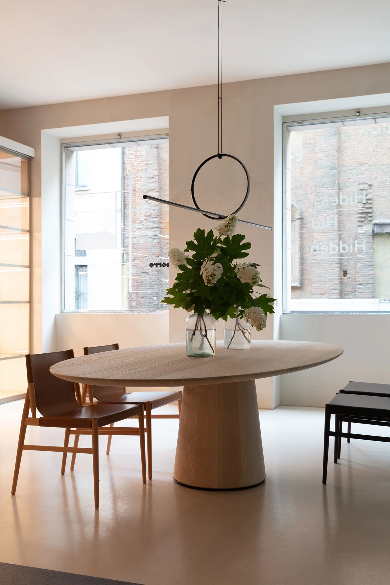 In the dining-room or studio, the Materic Ovale table by Piero Lissoni, with oval top and truncated cone base both in Latte ash, an extra-clear Nordic-inspired finish, vibrates in the space, enchanting with the delicate shades of nature, in perfect combination with the Voyage chairs by GamFratesi with structure in natural maple and close-fitting leather upholstery, expertly cut and sewn.
