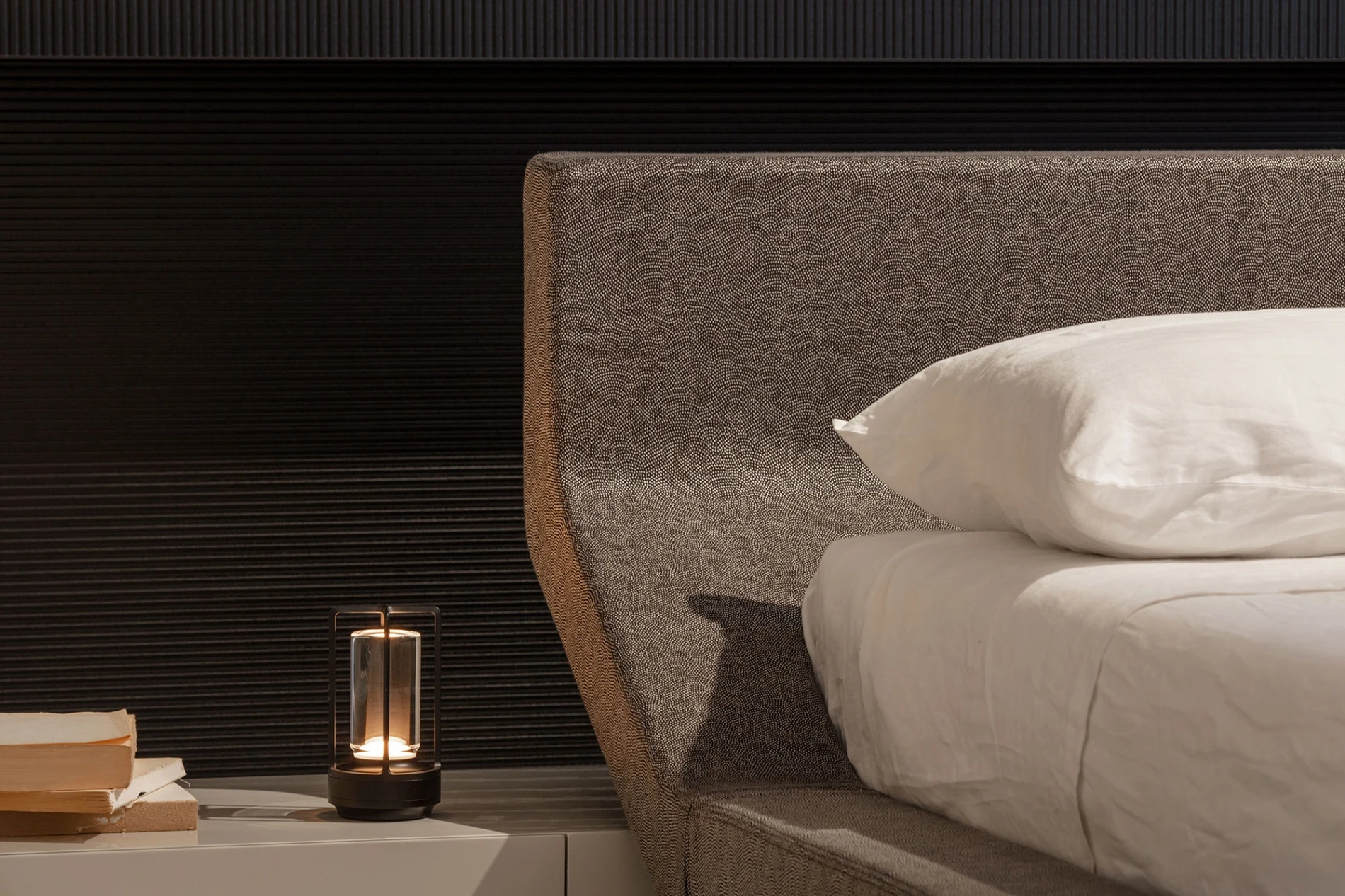 In the bedroom, extreme visual uniformity characterizes the iconic Lipla bed designed by Jean Marie Massaud for Porro in 2005, with a vibrant contemporary feel. The dynamism of its lines is accentuated by the black Backhausen fabric with a dense white dotted decoration. The back unit acts as a base for the Turn lamp by Nao Tamura for Ambientec.
