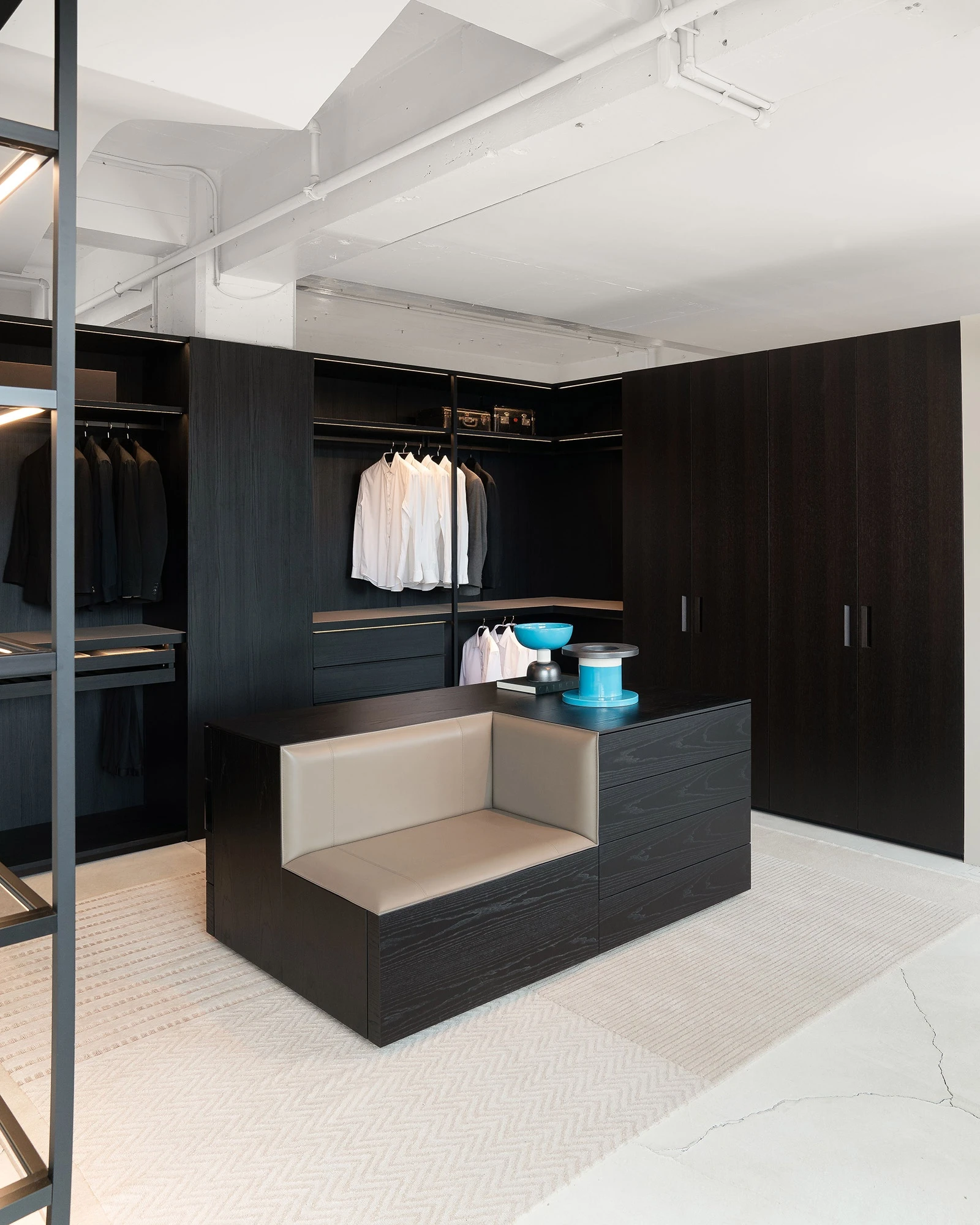The Storage dressing room “for him” priviledges instead black sugi, the dark and enveloping finish, extremely sophisticated, at the same time ancient and modern chosen for Storage system of wardrobes and dressing rooms. Combined with a black painted metal structure, it offers a matte black-ink surface with marked veins, inspired by the ancient Japanese technique of Sou Sugi Ban, which protected the cedar wood by burning it with coal.