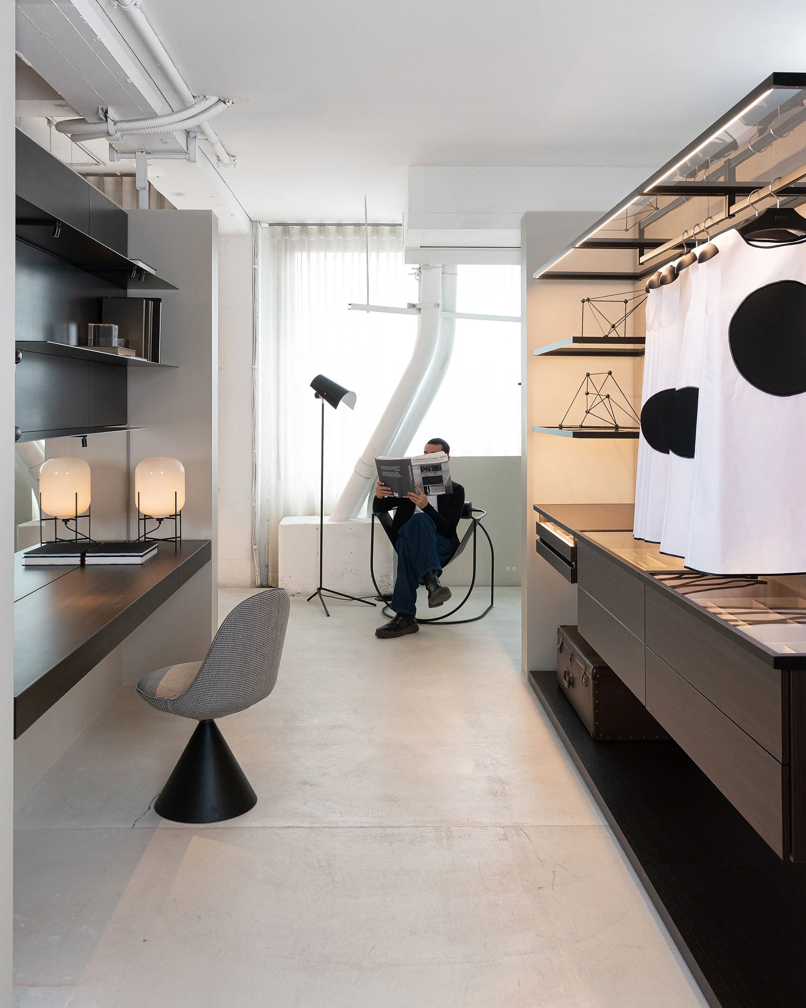 The corridor is transformed into a studio by the Load-it bookcase by Wolfgang Tolk with steel shelves and steel and mirror wall panels, accessorized with a Modern palissandro santos suspended top, perfectly matching the Romby chair by GamFratesi, whose truncated cone base in solid black stained ash wood, with an exquisite flared shape, is connected to a swivel upholstered seat, soft and compact, covered in black&white fabric.