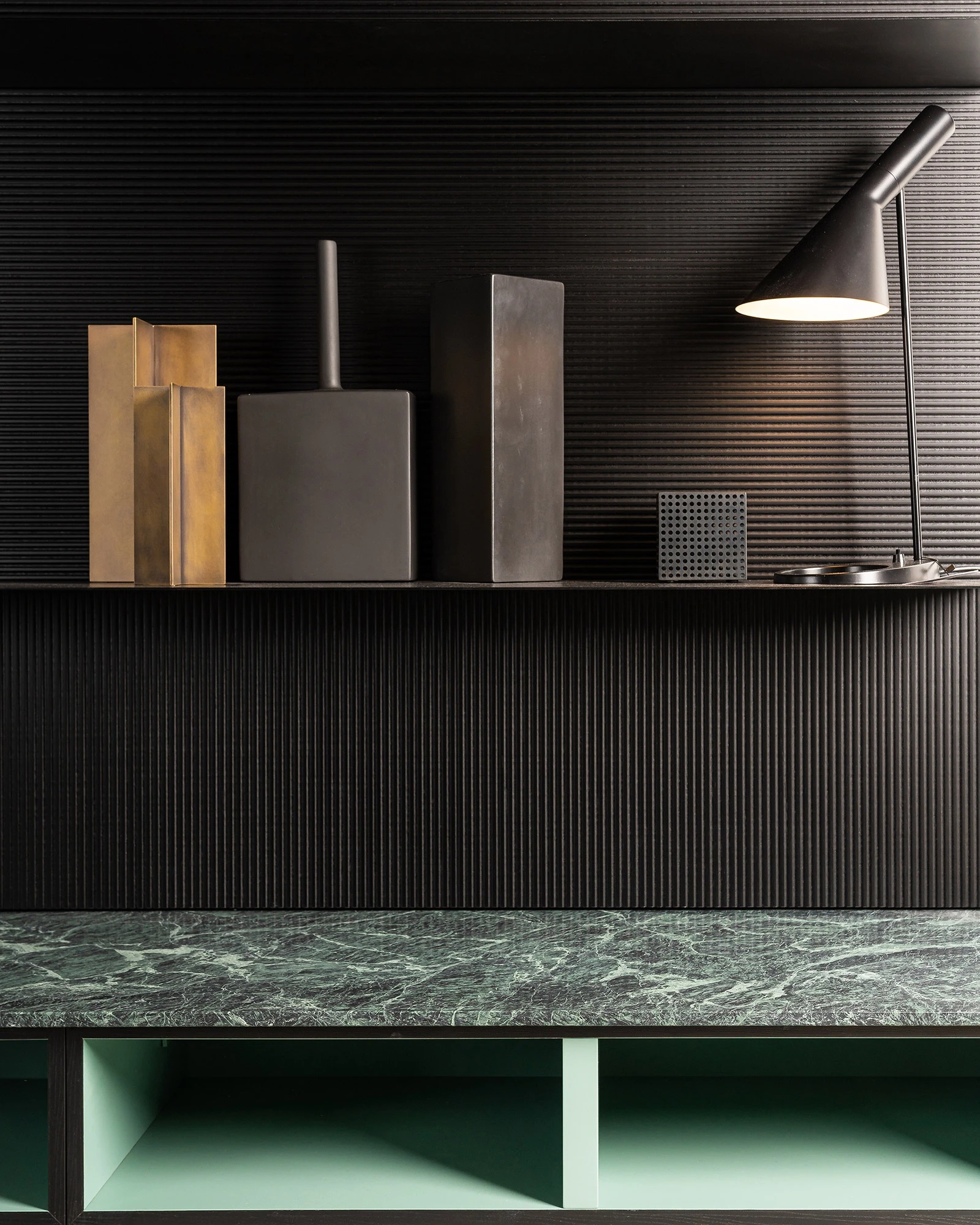 Capturing the eye in the living room, a large Modern+Load-it hanging composition is lifted off the ground and combined with a Verde Rameggiato marble Roc board. The Load-it bookcase with steel shelves and wall panels in black stained canneté, featuring a succession of horizontal and vertical stripes, creates a material picture on the wall. The large Modern volume is enlivened by the nice graphic interplay of the doors made of heat-treated oak, a strongly textured wood in contrast with the verde gris shade chosen for the interiors of the glass cabinets – with a metal frame painted in the same colour – which emerge as contemplative voids in the composition. An architectural solution with a strong scenic appeal that offers maximum capacity and utmost customisation.