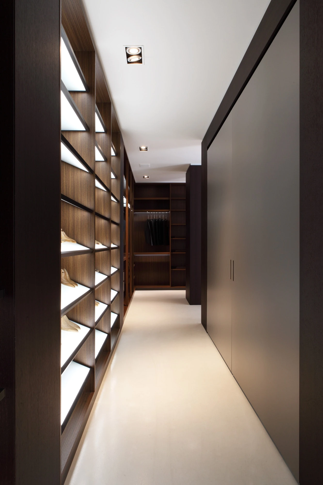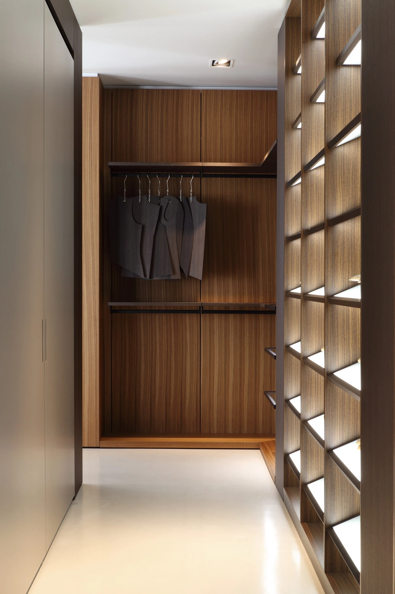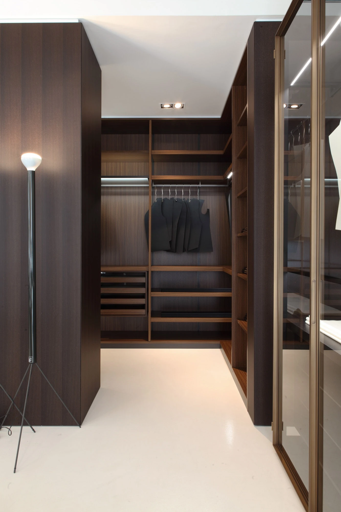 In the showroom at via Durini 15, wardrobes are in the spotlight, quintessence of Porro’s customisation. Here the company’s bespoke does not only manifest itself through the original and cutting-egde space solutions or the accurate finishings of doors and interiors, but above all through the rationalisation and optimisation of interiors so that the objects inside – shirts, clothes and one’s most beloved accessories – are not just safe and tidy, but exhibited and valued as well, with the obsessive attention to hidden details which makes a wardrobe by Porro different from any other, a world apart. A dense pathway hosts 8 subsequent possible solutions, confirming that spacious, breath-taking areas are not necessary: the wardrobe project by Porro shows off its absolute quality whatever the size. Like a tailor, Porro masterfully sews its wardrobes like a custom-made dress that is able to adapt to all desires and spaces, combining industrial production and handicraft, off-the-shelf product and one-off piece.