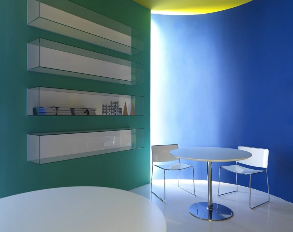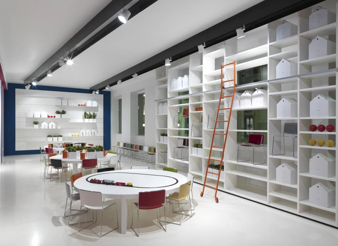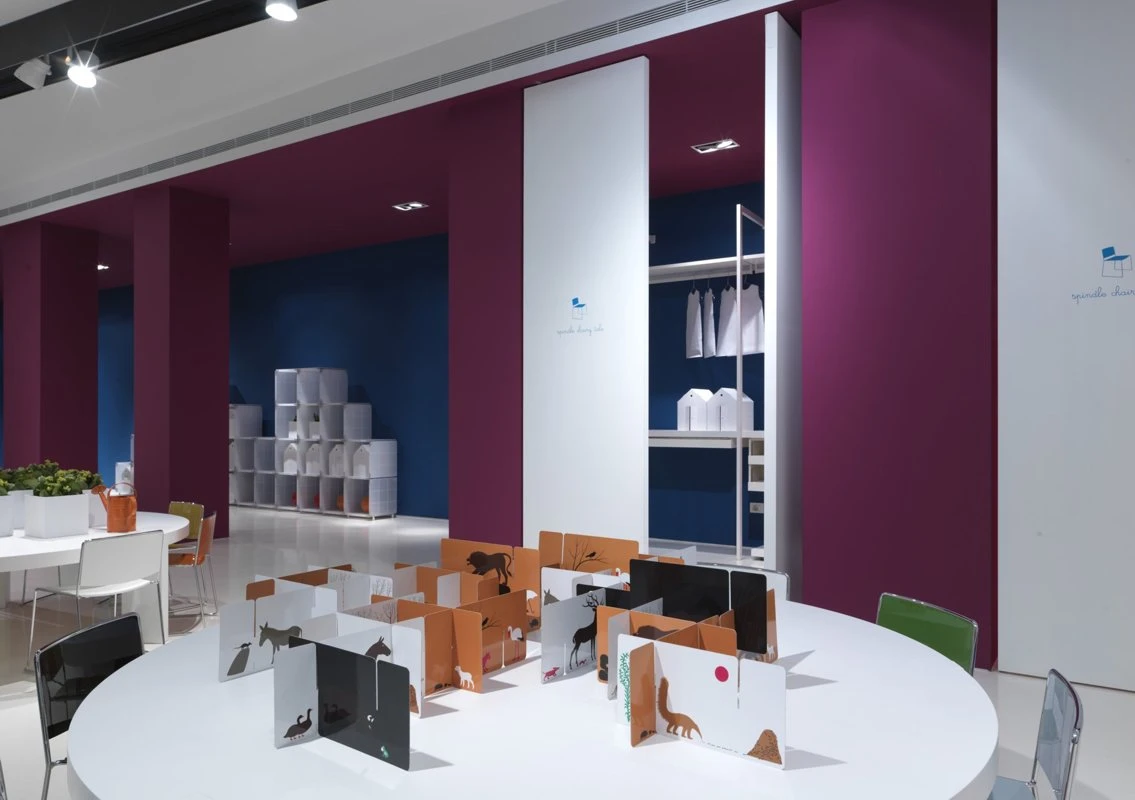 Available in 10 bright colour schemes, from the stronger shades such as fire red and mars orange to the natural shades of musk green and powder blue, to the more ethereal versions in chalk white and anthracite grey, satisfying all tastes, the Spindles in scale 1:child are distributed over the space to create multiple situations.