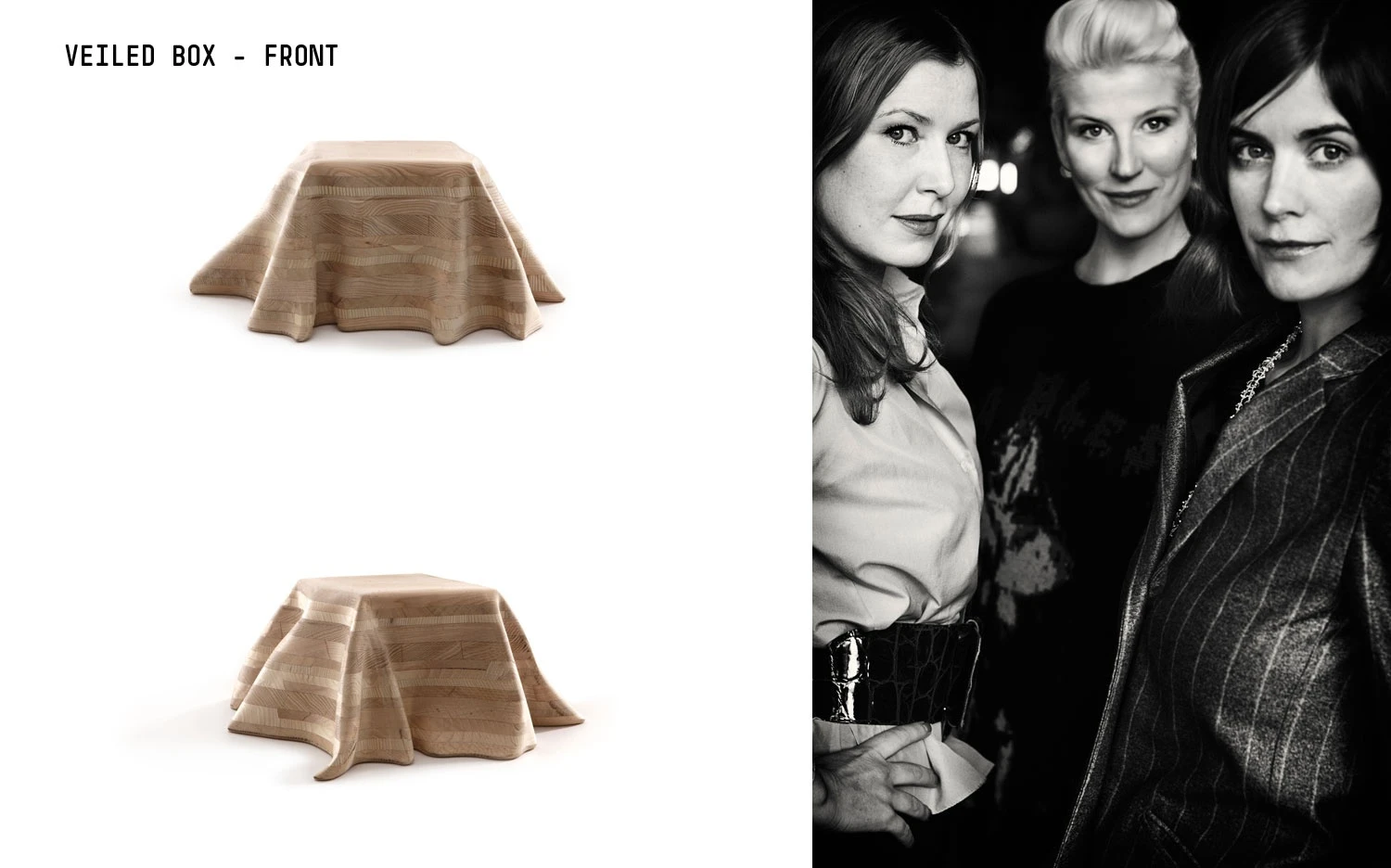 The Veiled Box is an object that is always on the point of being unveiled, and celebrates the exciting moment of revealing a new piece of furniture. A large piece of wood has been digitally milled to make it look like a box under drapery.