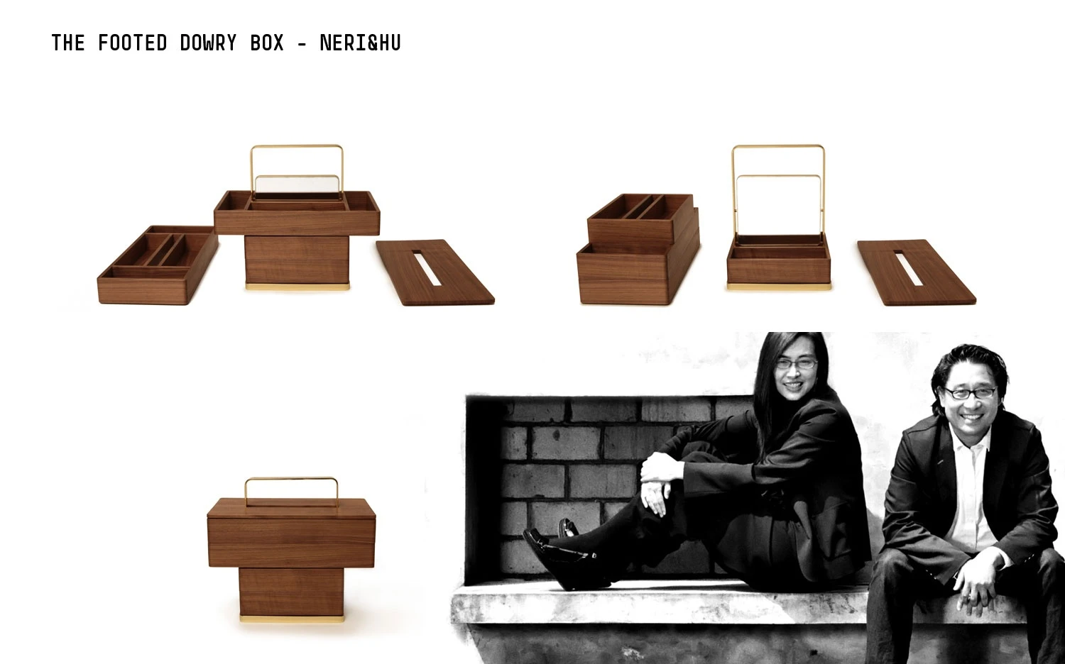 A jewelry box inspired by the dowry chest which used to accompany a Chinese bride into her newly wedded home. Other than bedding, wardrobe, and personal grooming tools, the dowry box traditionally also included two pairs of wooden clogs. Our design takes the form of the traditional bound-feet clogs, and superimposed them on the box, as if the box is footed like the clogs. This is our tribute to the curious tradition of foot-binding as it relates to women's marriage and role in society. A jewelry box, although is a superfluous container for unnecessary objects of vanity, takes on a new identity in reminding us of that meaningful past.