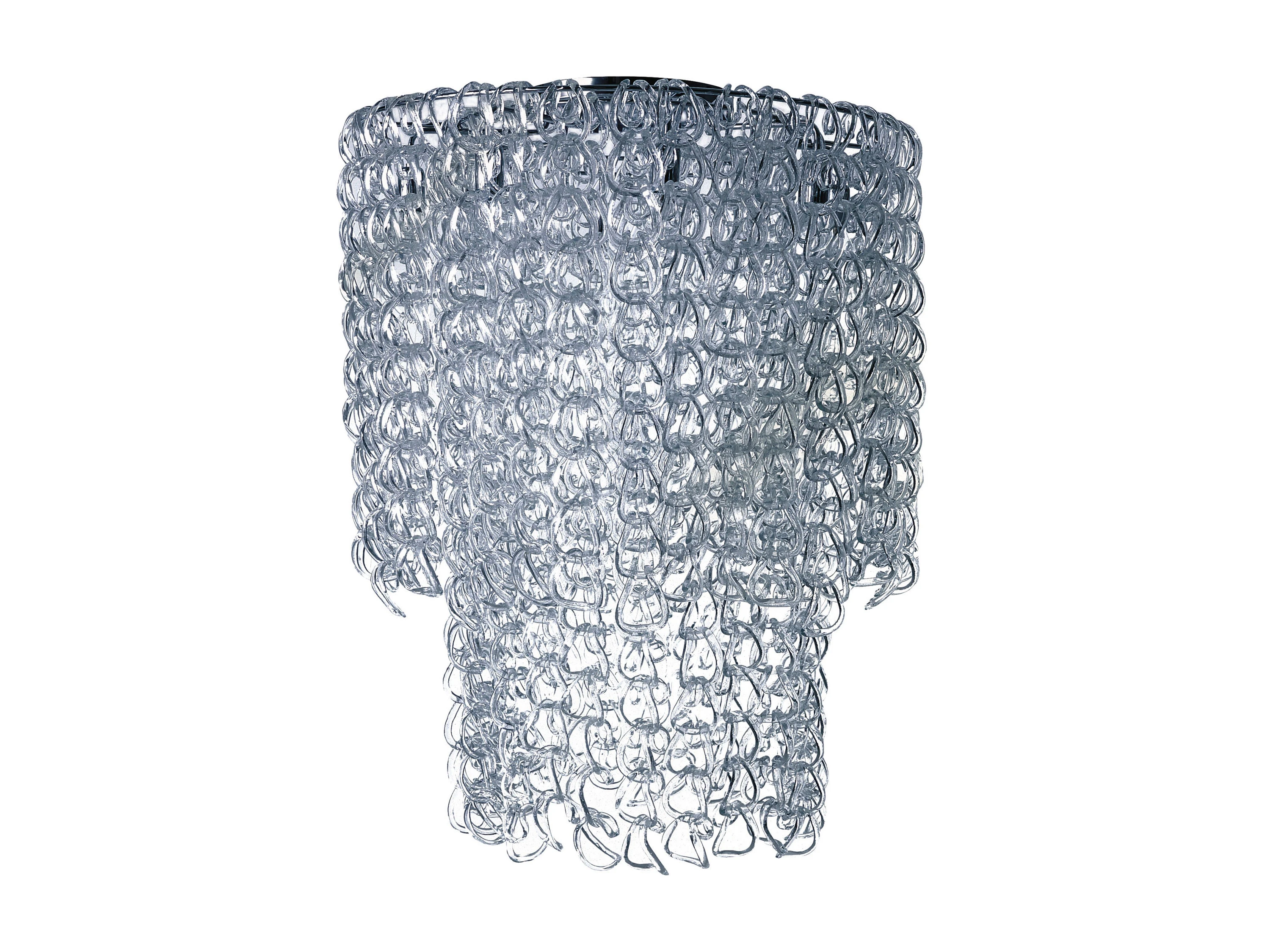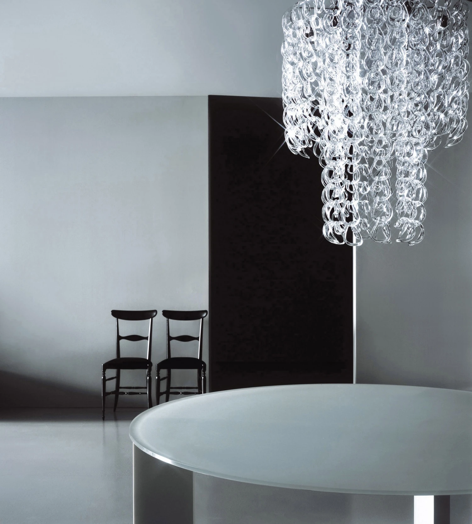 The P-Light chandelier is composed by transparent crystal elements entirely hand made, arranged on metal structures and available in two different sizes: 750 mm and 650 mm in diameter. The Vistosi of Murano glasswork exclusively makes the shape of the lamp.