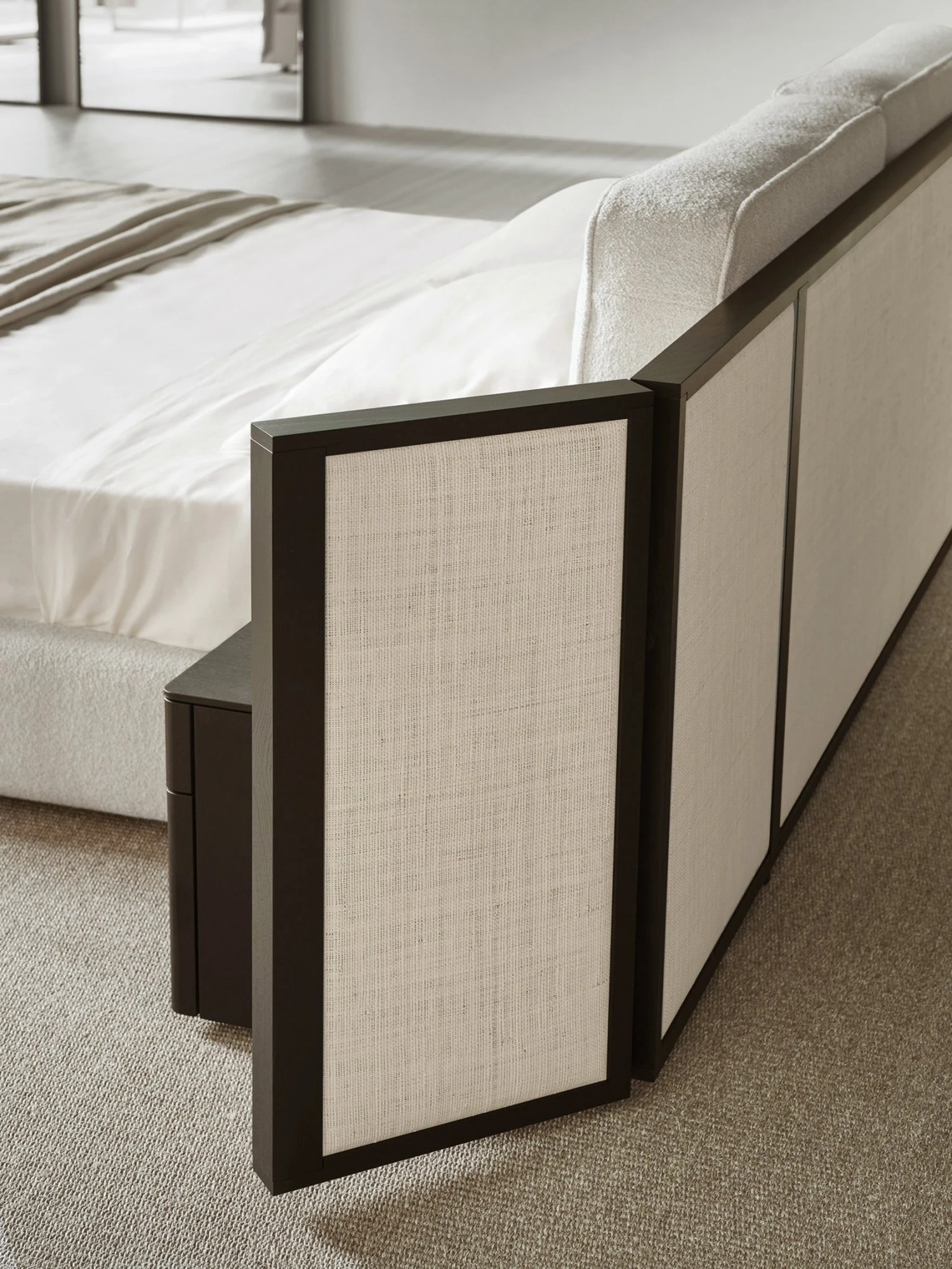 The paravent is a sophisticated detail of Byron: it is a frame in solid black stained ash wood that encloses a straw weave, and is available in different graphic patterns and colours, or wood panels in black sugi melamine finish or santos rosewood veneer.