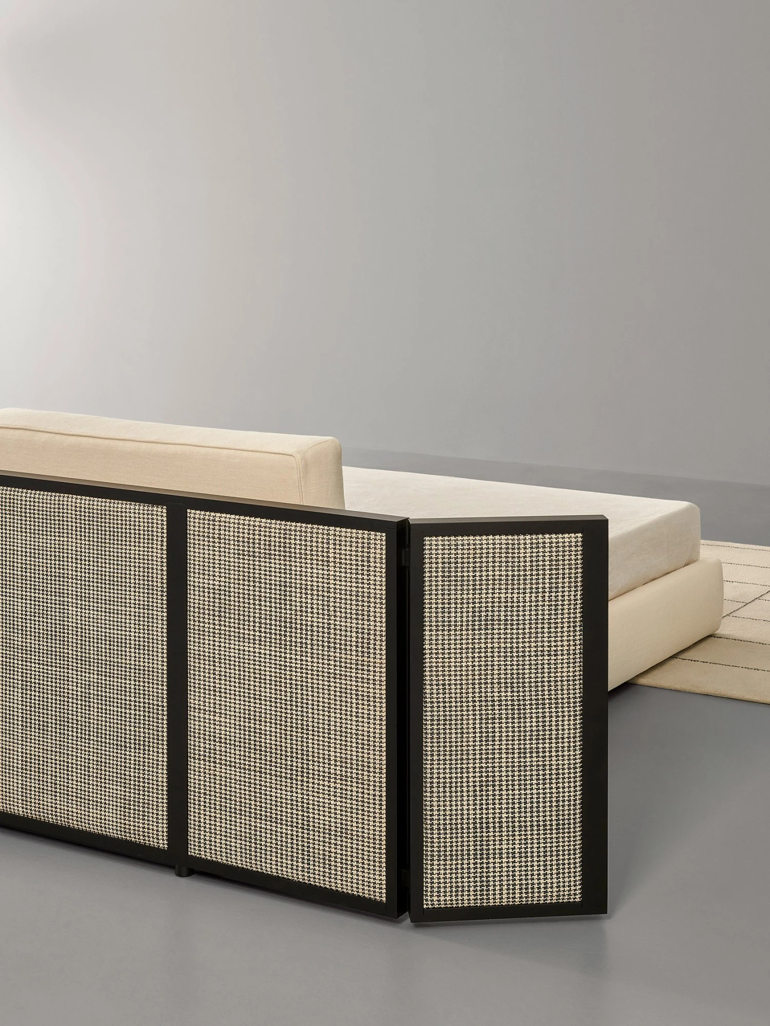 Soft lines and rounded edges characterise the textile part of the bed, while the paravent features a rigorous geometry.
