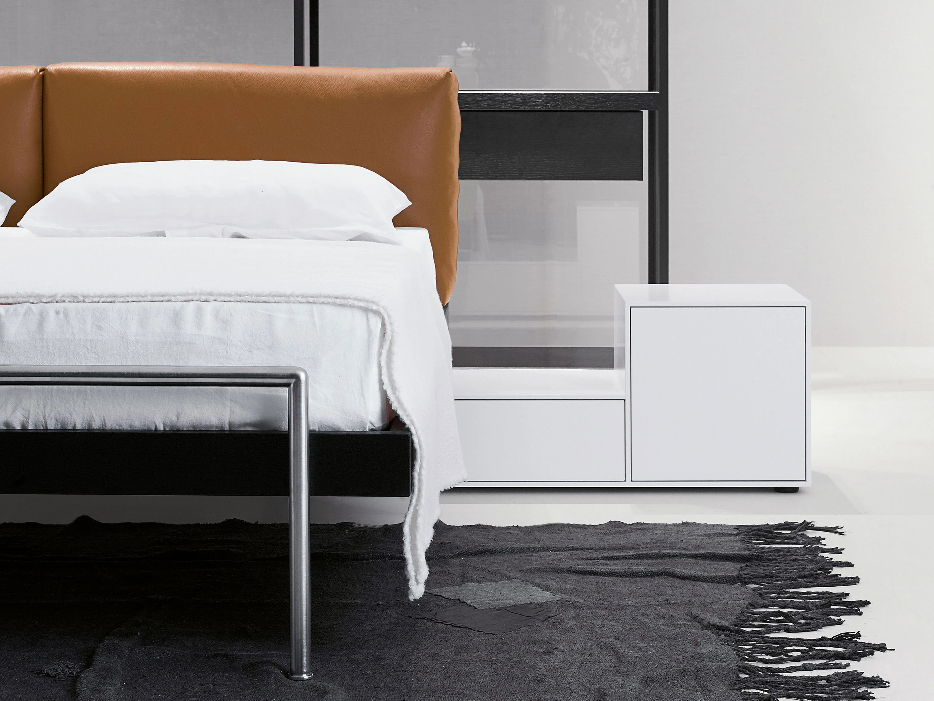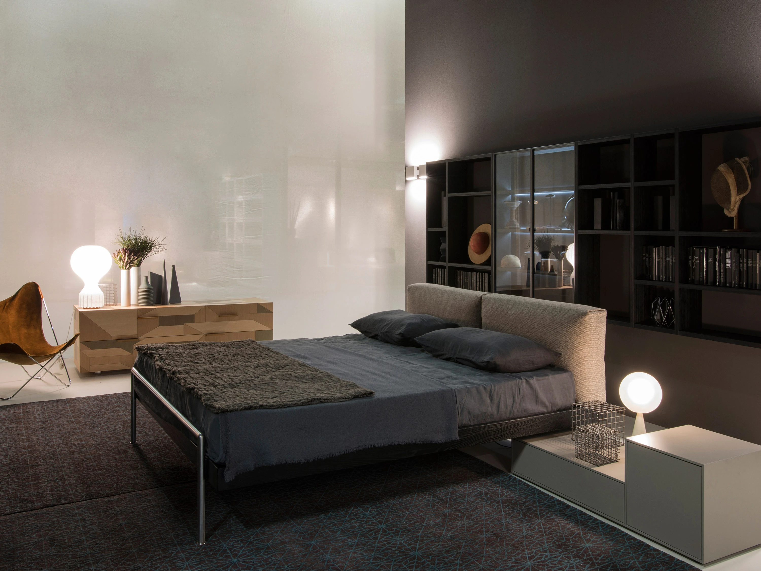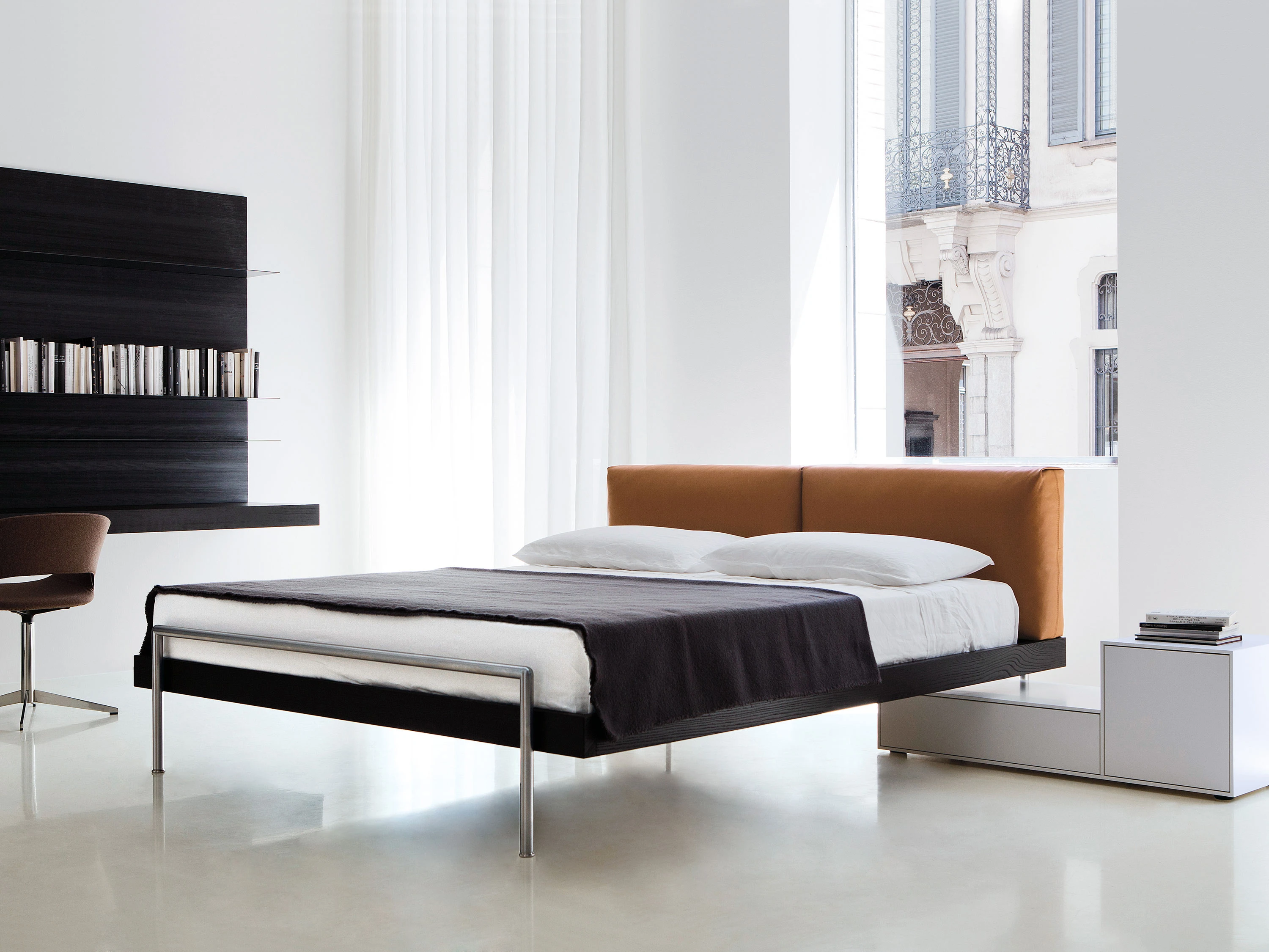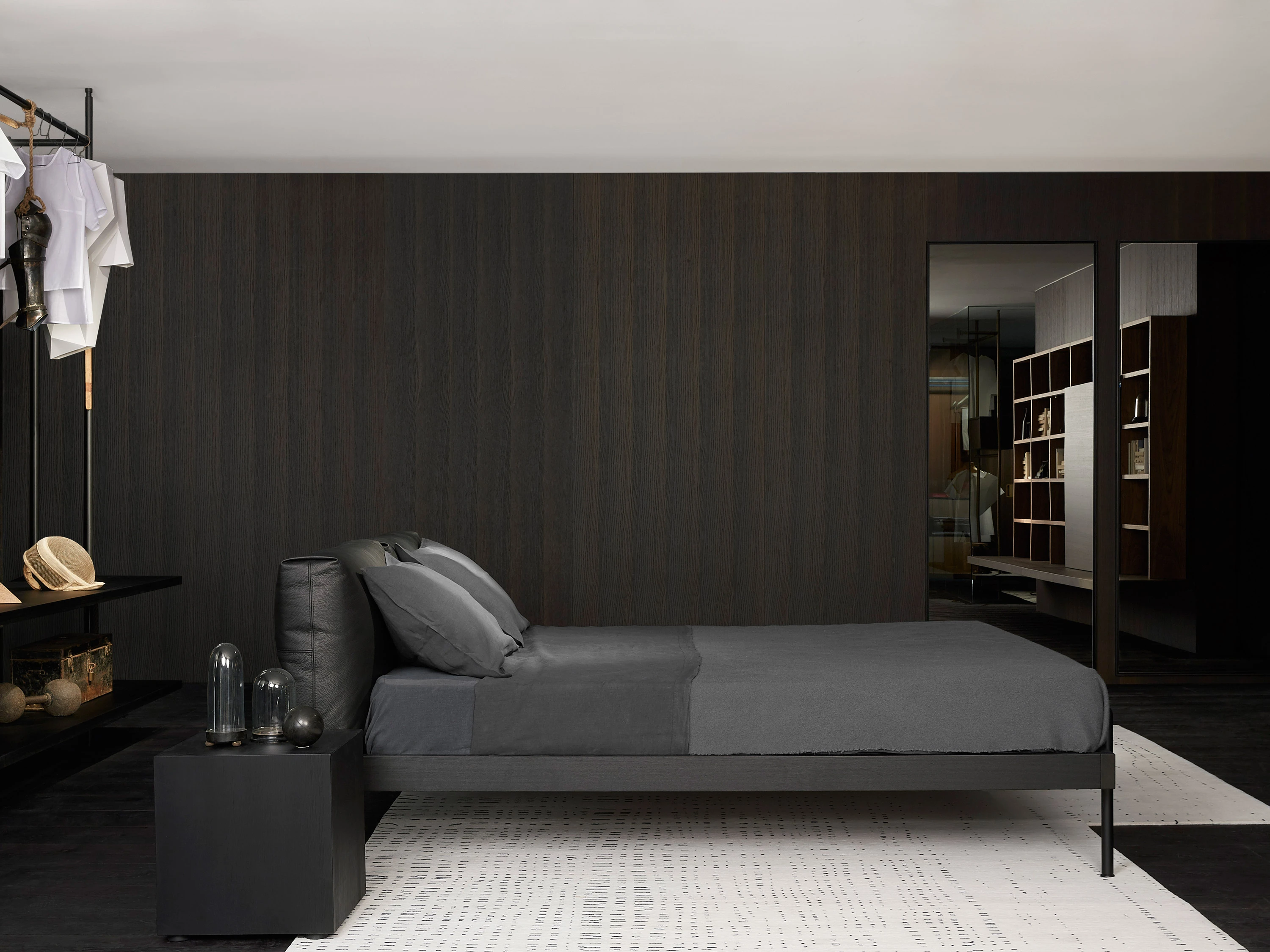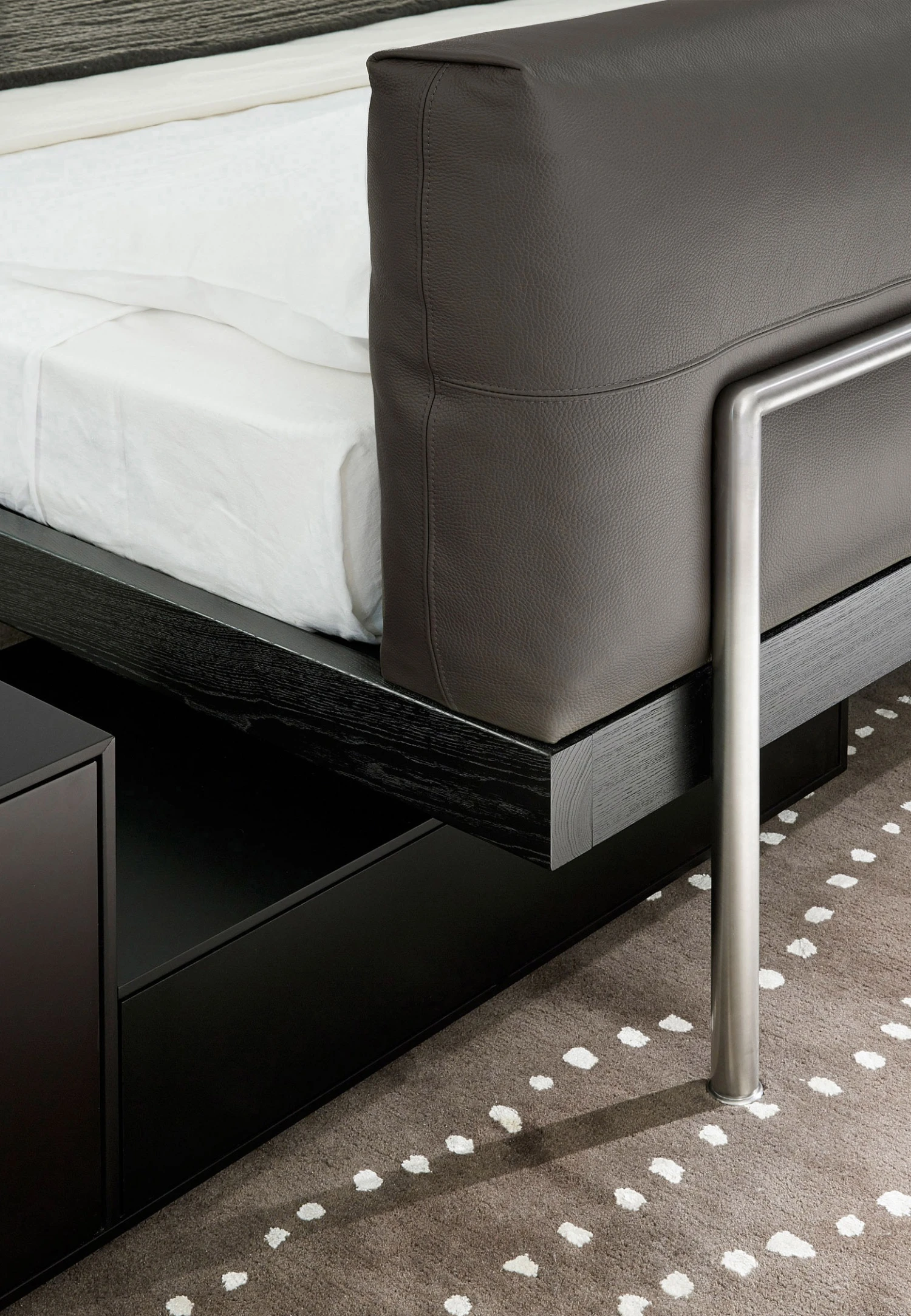 Simple double bed, cared for up to the minimum details, consisting in a solid structure and a soft and welcoming headboard. The bed frame in black stained ash is matched with the steel tubular headboard and footboard, in the chrome-plated glazed or black painted finishes. The soft wide cushions leaning on the metal tubular headboard perfectly fit the minimum and well proportionate design of Shin. Cushions are upholstered with real duvet and foam, at different thicknesses, while the covering can be selected among the fabrics present in the range, in leather, ecological leather or nabuk. The fabric covering of the cushions is unlineable. Shin is available in 2 sizes: for the mattress L.1600 x P.2000 mm and L.1800 x P.2000 mm. The bed is set to fit bedsprings available in the price list and even bedsprings higher than 50 mm high.