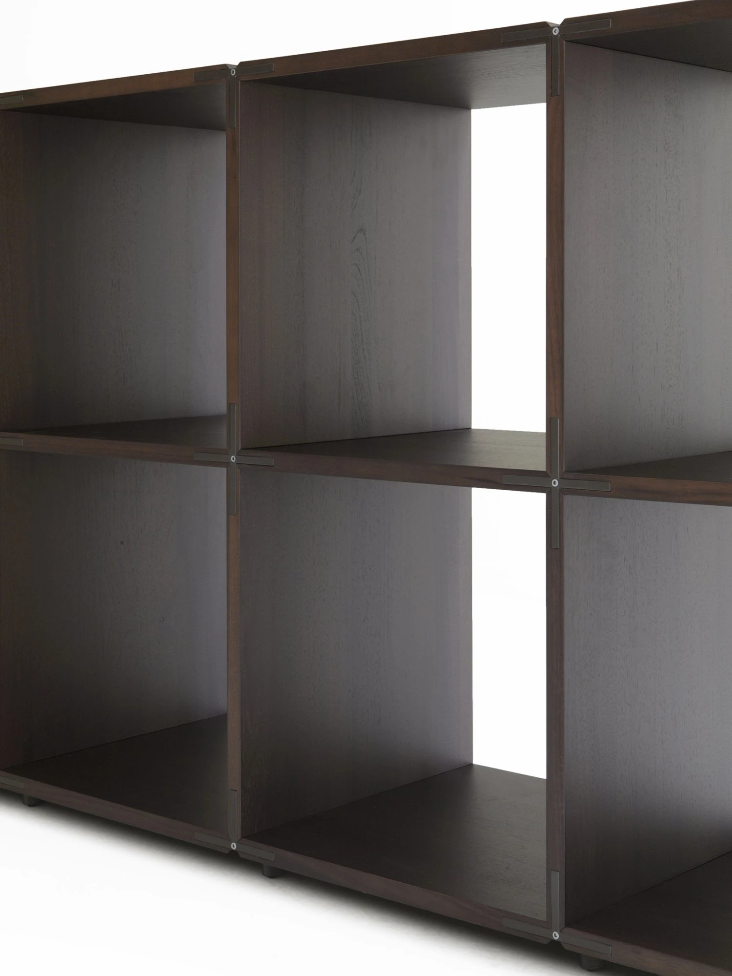 The modular bookcase is made of self-supporting panels, connected by special die-cast aluminum joints in distinctive X, T, and L shapes.