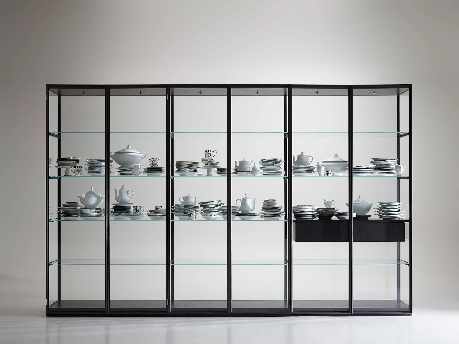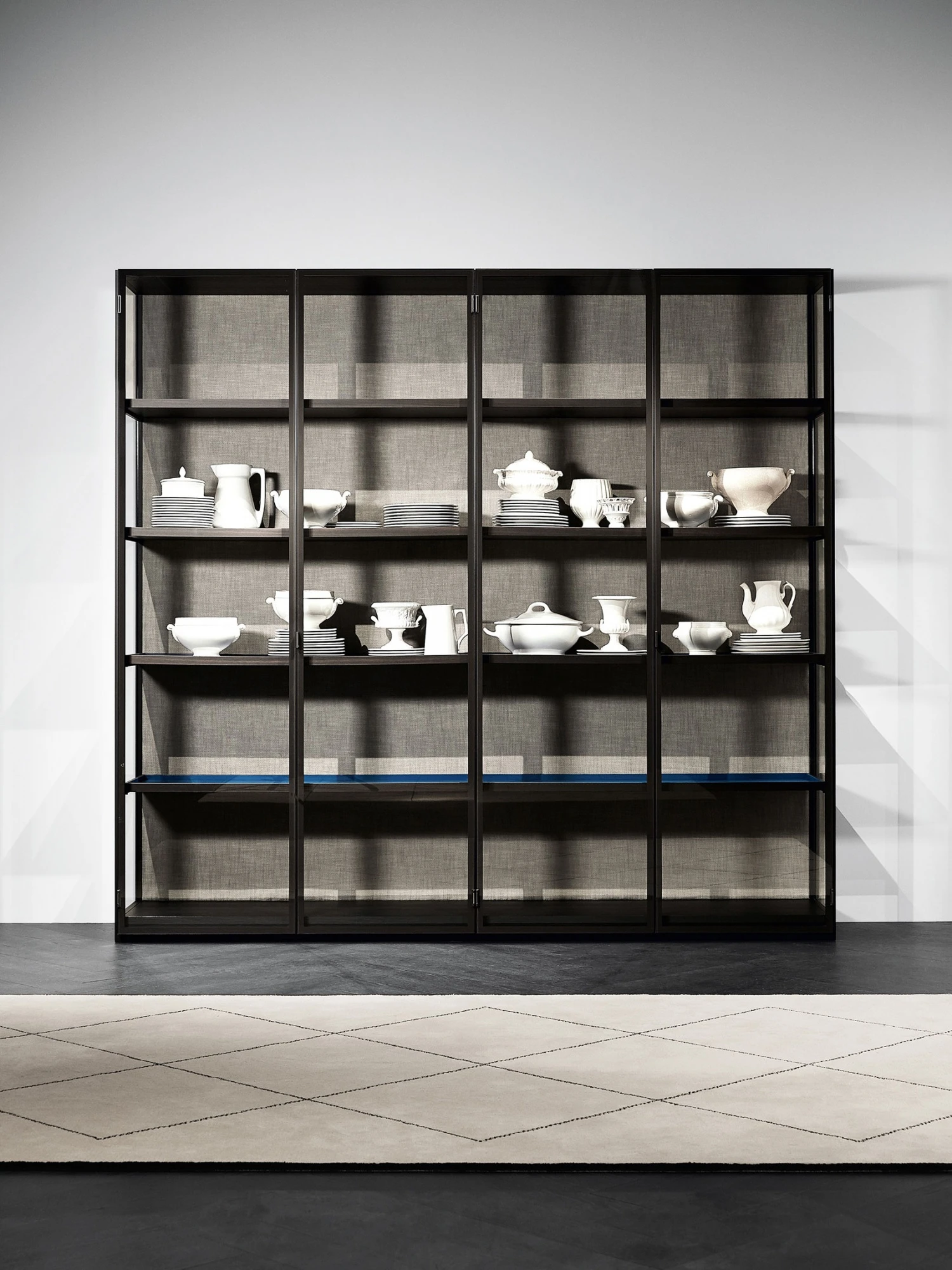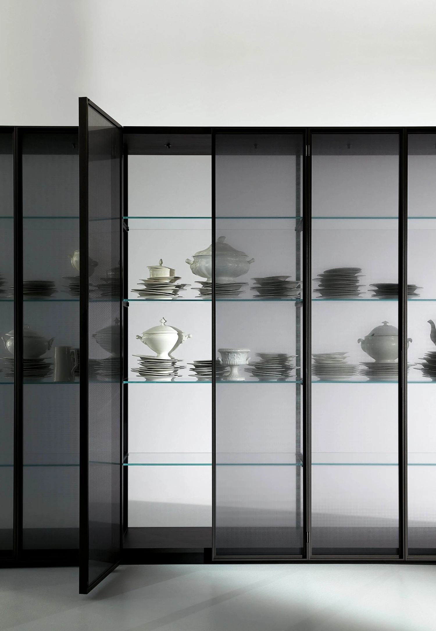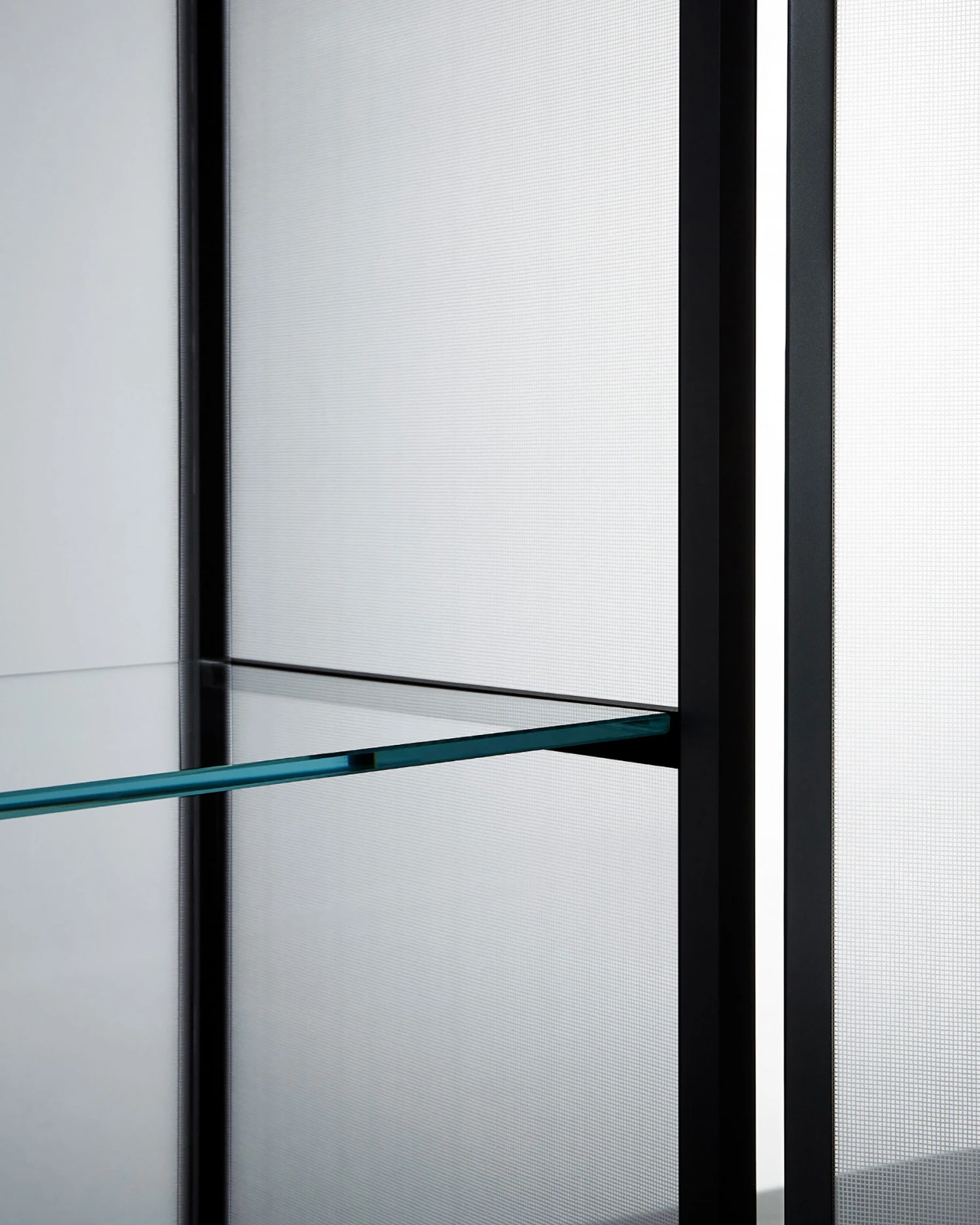 The self-standing structure consists of black painted, cuvée or rosso antico uprights and melamine base unit and top in black sugi, white cherry or white ash. Side panels are in transparent, “smoke”, gray millimetrato or transparent millemetrato glass; while shelves are in extra-light transparent glass. Back panels are in melamine black sugi, white cherry or white ash, in transparent, “smoke”, gray millimetrato or transparent millimetrato glass and in fabric. The composition is closed with the “Iron” doors in transparent, “smoke”, gray millimetrato or smoke millimetrato glass, with a metal profile painted in iron or rosso antico; or Block doors with the same finishes for the glasses and a varnished black profile.