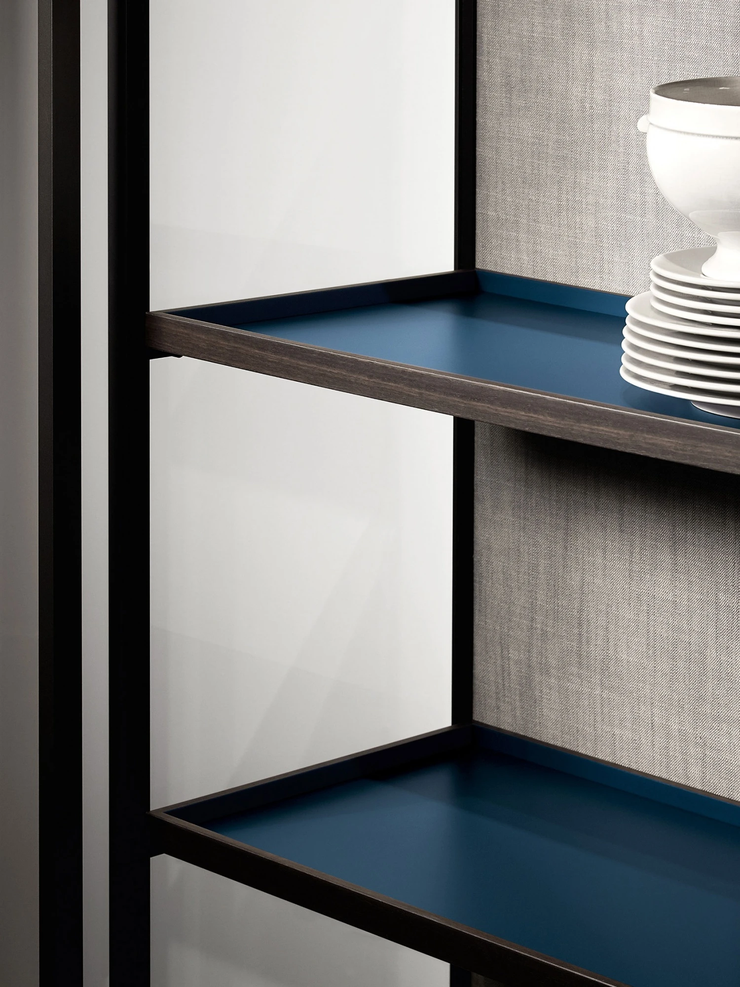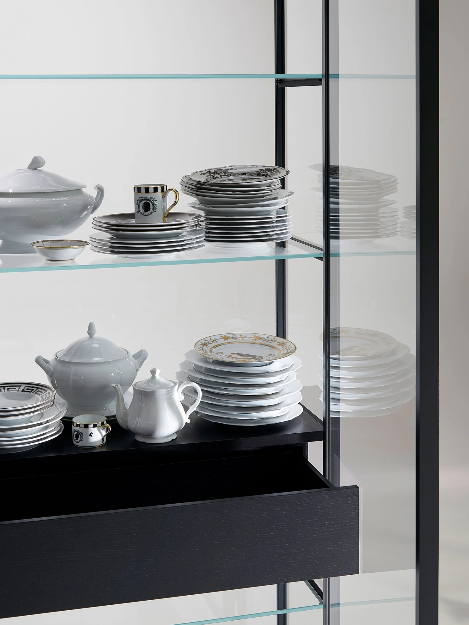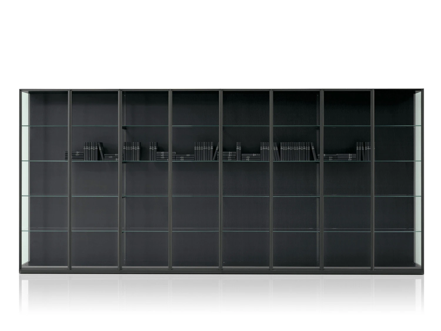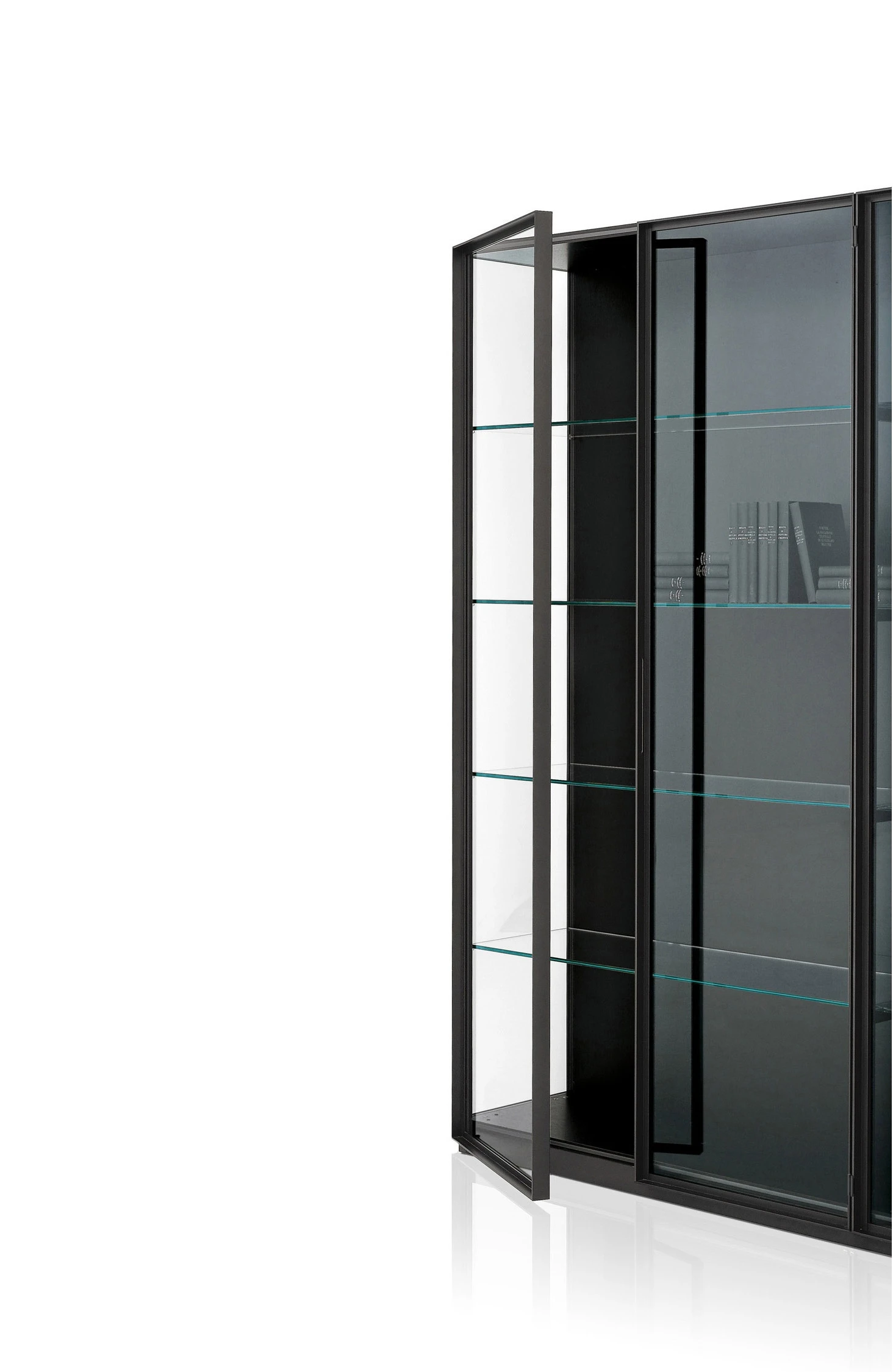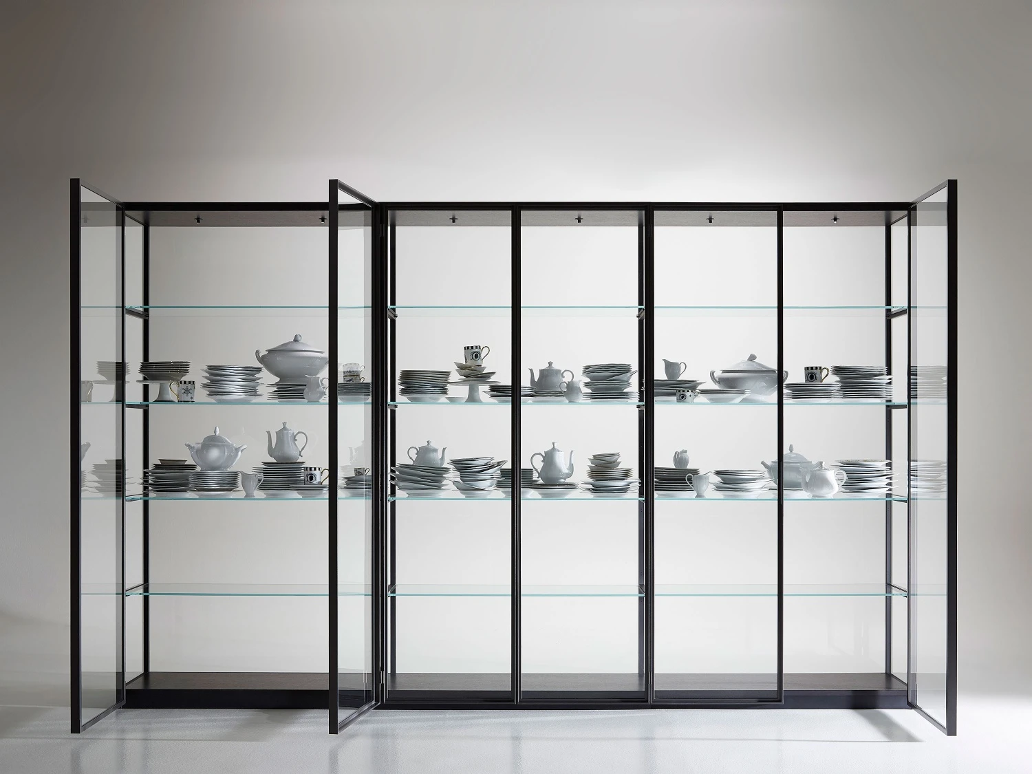 The self-standing structure consists of black painted, cuvée or rosso antico uprights and melamine base unit and top in black sugi, white cherry or white ash. Side panels are in transparent, “smoke”, gray millimetrato or transparent millemetrato glass; while shelves are in extra-light transparent glass. Back panels are in melamine black sugi, white cherry or white ash, in transparent, “smoke”, gray millimetrato or transparent millimetrato glass and in fabric. The composition is closed with the “Iron” doors in transparent, “smoke”, gray millimetrato or smoke millimetrato glass, with a metal profile painted in iron or rosso antico; or Block doors with the same finishes for the glasses and a varnished black profile.