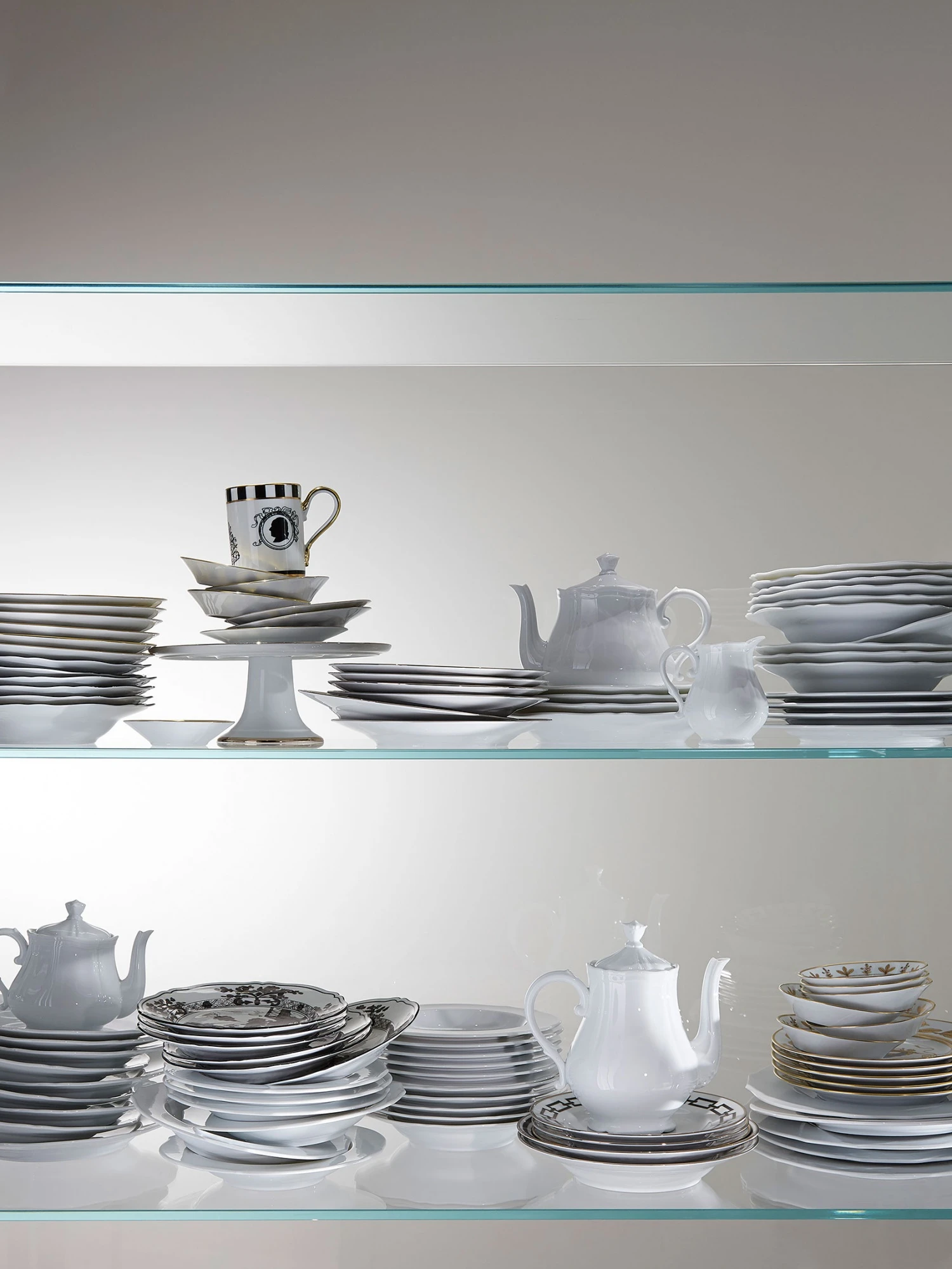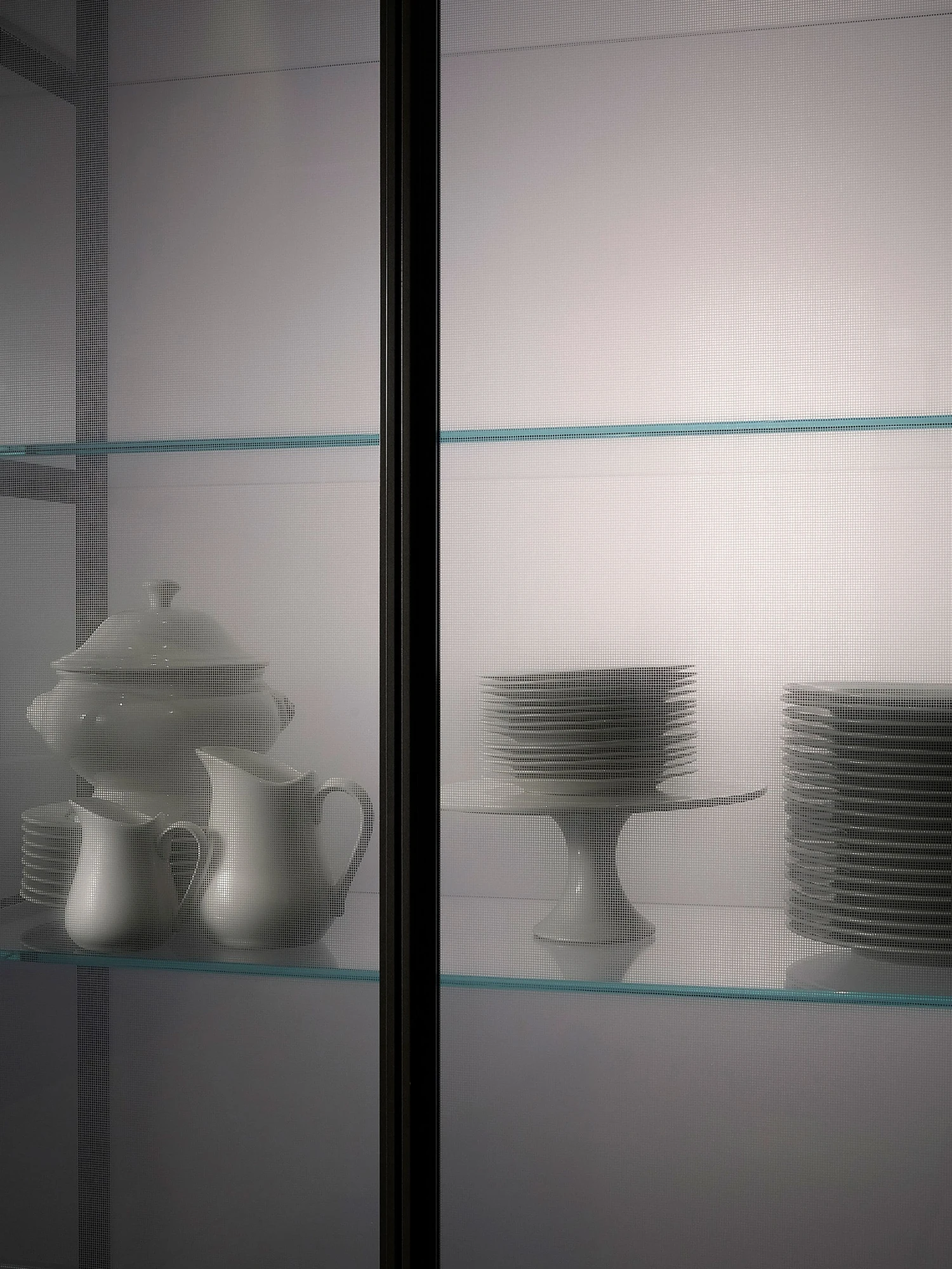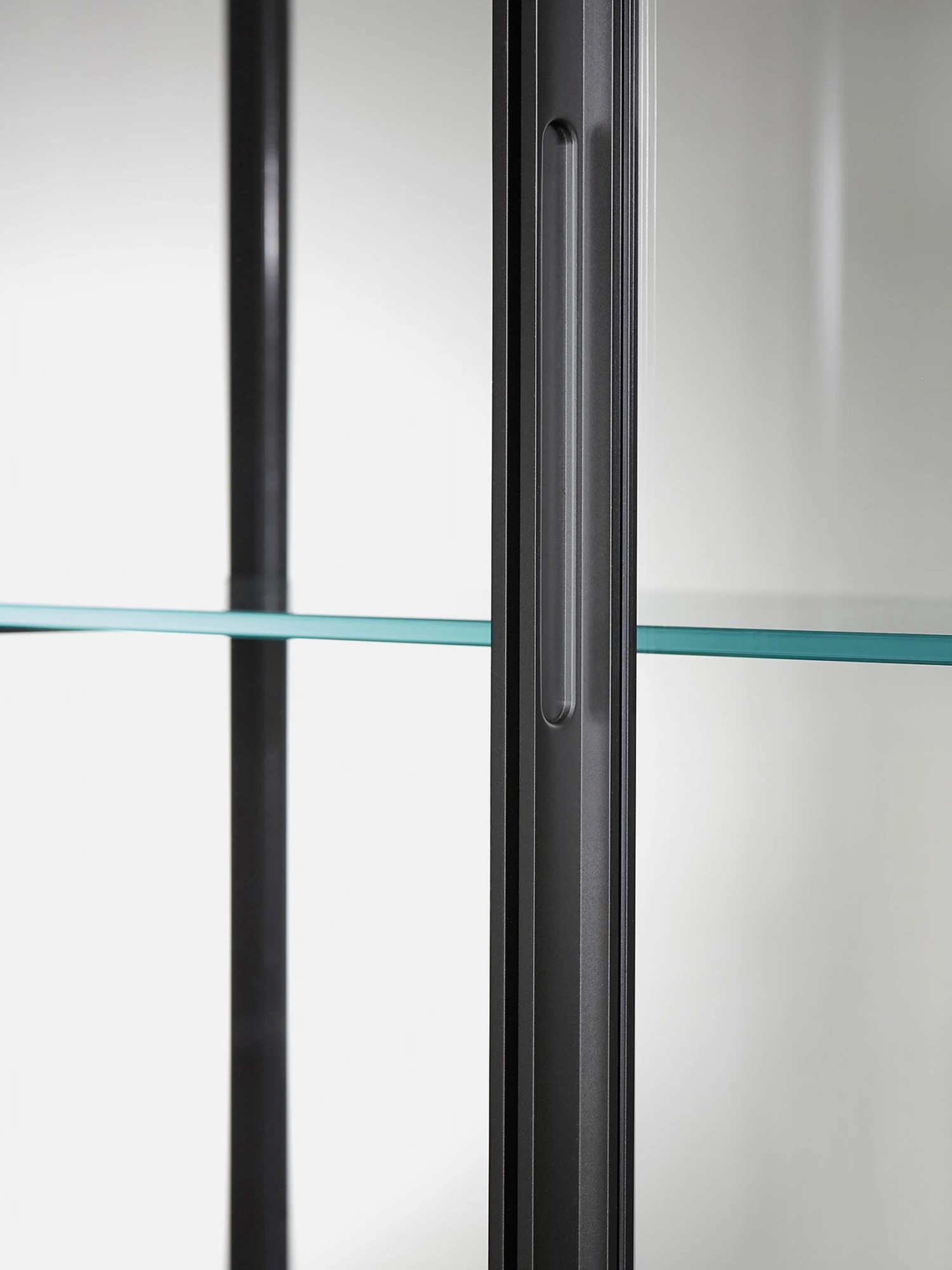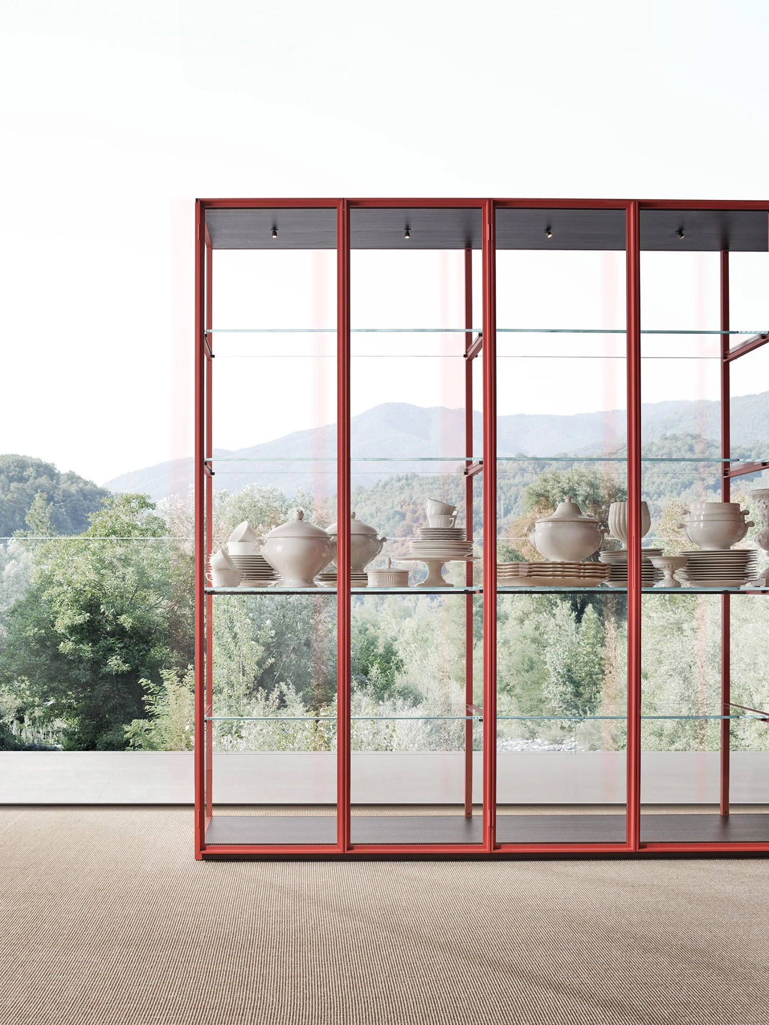 The self-standing structure consists of black painted, cuvée or rosso antico uprights and melamine base unit and top in black sugi, white cherry or white ash. Side panels are in transparent, “smoke”, gray millimetrato or transparent millemetrato glass; while shelves are in extra-light transparent glass. Back panels are in melamine black sugi, white cherry or white ash, in transparent, “smoke”, gray millimetrato or transparent millimetrato glass and in fabric. The composition is closed with the “Iron” doors in transparent, “smoke”, gray millimetrato or smoke millimetrato glass, with a metal profile painted in iron or rosso antico; or Block doors with the same finishes for the glasses and a varnished black profile.