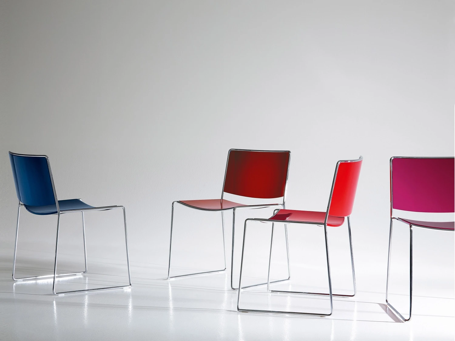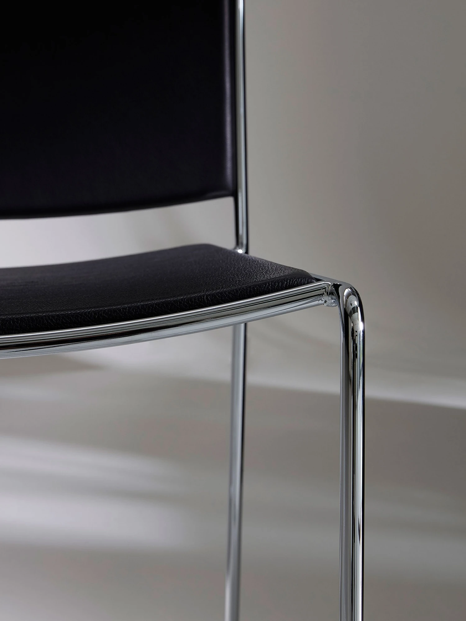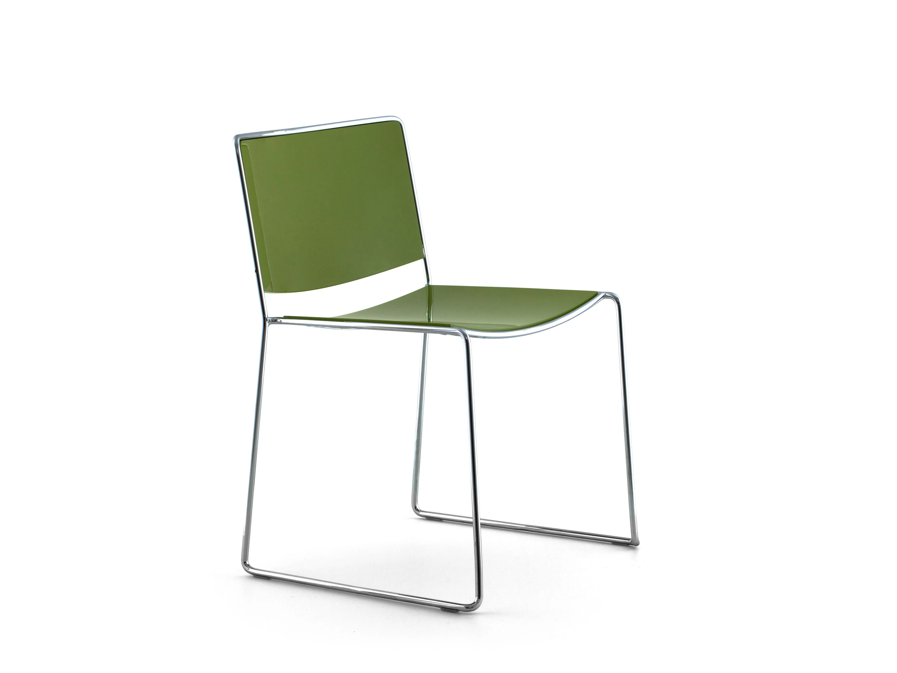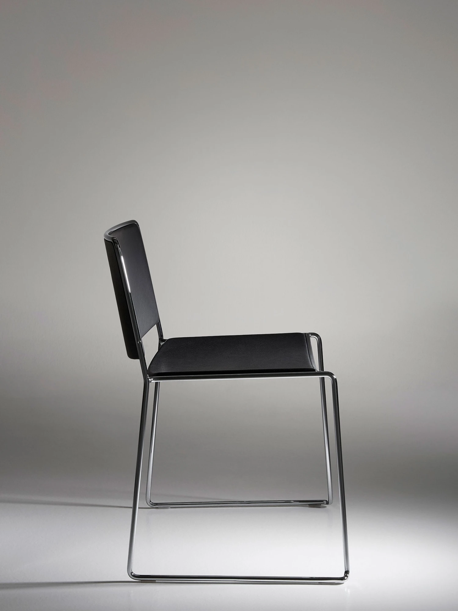 Extremely resistant, stackable, equally suitable for workplaces, homes and communities, Spindle is made of extra – small section chromium–plated wire. The great lightness of the design and of the material is enhanced by the surfaces of the seat and of the back: two shelves of curved plywood. Made also in the stool version, is available in all glossy colours of our collection, in leather, eco-leather or Nabuk.