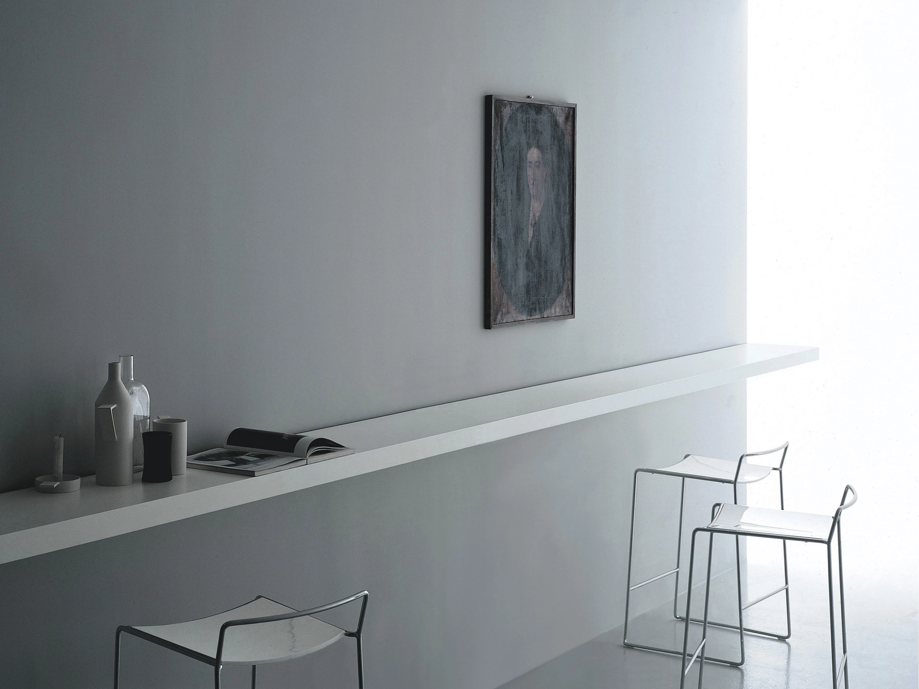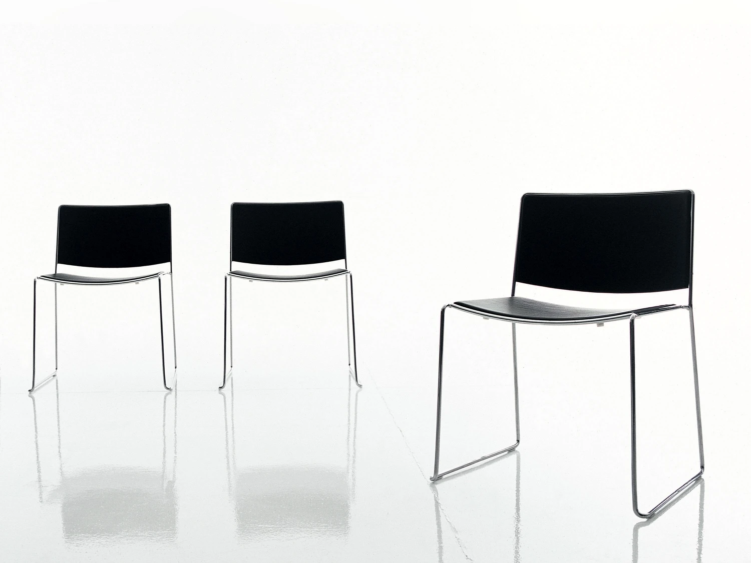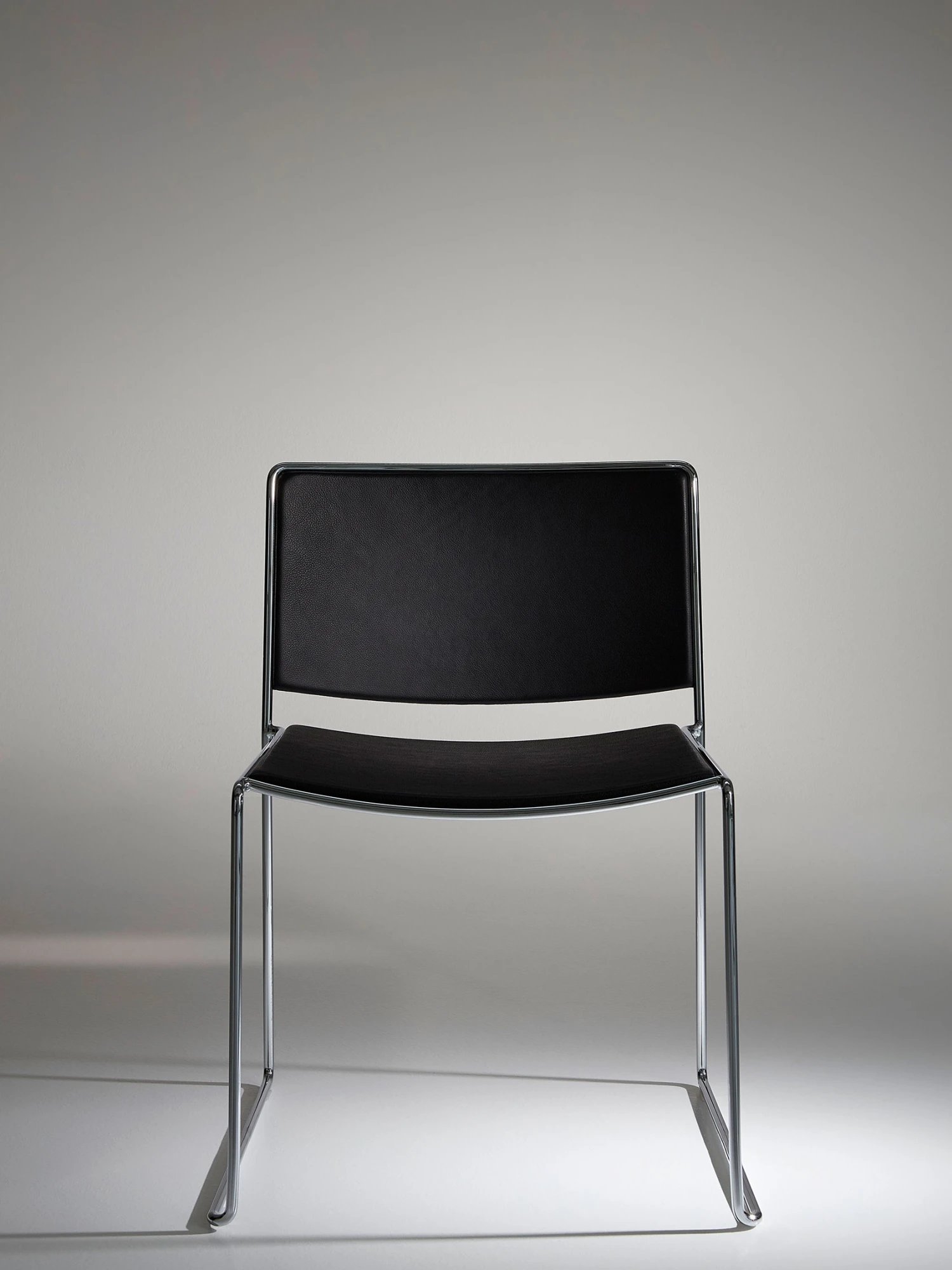 Extremely resistant, stackable, equally suitable for workplaces, homes and communities, Spindle is made of extra – small section chromium–plated wire. The great lightness of the design and of the material is enhanced by the surfaces of the seat and of the back: two shelves of curved plywood. Made also in the stool version, is available in all glossy colours of our collection, in leather, eco-leather or Nabuk.