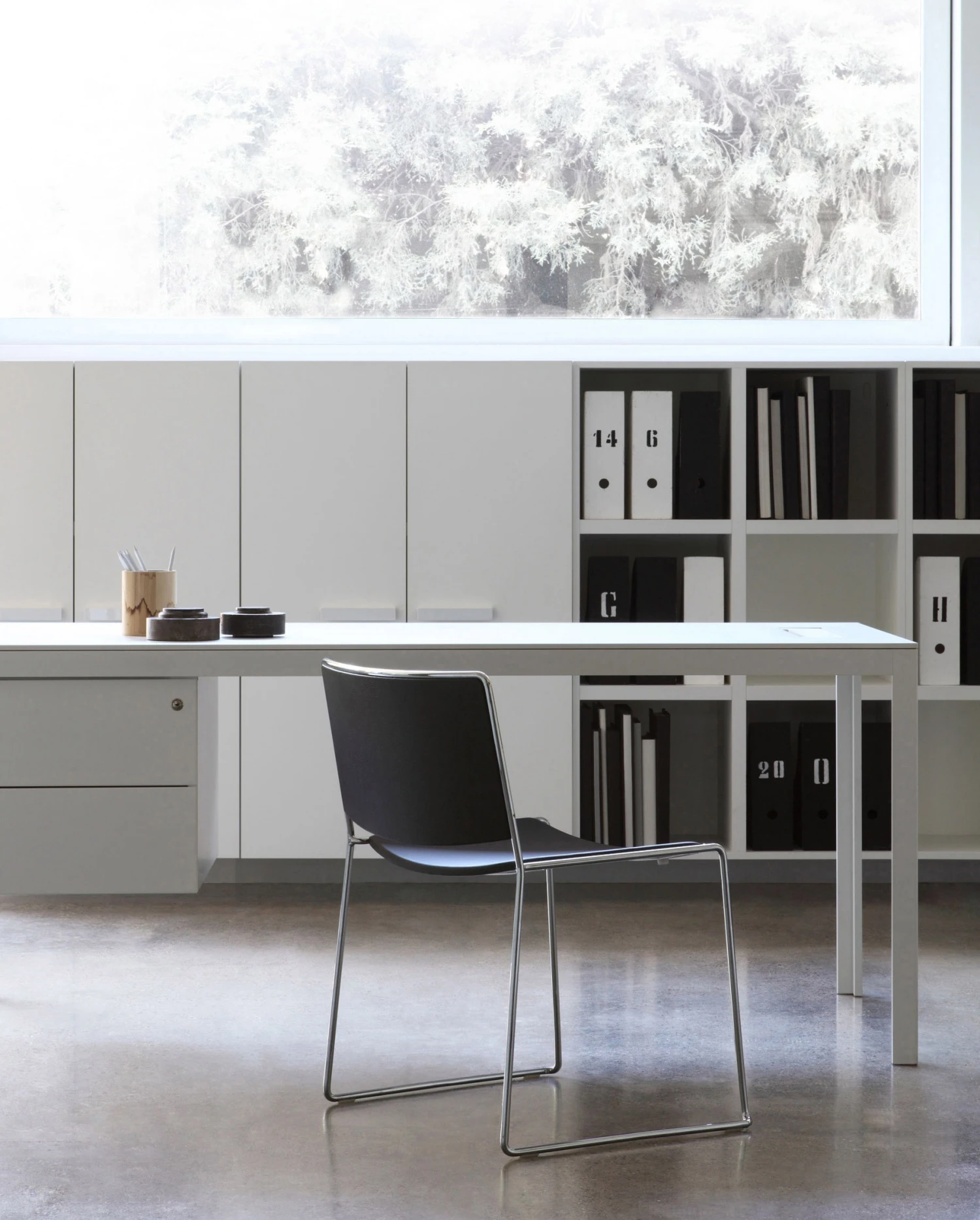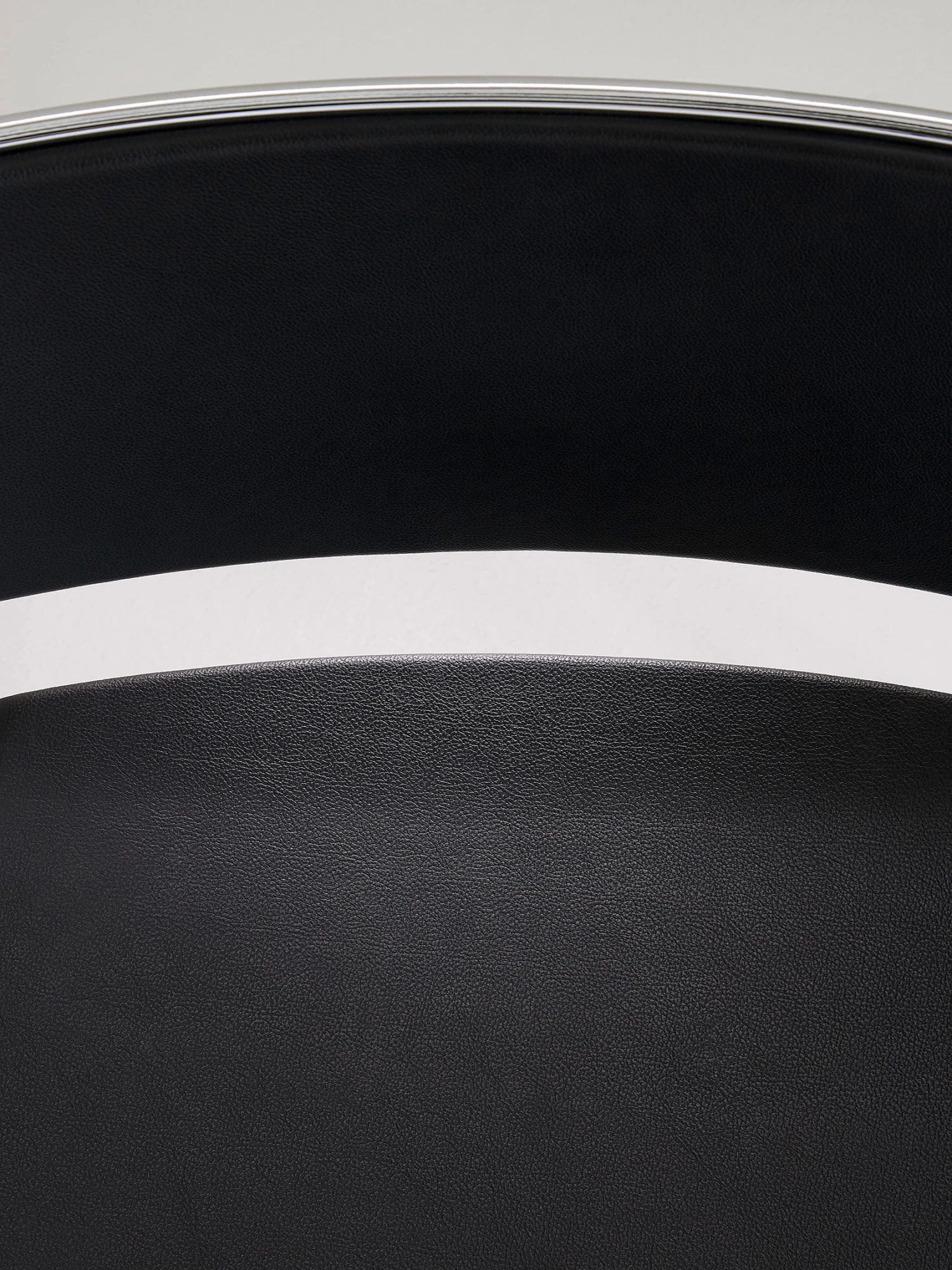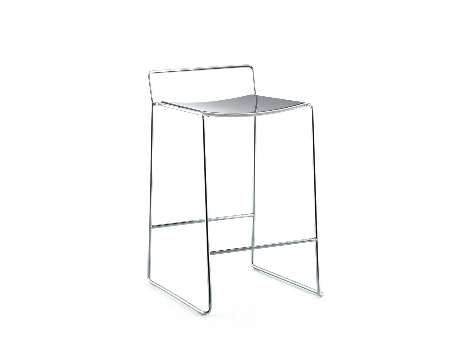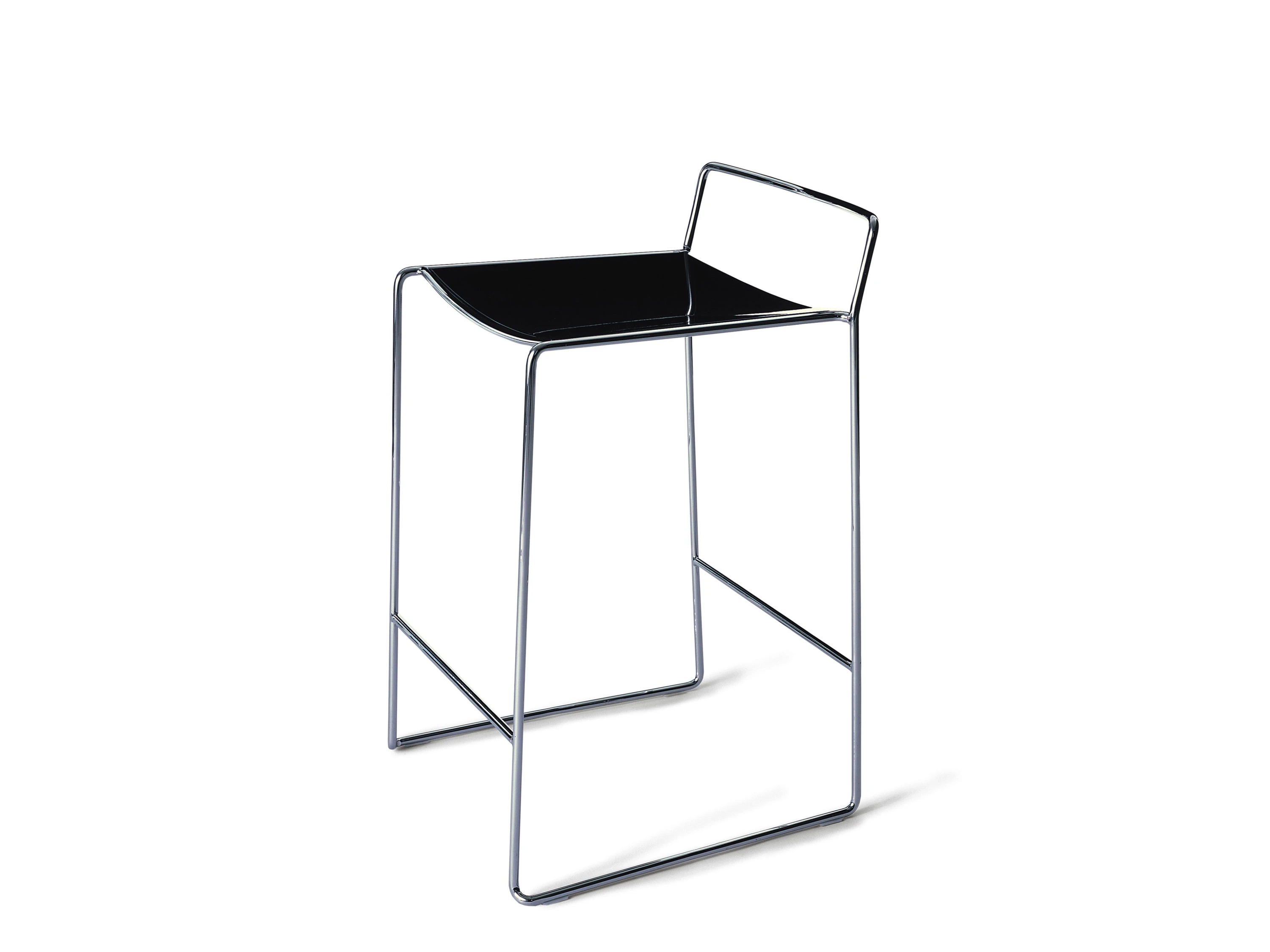 Extremely resistant, stackable, equally suitable for workplaces, homes and communities, Spindle is made of extra – small section chromium–plated wire. The great lightness of the design and of the material is enhanced by the surfaces of the seat and of the back: two shelves of curved plywood. Made also in the stool version, is available in all glossy colours of our collection, in leather, eco-leather or Nabuk.