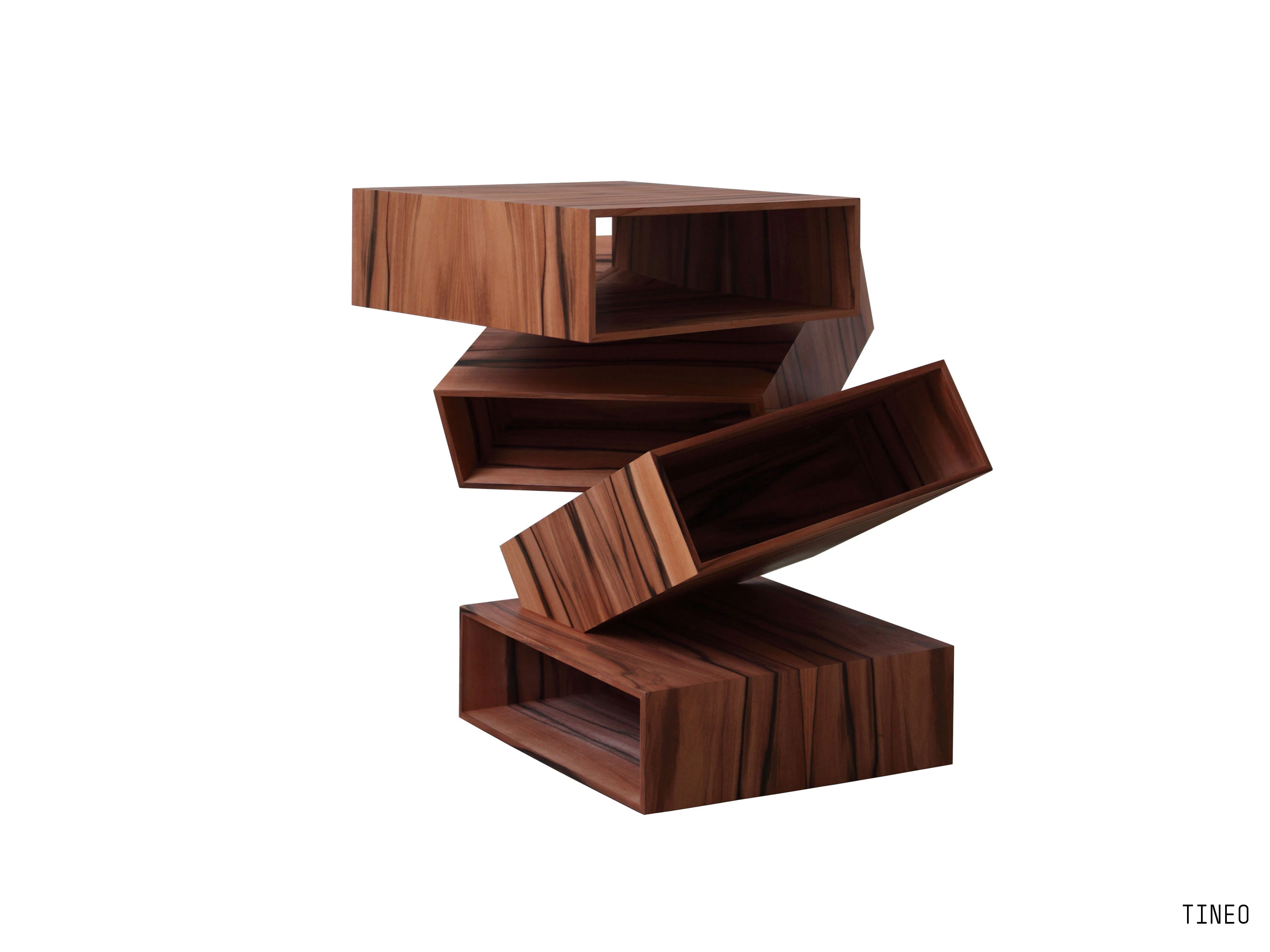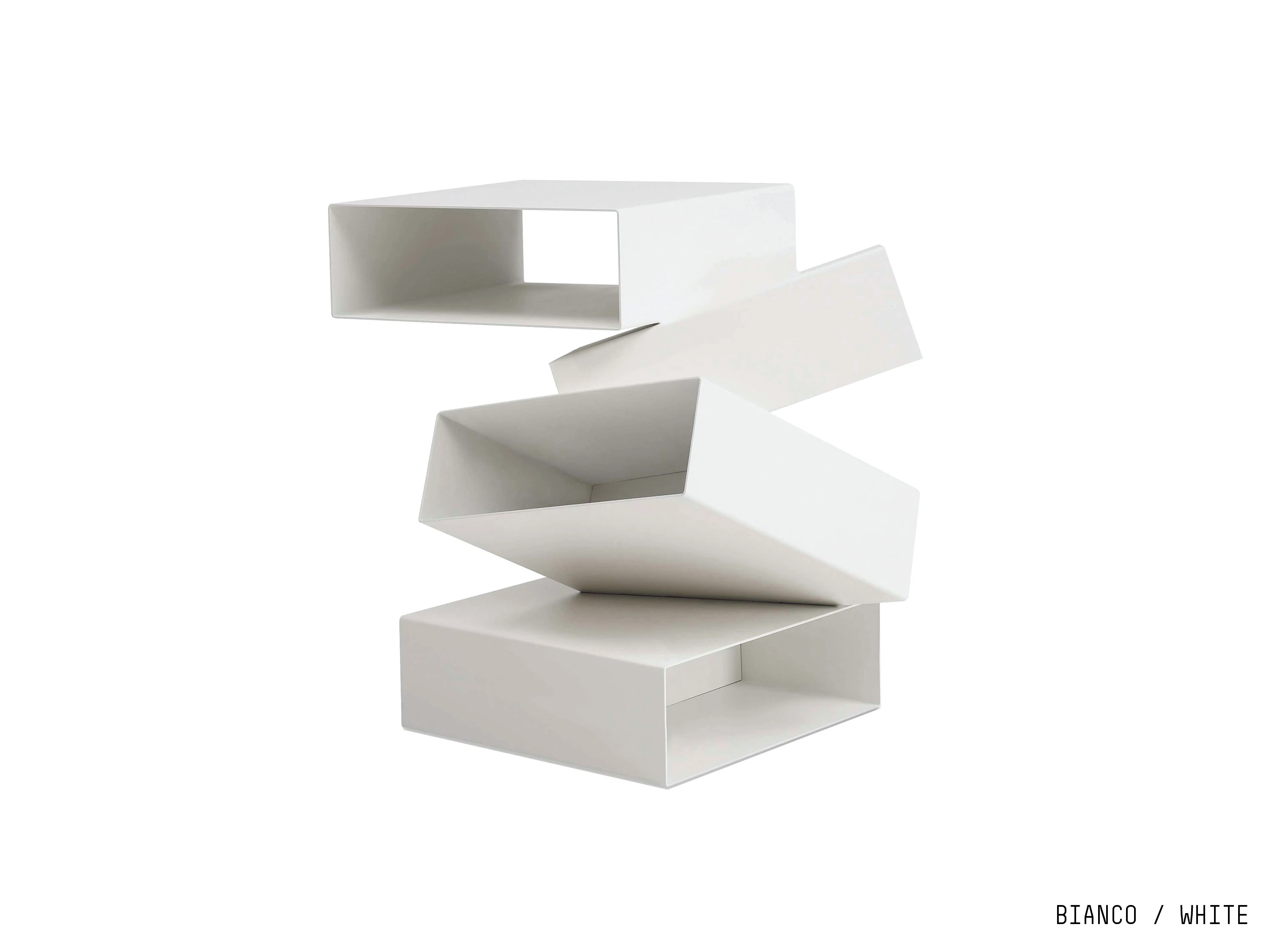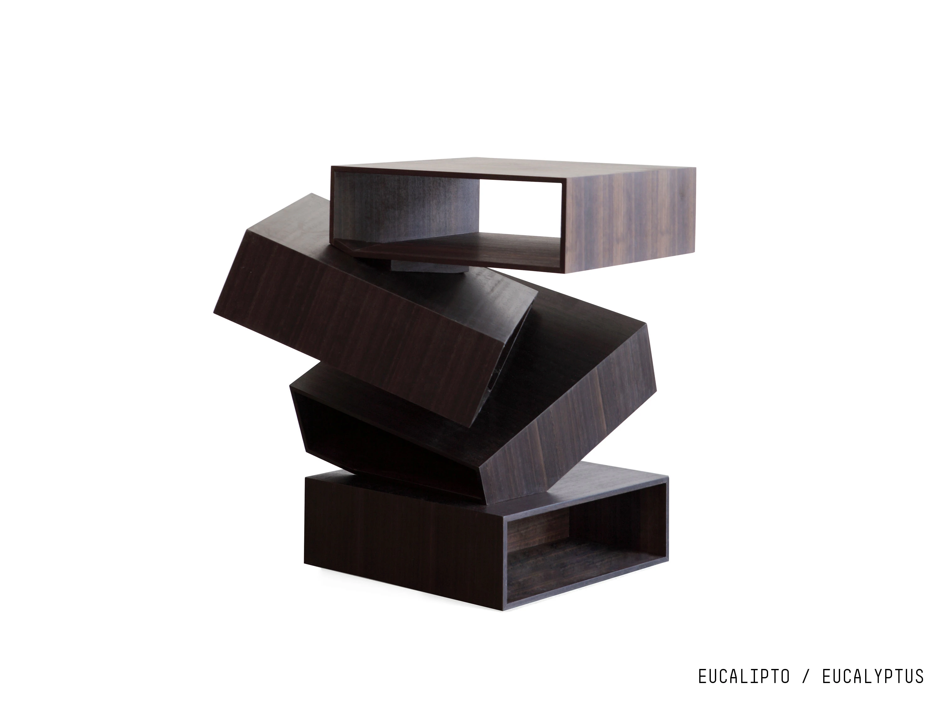 Balancing Boxes is a small table consisting of a series of irregularly overlapping white or black painted metal or in wood (eucalyptus, palissandro santos, red gum and tineo finishings) boxes, as though balancing in space. Inclinations, interconnections and a multifaceted image, giving different sensations as we look at it from different angles.