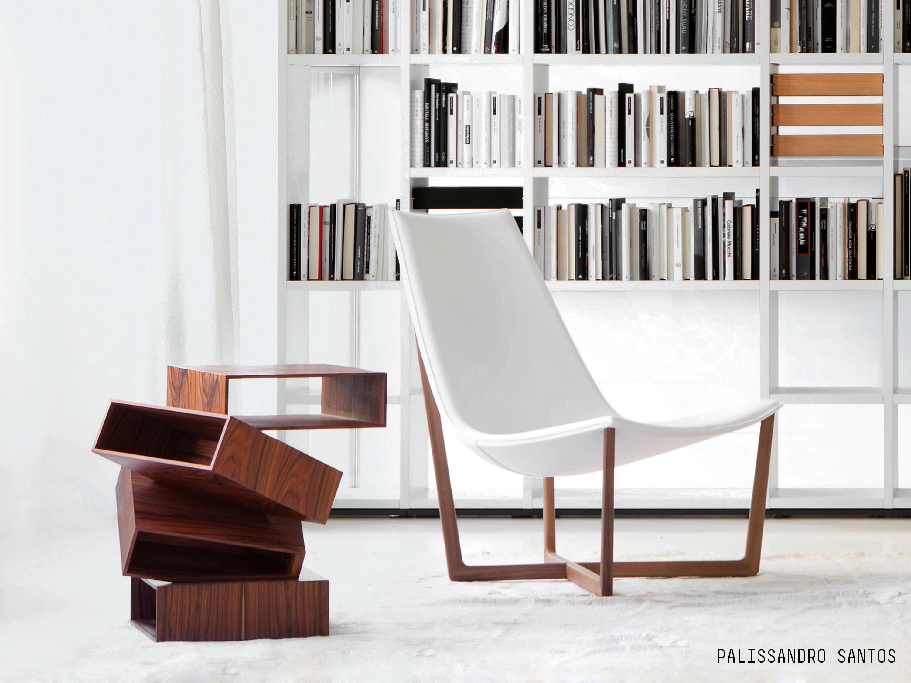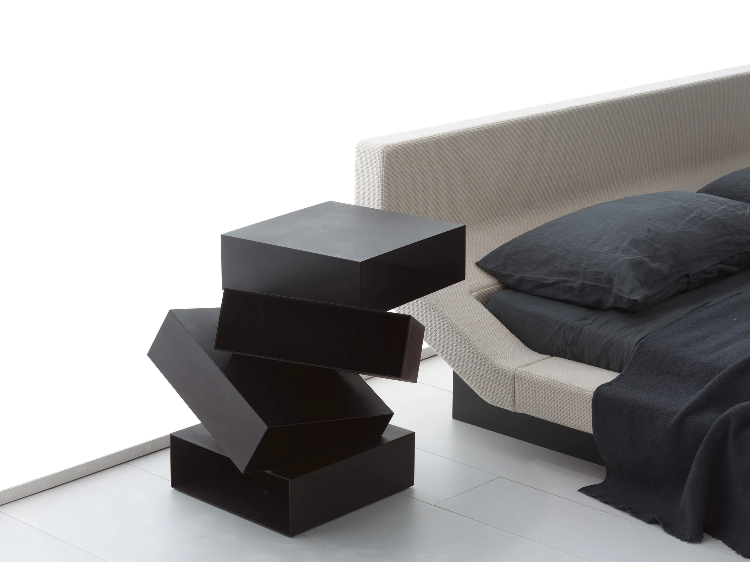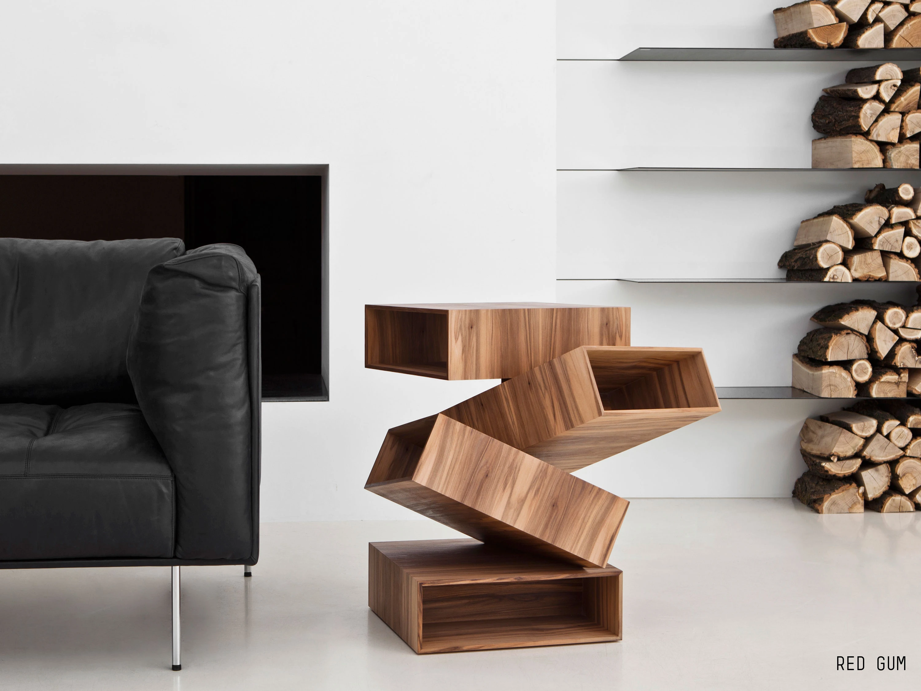Balancing Boxes is a small table consisting of a series of irregularly overlapping white or black painted metal or in wood (eucalyptus, palissandro santos, red gum and tineo finishings) boxes, as though balancing in space. Inclinations, interconnections and a multifaceted image, giving different sensations as we look at it from different angles.