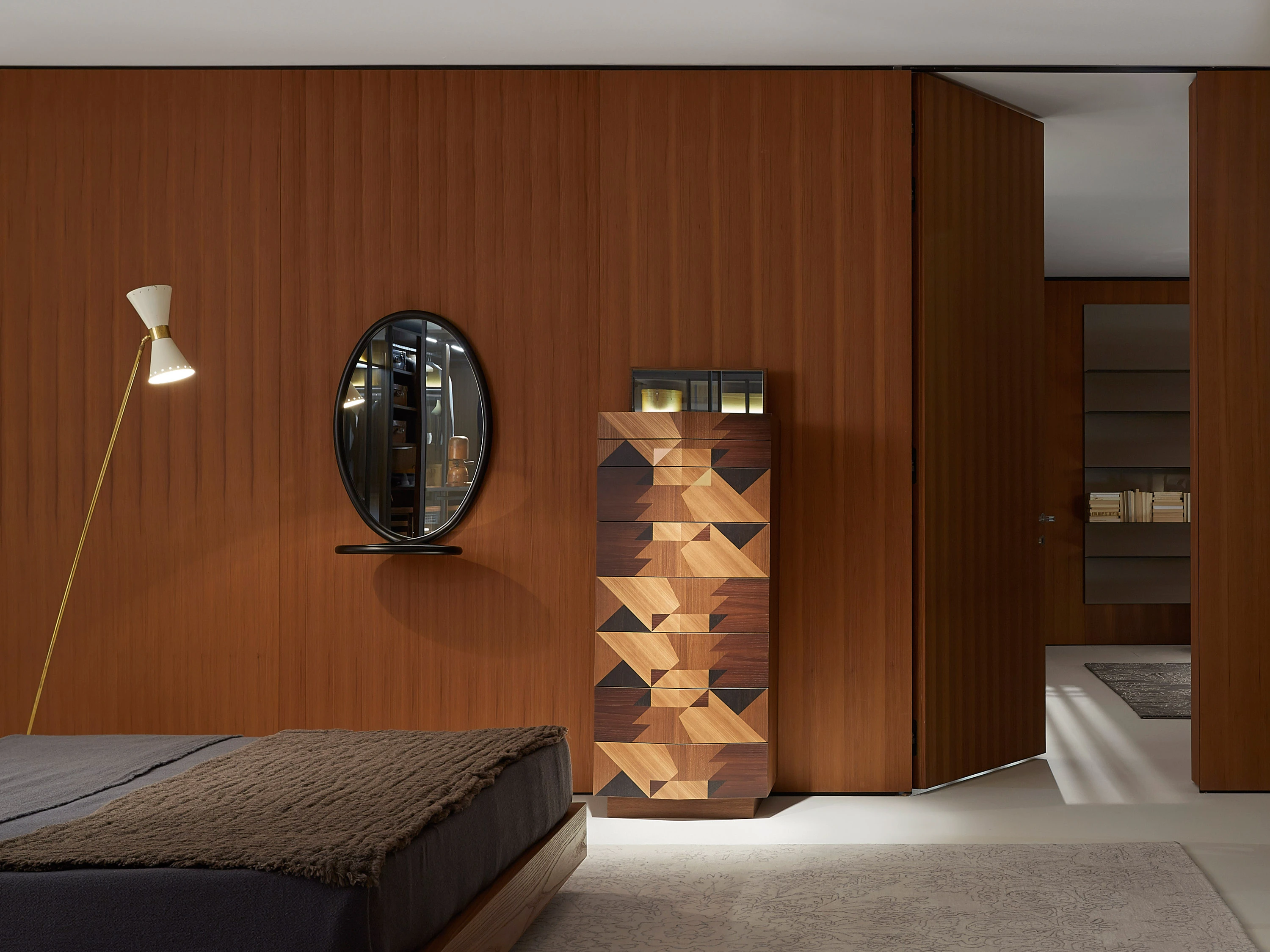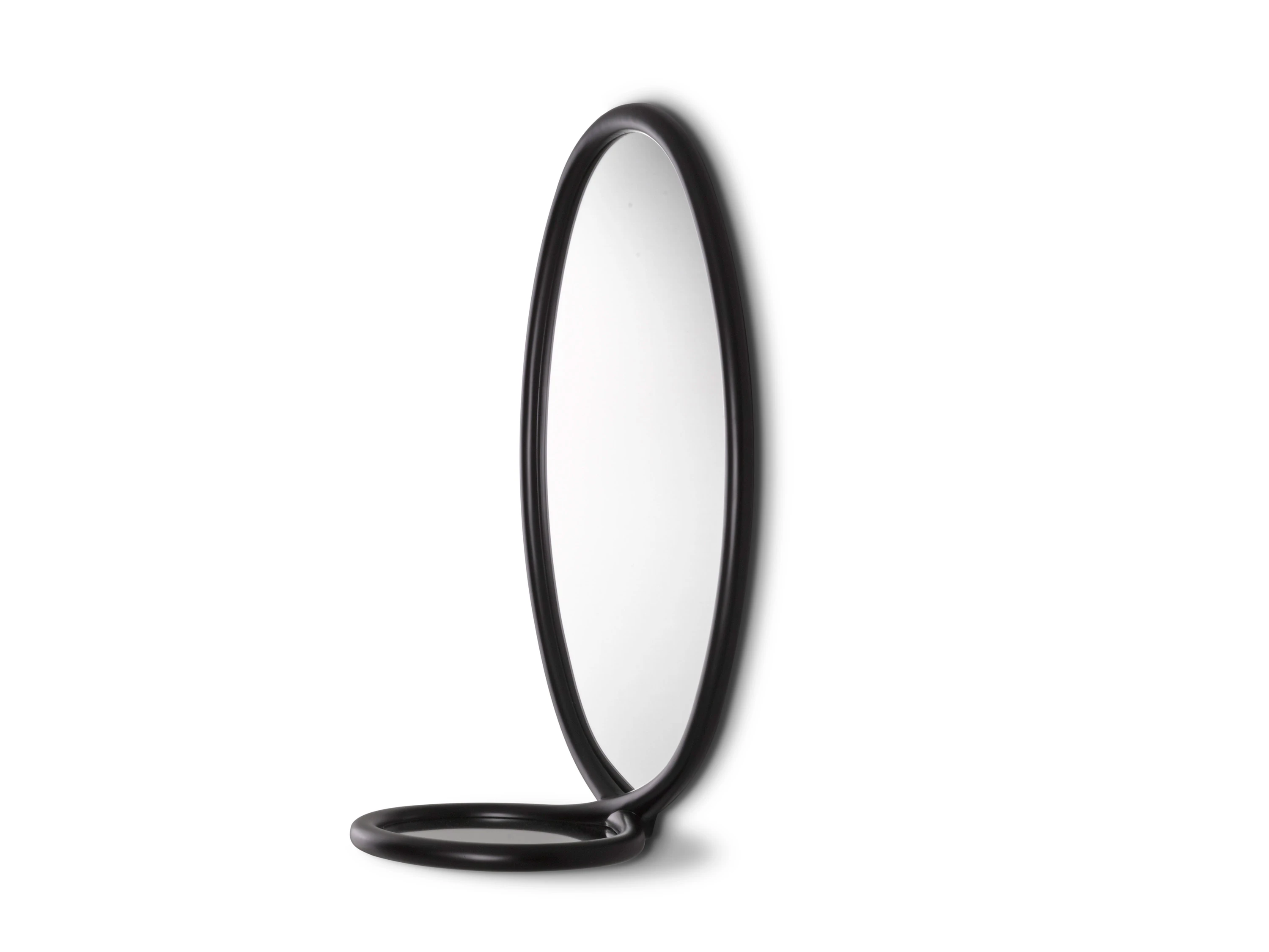 A contemporary reinterpretation of the art of wood carving, Loop Mirror is a true wooden sculpture, a precious object in which one can reflect oneself and which one can contemplate, rendered unique by the small imperfections of handcrafting which lends it value. Its wooden frame is knotted to create a loop, a protruding shelf which becomes a refined decorative detail tracing in the space the symbol of infinity. Cultured inspirations, arts&crafts influences, the magic of the impossible, a play of infinite distortions and reflexes for a product which recalls slower rhythms outside time, involving the senses and the sentiments.