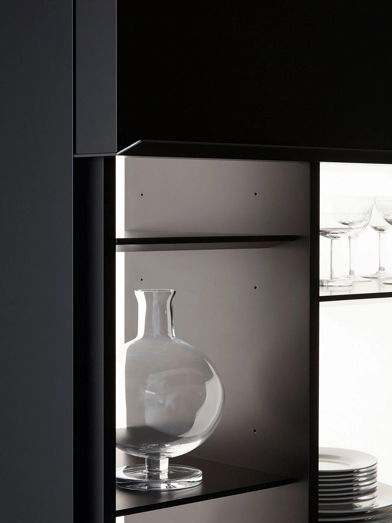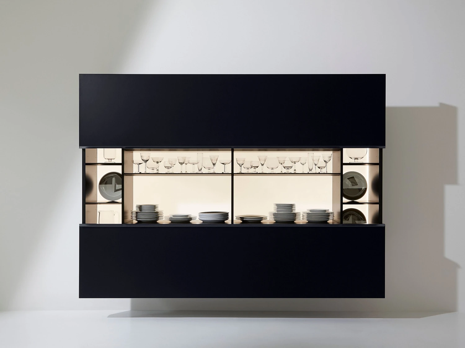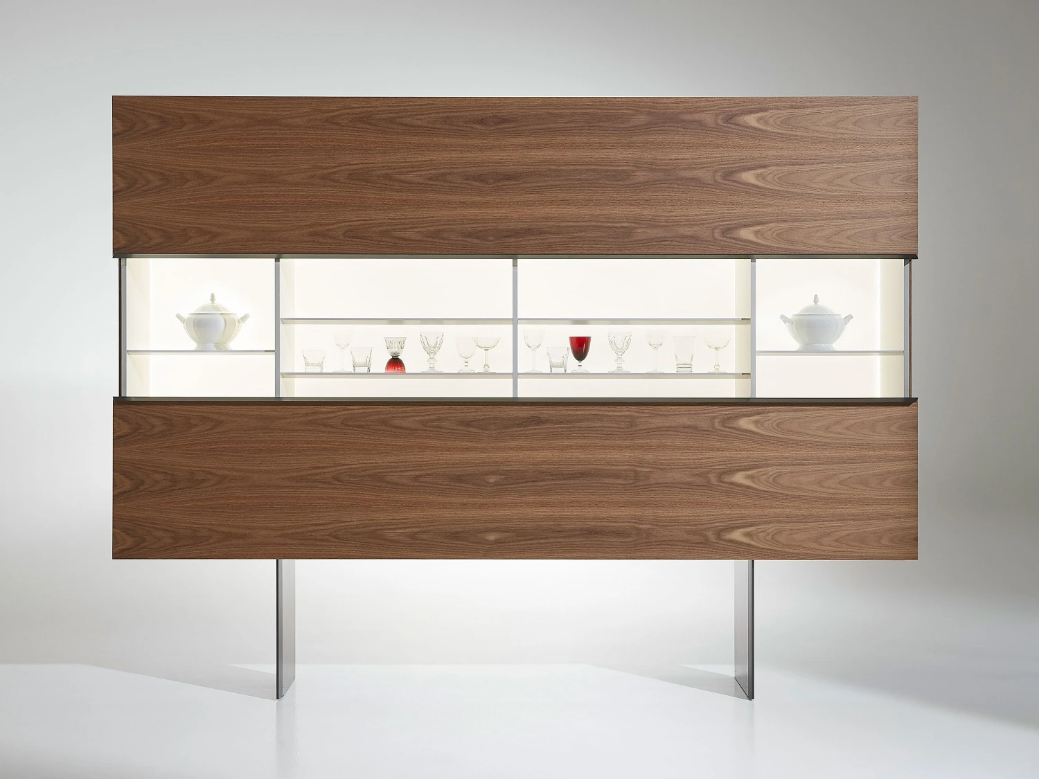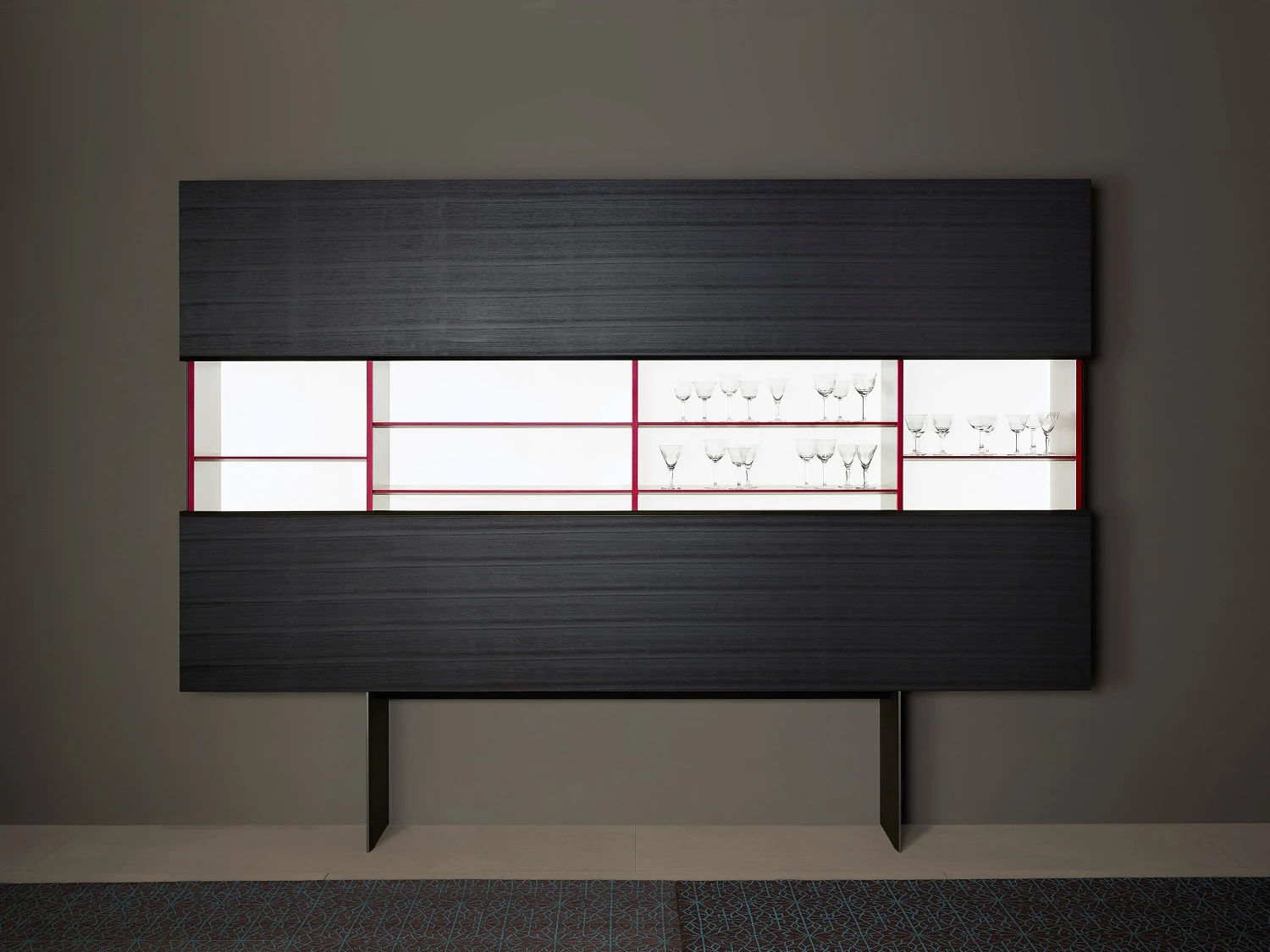 Its main feature are the two doors that, sliding upwards and downwards, reveal a rich and functional interior space, ideal for storing valuable tableware.