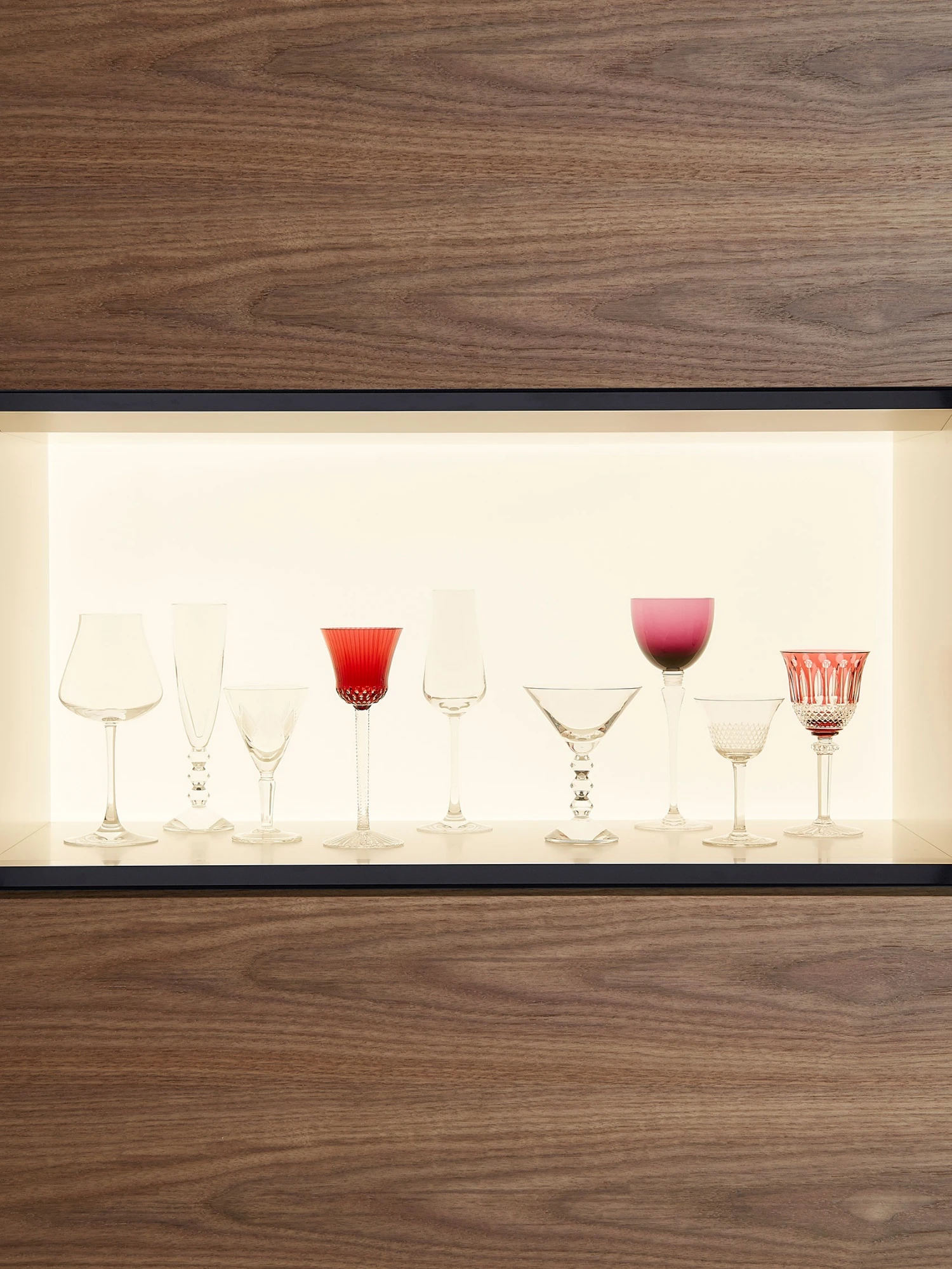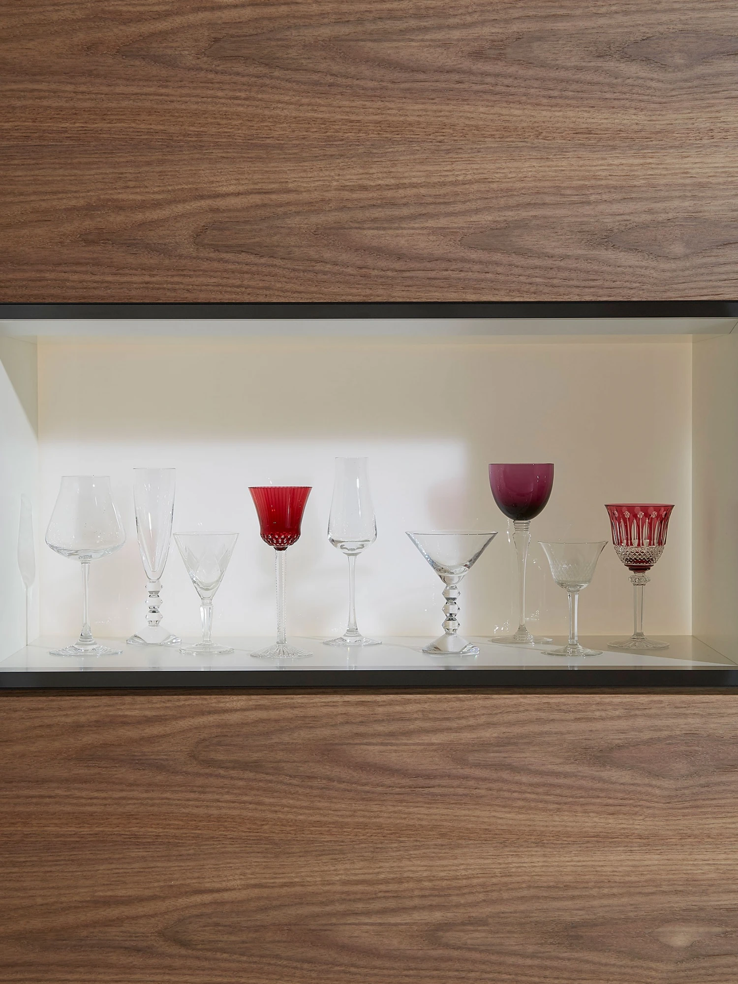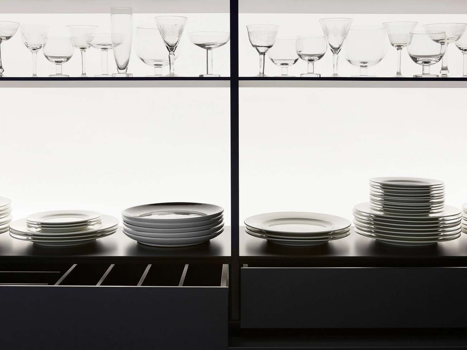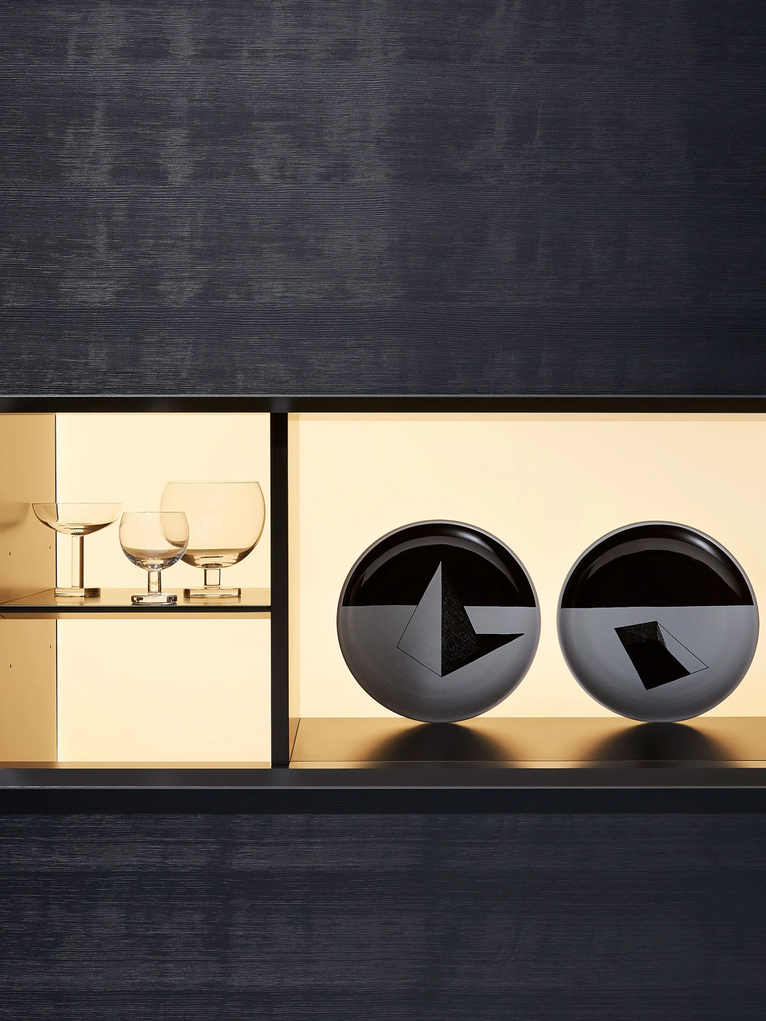 Its main feature are the two doors that, sliding upwards and downwards, reveal a rich and functional interior space, ideal for storing valuable tableware.