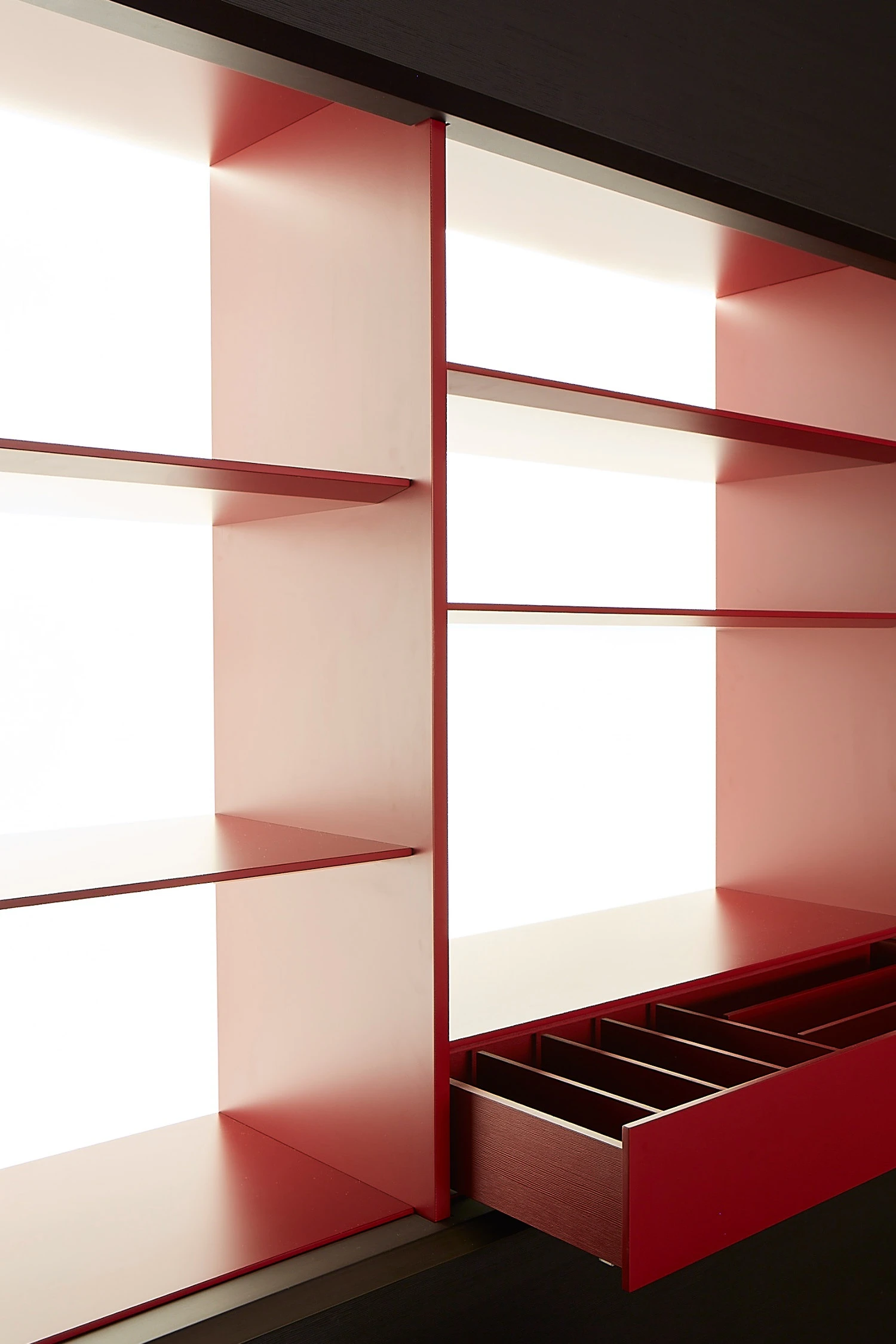 The appeal of this sideboard is also the peculiar effect created by the lighted back panel (optional) that highlights the internal matt lacquered shelves, available in one of the colors of the collection.