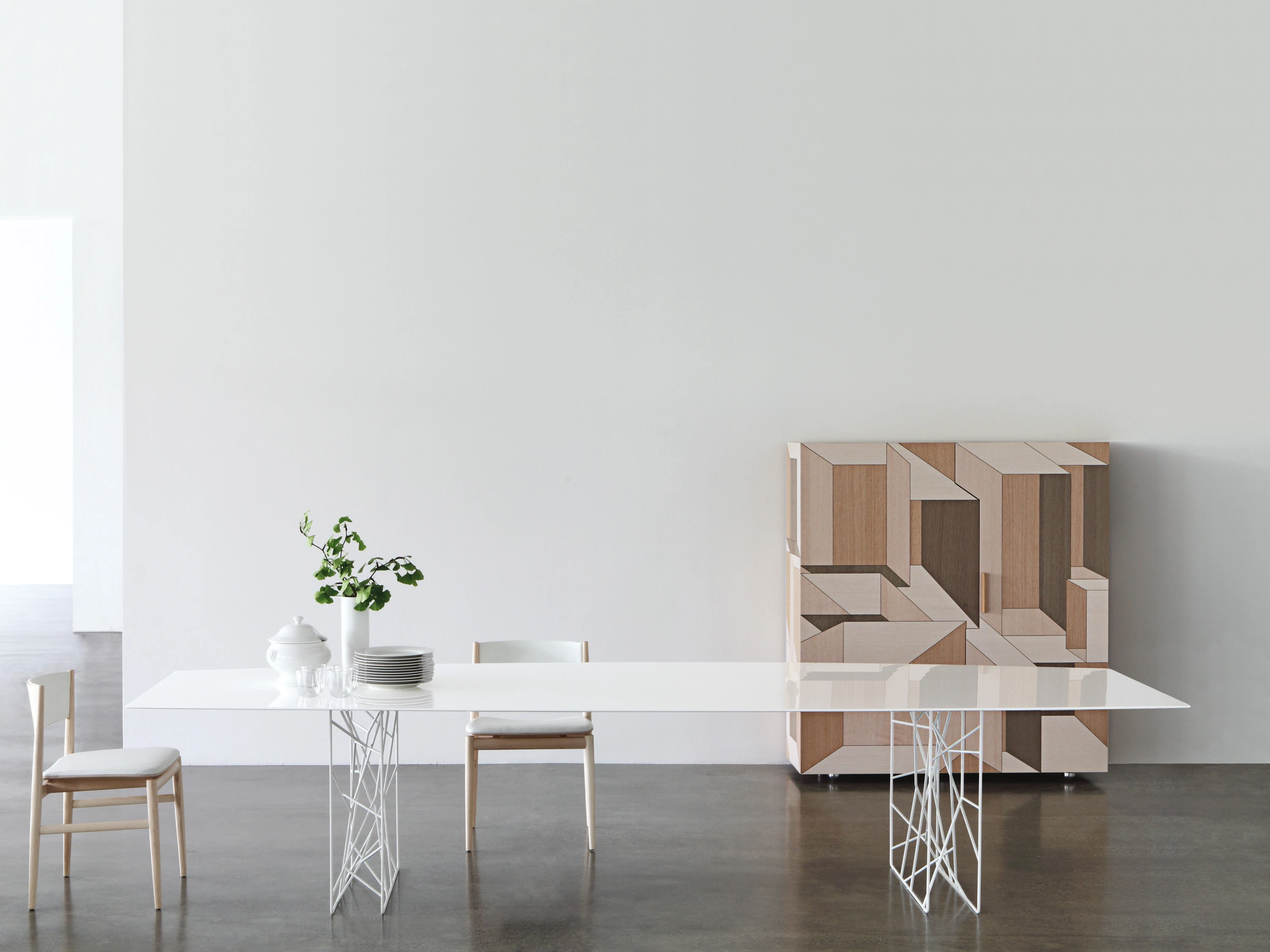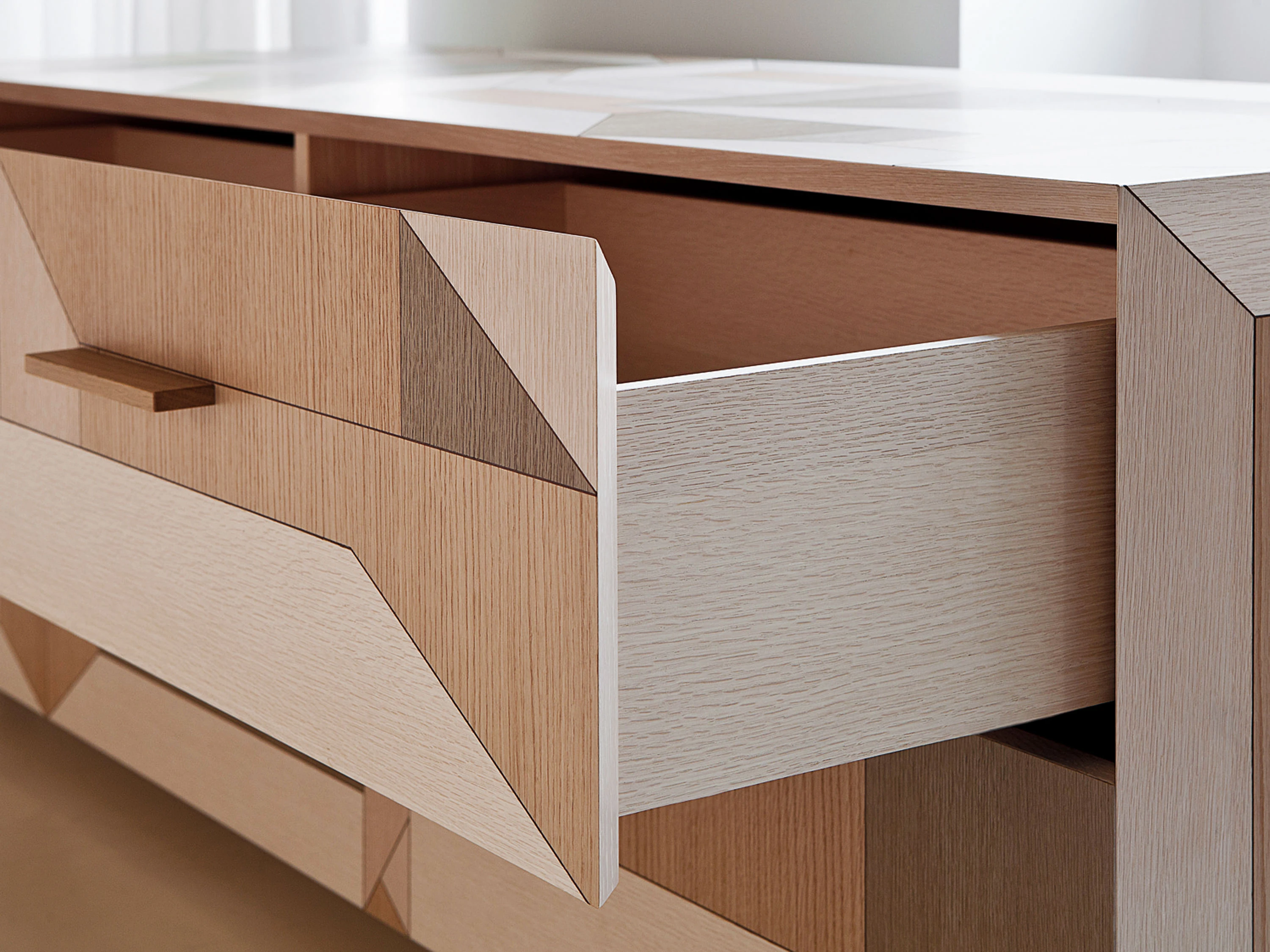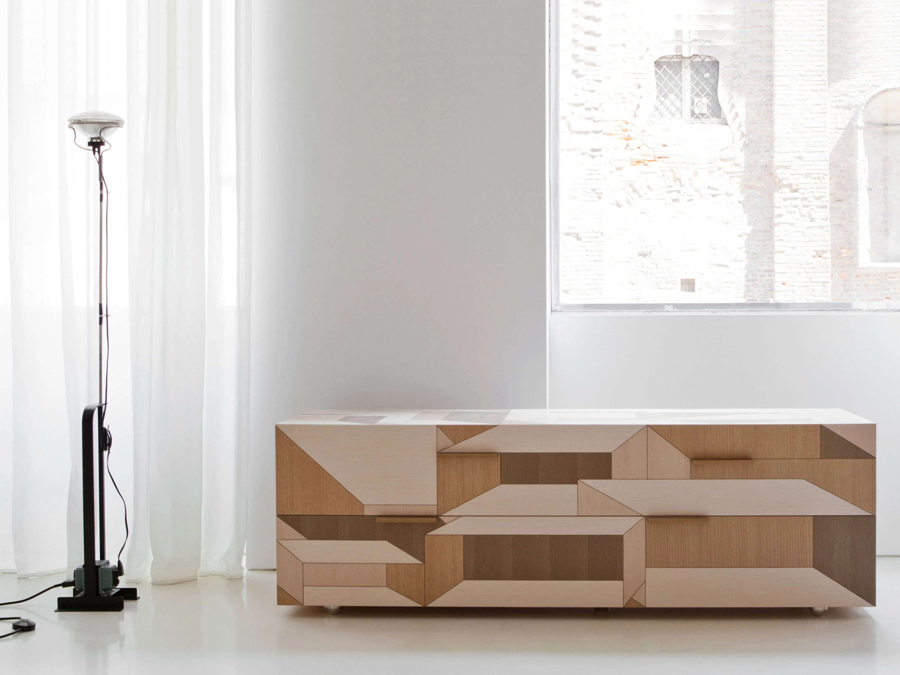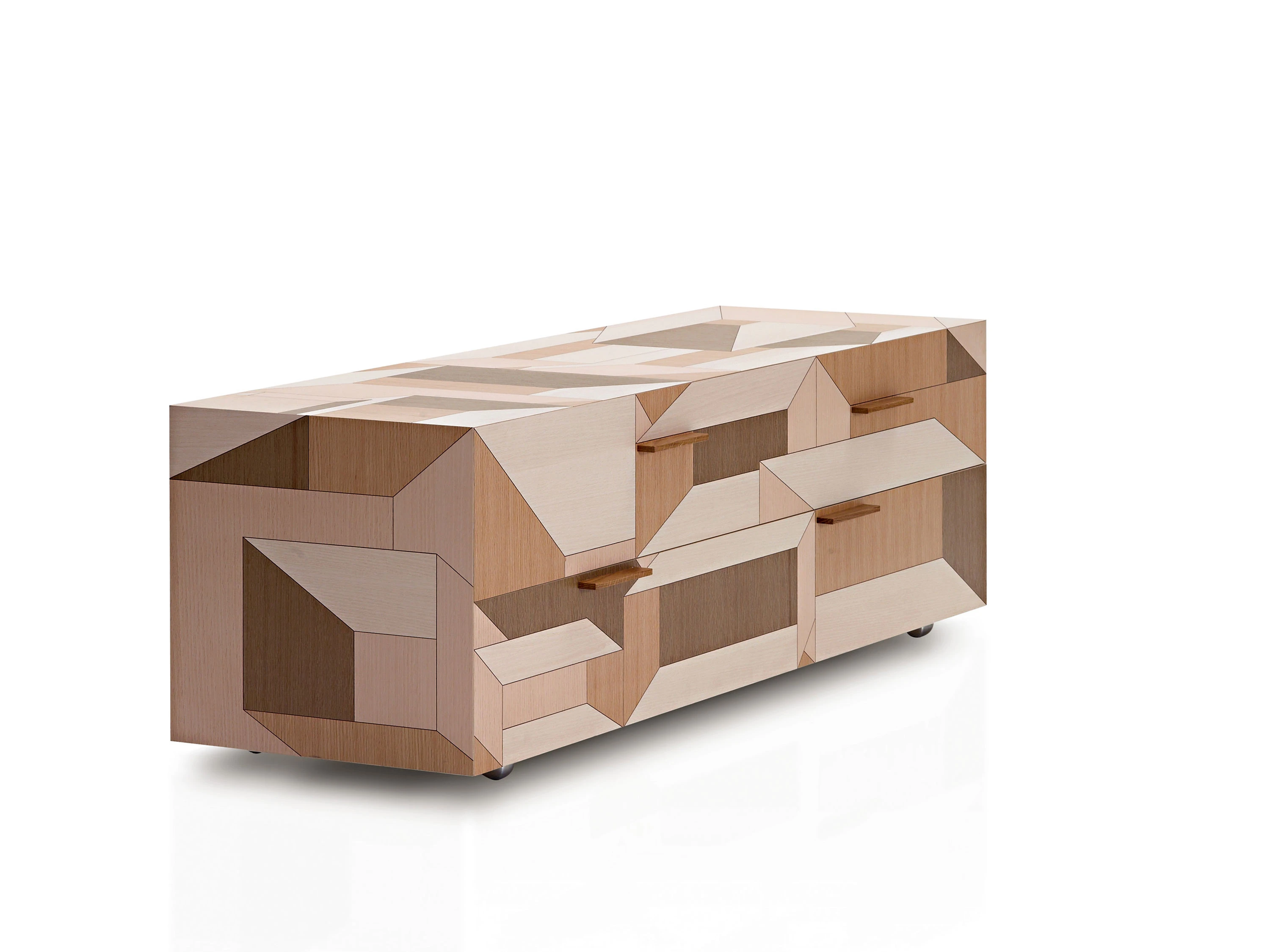 Inlay entirely recovers the inlay technique, an ancient and precious old time tradition. The product is available in two models: a sideboard for the sitting room and a chest of drawers with 2 drawers, covered with a decoration recalling parallelepipeds crossed in space, leading to a unique 3 D effect. Inlay is the result of an accurate processing technique, with 4 different oak colours and a black profile: a contour line separating the different faces of the texture while defining the design. The sideboard exhibits a unique asymmetrical opening and it is internally fitted with simple shelves and separators. The chest of drawers exhibits 2 drawers, fitted with 2 internal trays and a single front. The Inlay handles are in solid oak; the interior of sideboard and chest of drawer is in natural oak.