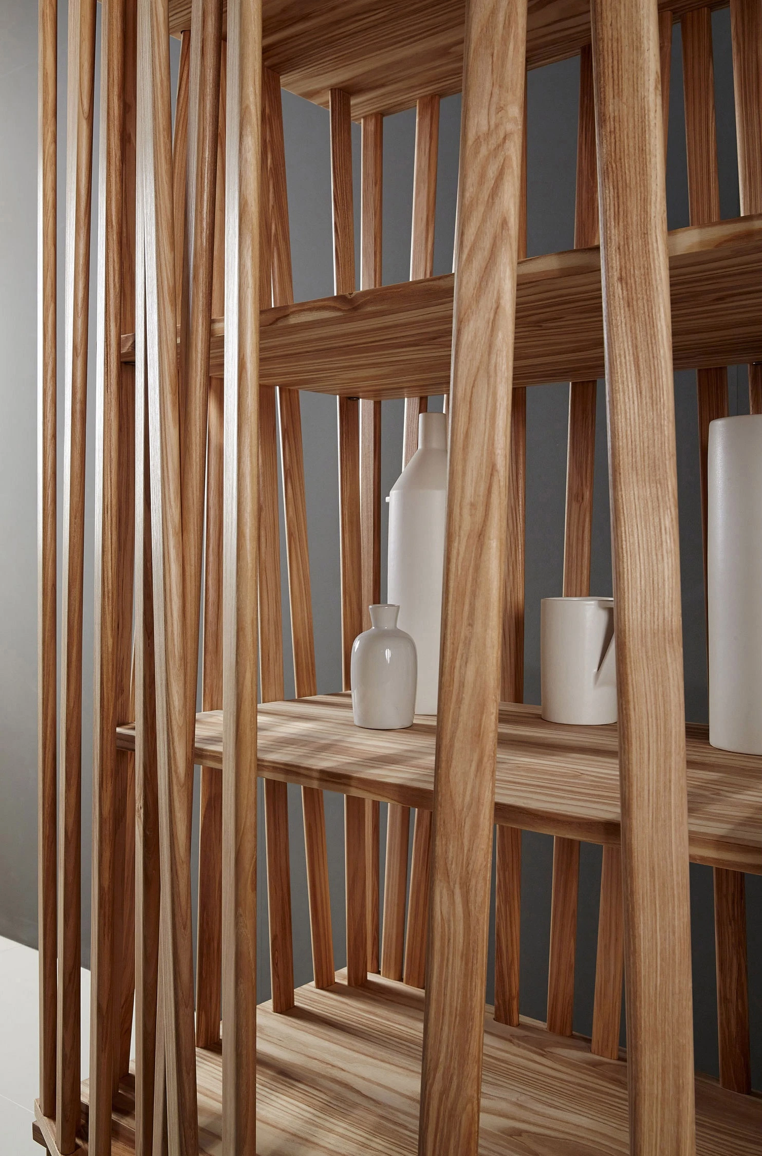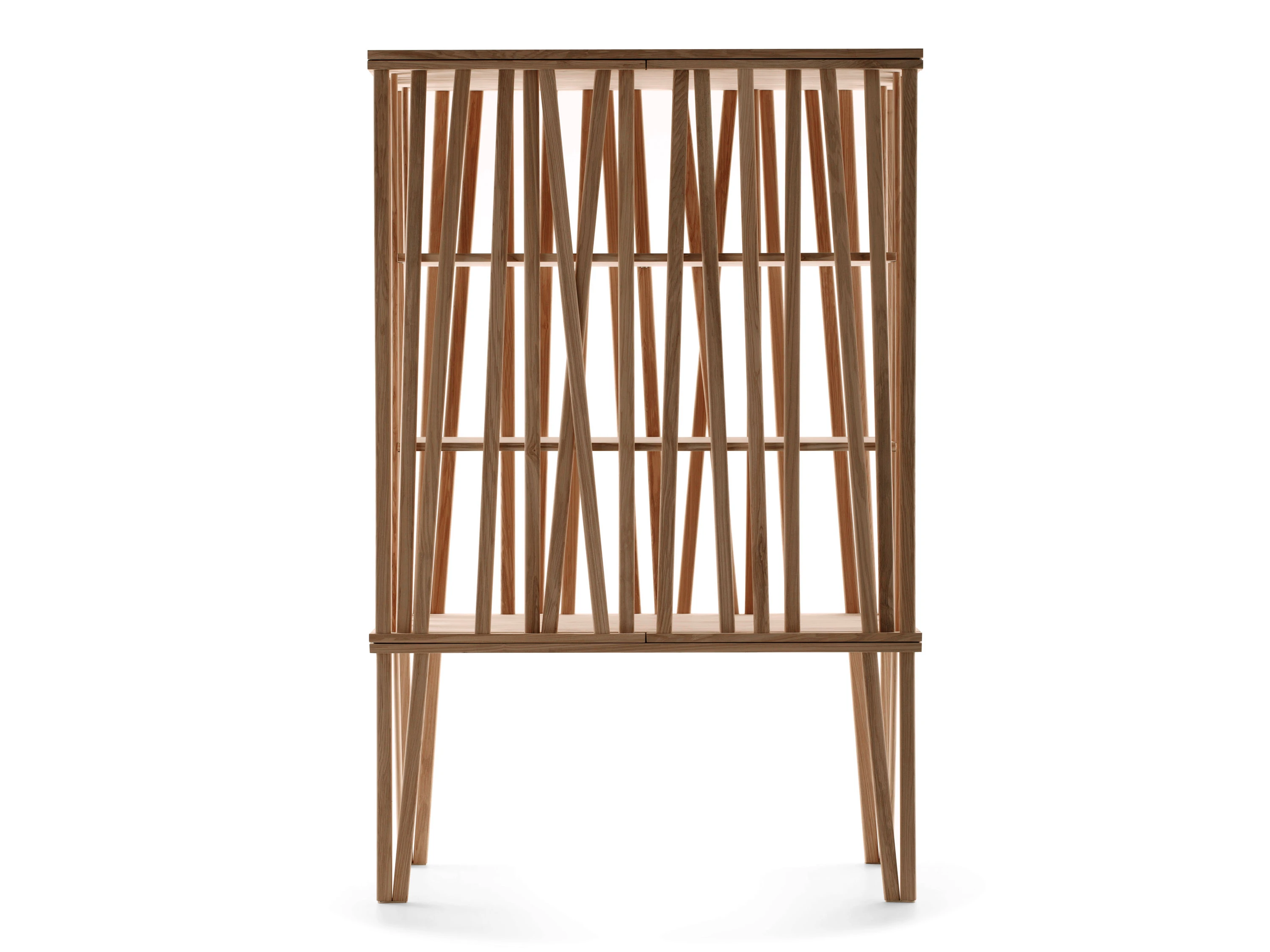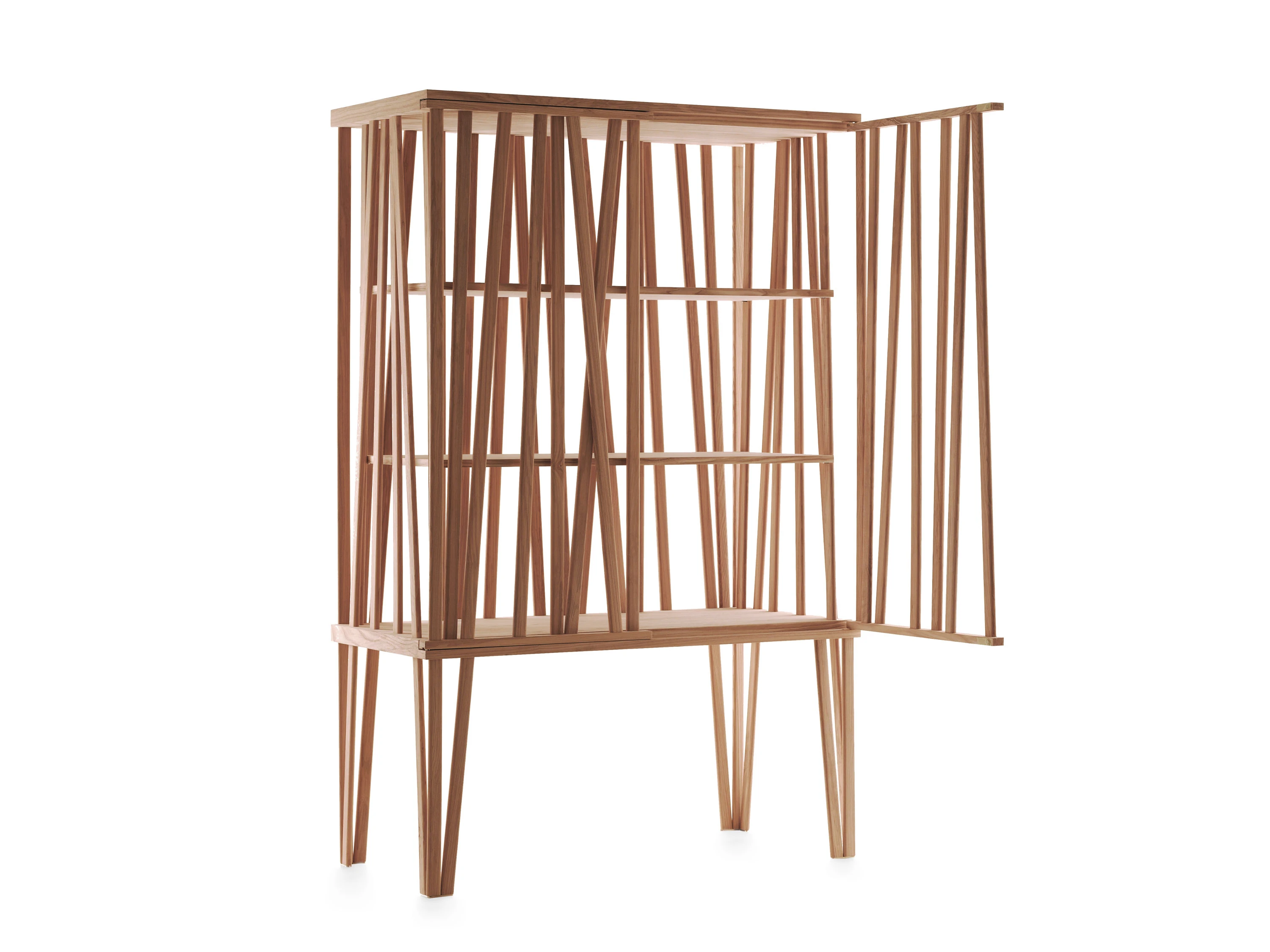 Mikado is a unit sideboard, ethereal and strongly exotic as well. It consists of a double layer of wood slates, bent and crossed allowing to see the inside, the Mikado unit is raised from the floor through a wood base unit, aesthetically light but structurally consistent. The sideboard is closed by two hinged door and can be used as room separator, perfectly finished on any side. Mikado is made in olive ash, a warm and light finish, to be used to furnish any room.