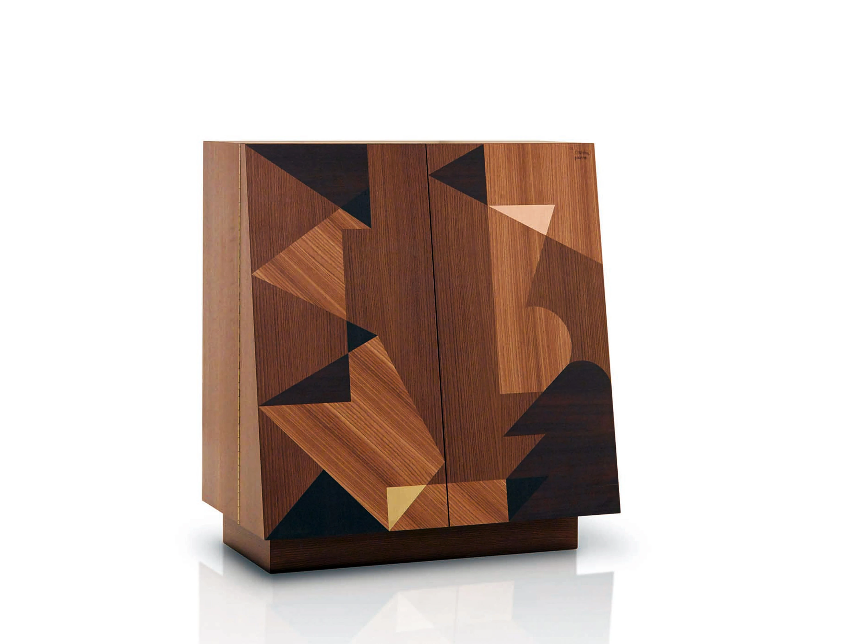 Schermo is a square cupboard on a base with a sloping hinged door. It is created with an inlaid design on the front, achieved by combining 3 different types of wood – elm, oak and acacia – according to abstract geometric compositions that meld the points of the triangle with the curved contours of the circle in unexpected directions. With a maple interior, pliable brass and copper elements and the unexpected three-dimensionality in its profile, Schermo belongs to a small limited-edition (99 pieces) series of exquisite and collectible furniture, between art and design.