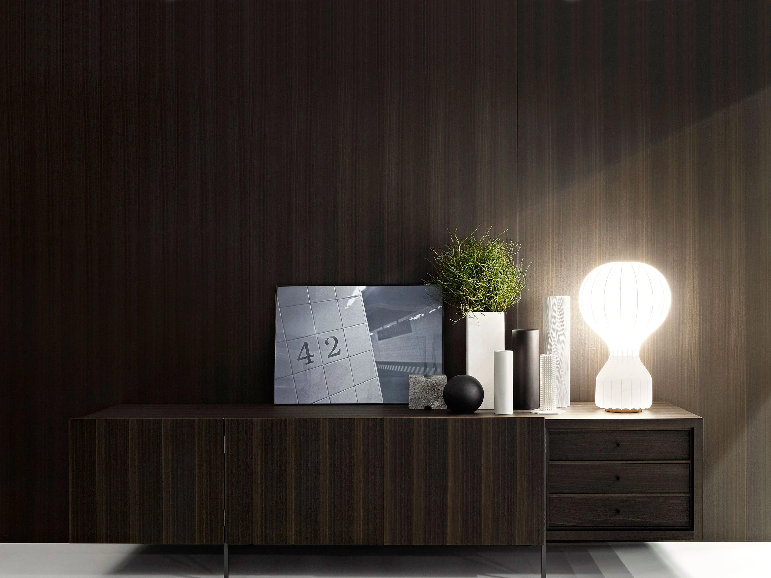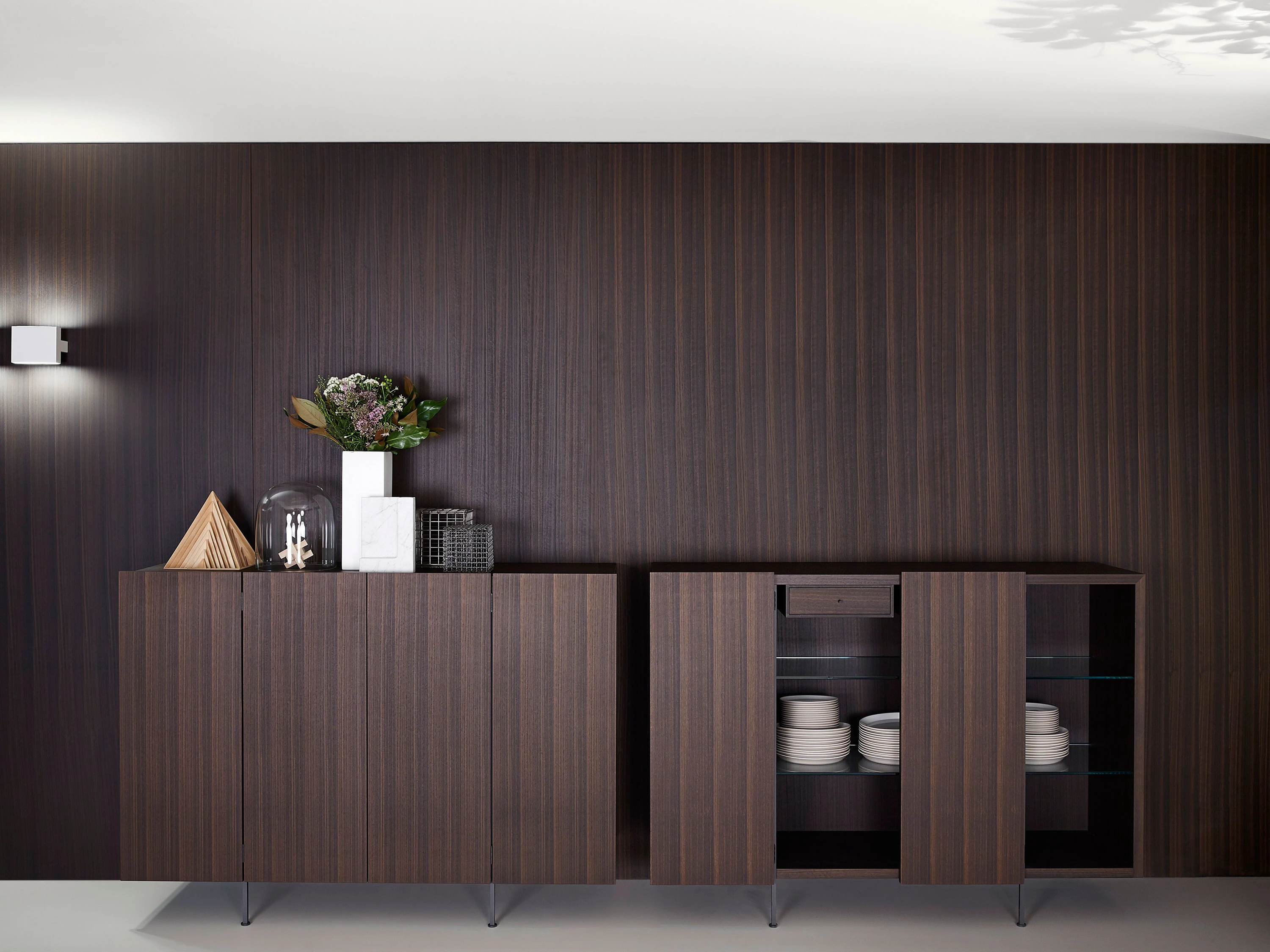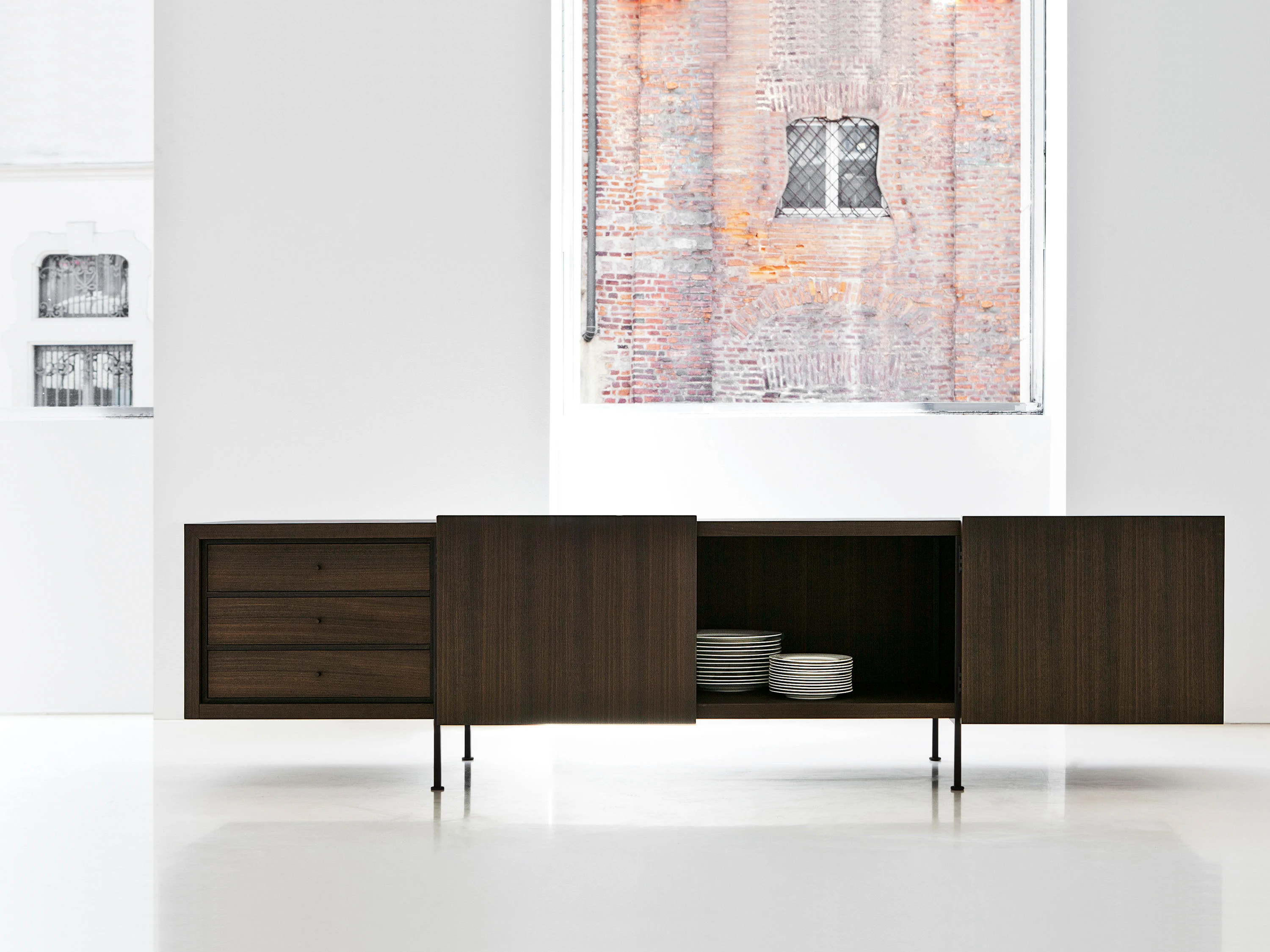The Tiller sideboard is available in two models, one vertical, 1600 mm long and the other horizontal, 2330 mm long. Tiller exhibits 4 doors to be opened, one over the other at 180°, a detail pleasantly changing its face design. Raised on 4 metal matt feet from the floor, the sideboard stands out once more for the brand technical expertise, able to test new opening systems and technologies. Tiller is made with an eucalyptus or palissandro santos structure and internal shelves in glass, and both models can be fitted with internal drawers in the same finish.