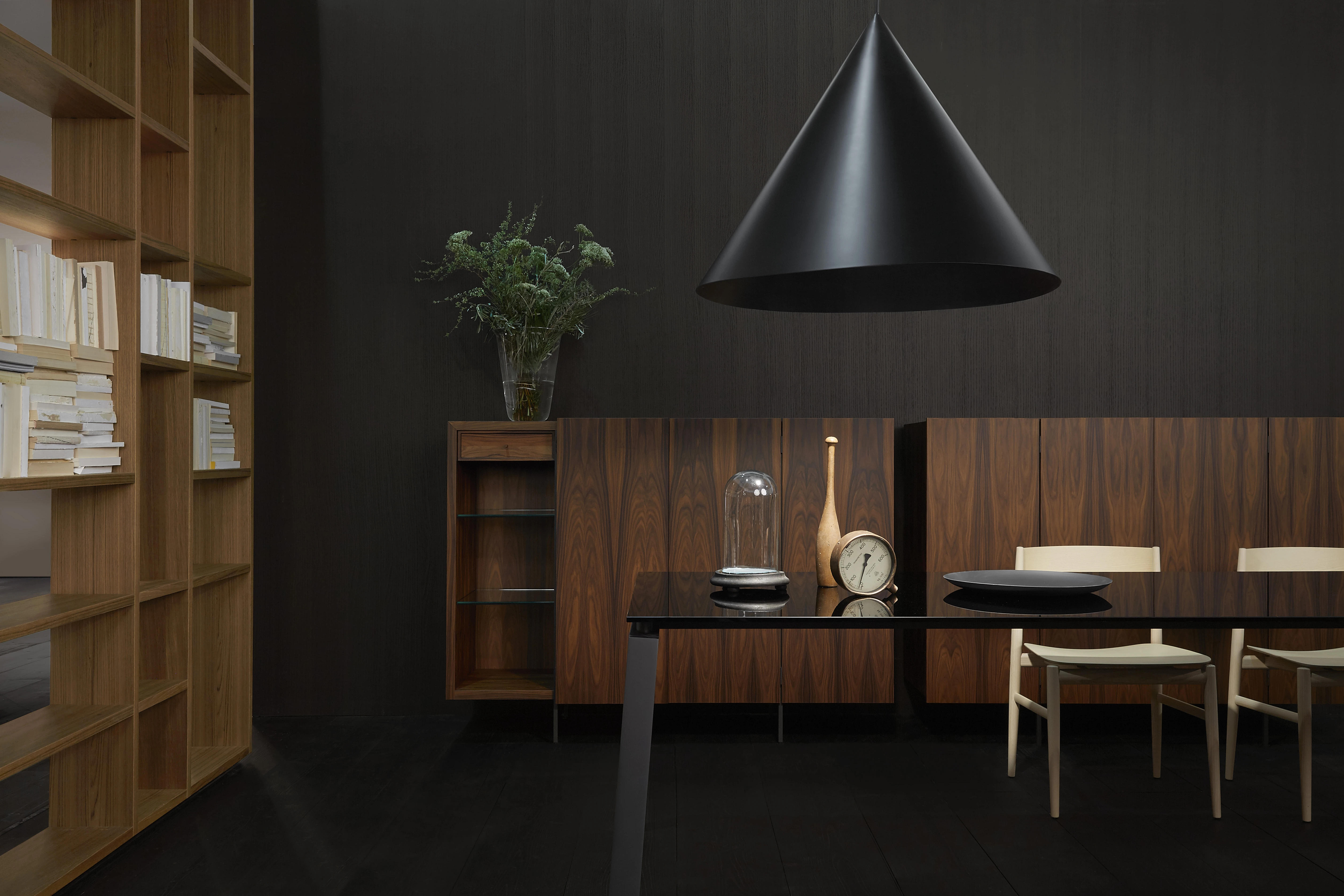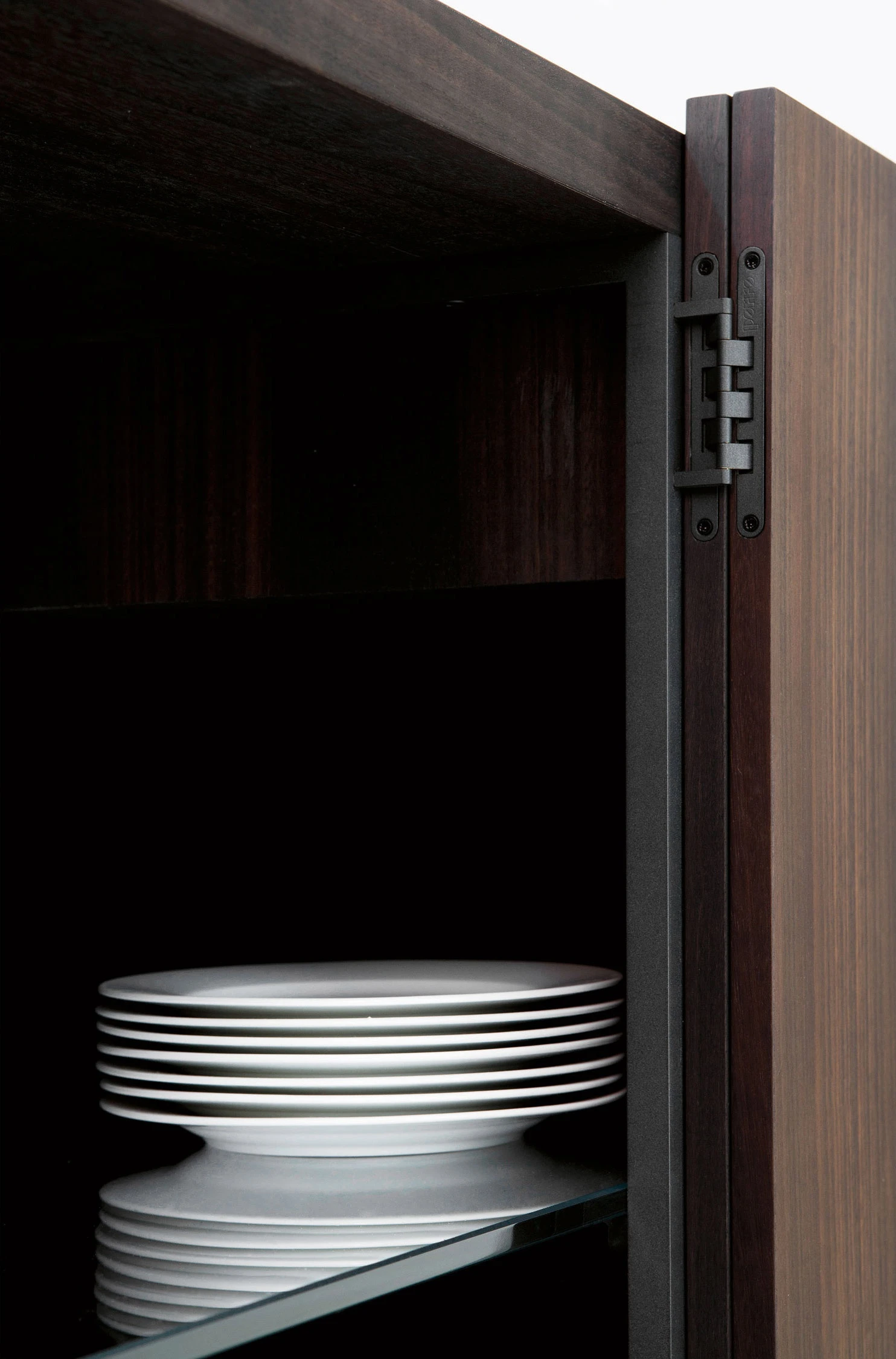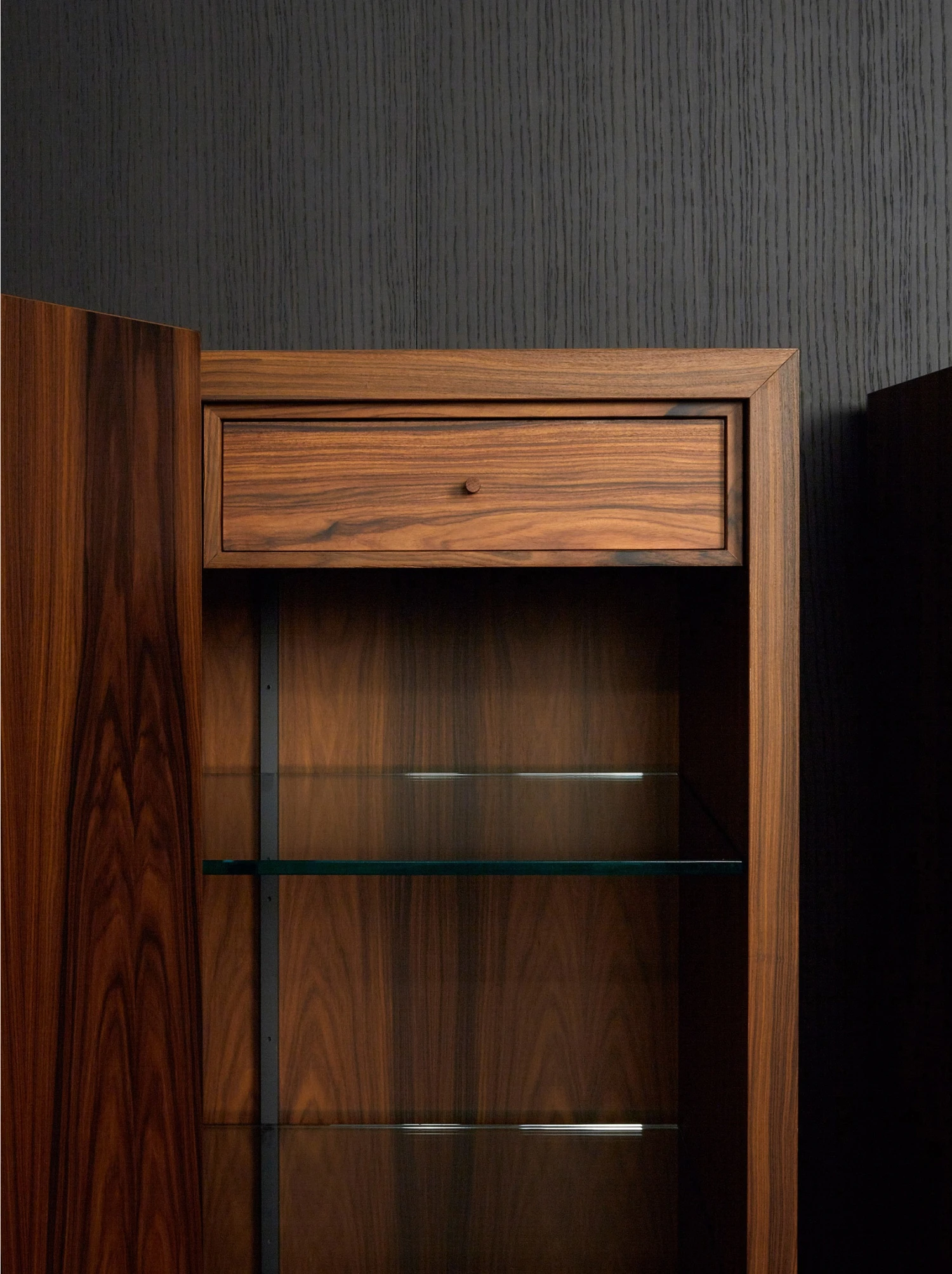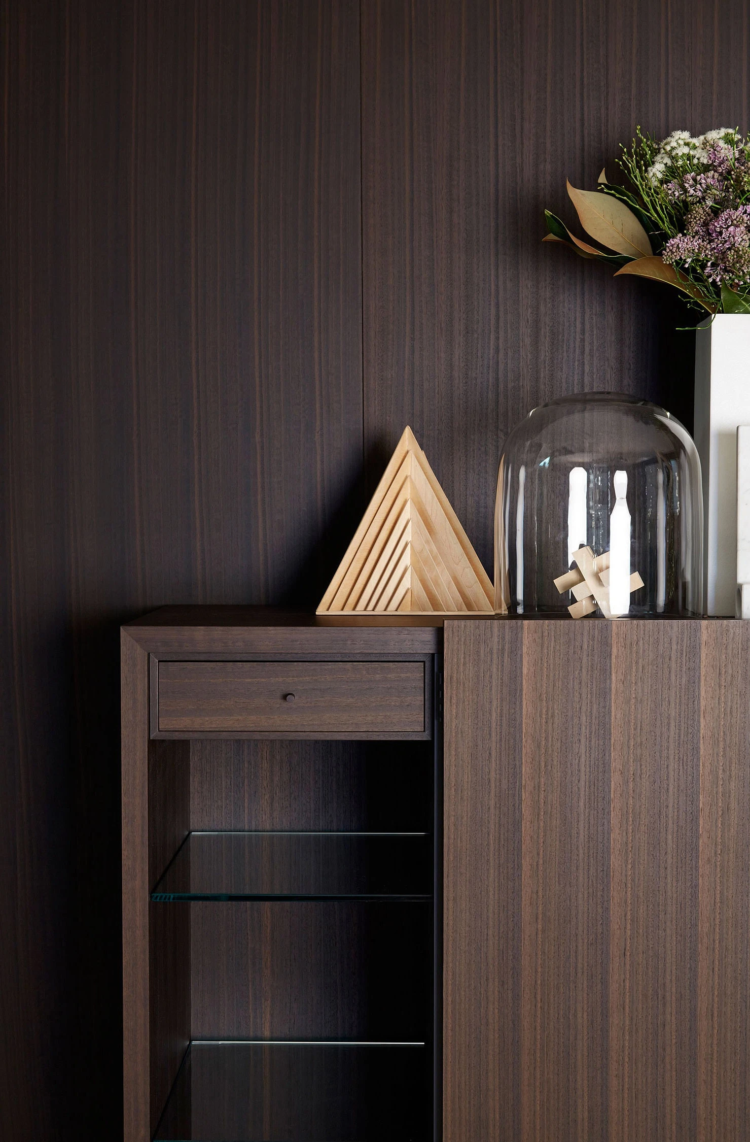 The Tiller sideboard is available in two models, one vertical, 1600 mm long and the other horizontal, 2330 mm long. Tiller exhibits 4 doors to be opened, one over the other at 180°, a detail pleasantly changing its face design. Raised on 4 metal matt feet from the floor, the sideboard stands out once more for the brand technical expertise, able to test new opening systems and technologies. Tiller is made with an eucalyptus or palissandro santos structure and internal shelves in glass, and both models can be fitted with internal drawers in the same finish.