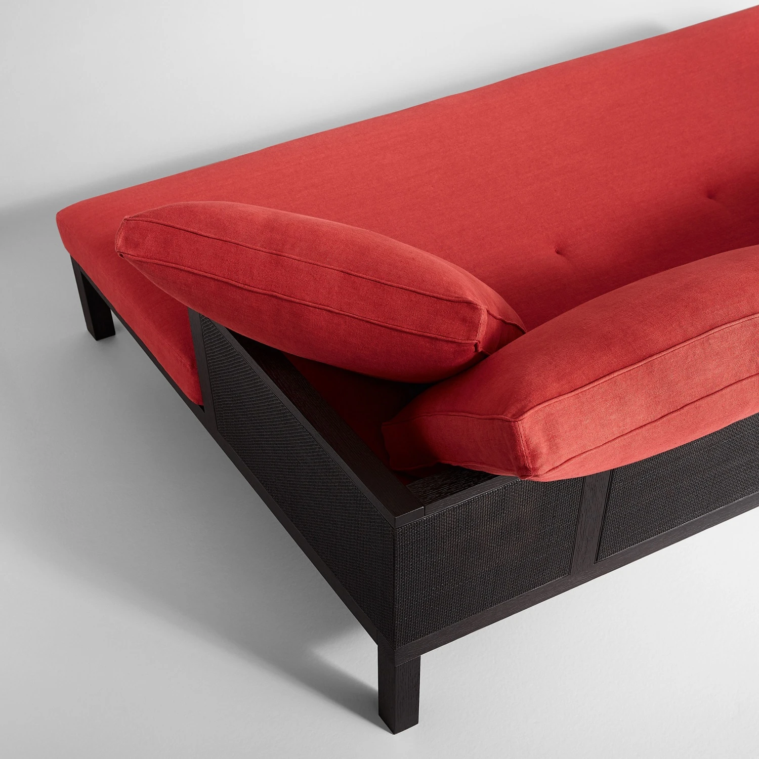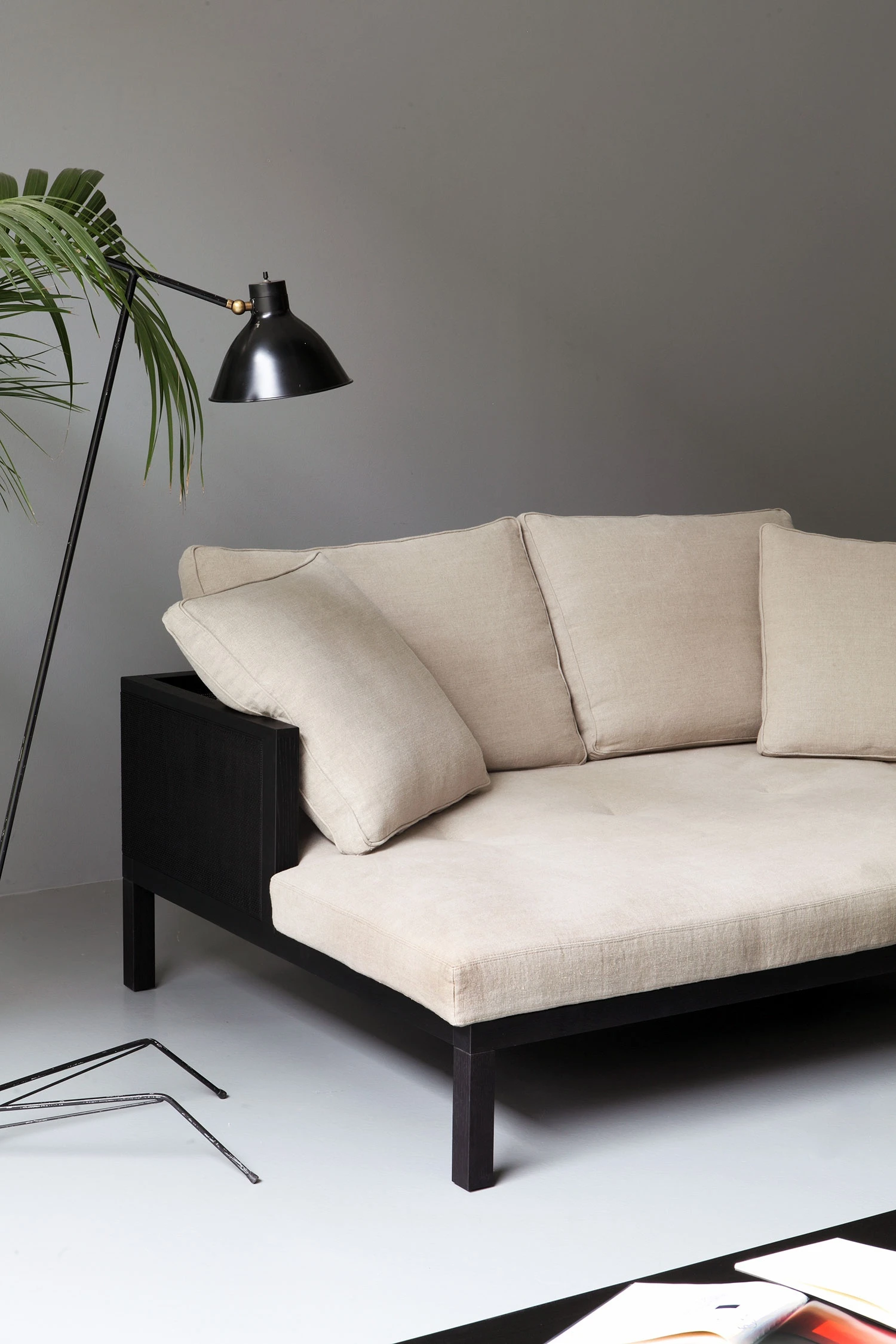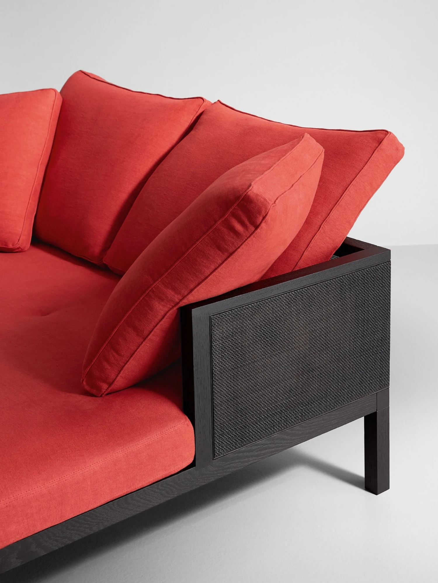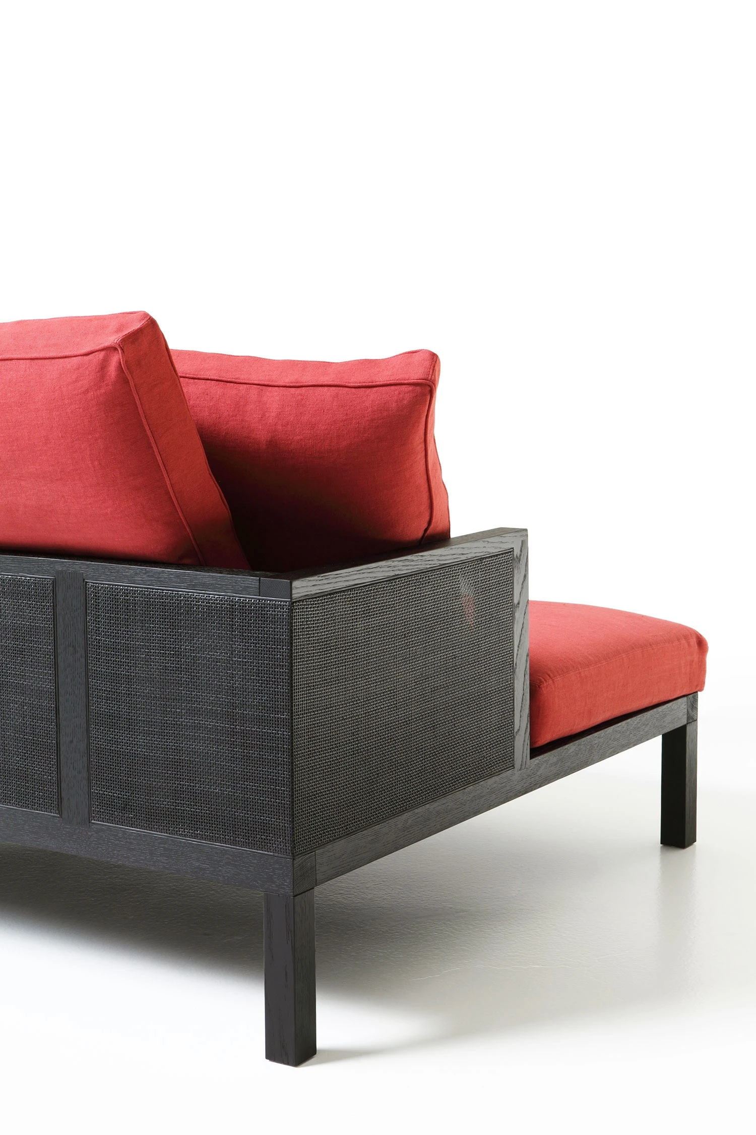 Curry by Piero Lissoni, available in sofa or daybad version, has a solid wood structure and intentionally exaggerated proportions. Its pleasantly distorted shape creates an asymmetrical seat that paves the way to new forms of relaxation. Curry has a sculptural silhouette with a strong graphic impact and features a precious design on the back and on the armrests made of black stained solid ash and woven straw stretched on the structure. It is an industrial piece of furniture with an artisan flavor that gives voice to the various creative languages of our time. The sofa is completed by a seat cushion with sown stitching and made of shaped polyurethane foam with variable density for greater comfort. The back is softened by two pairs of goose down cushions. The cover, available in fabric, leather, Nabuk or eco-leather, is fully removable, and finished with visible seams.
